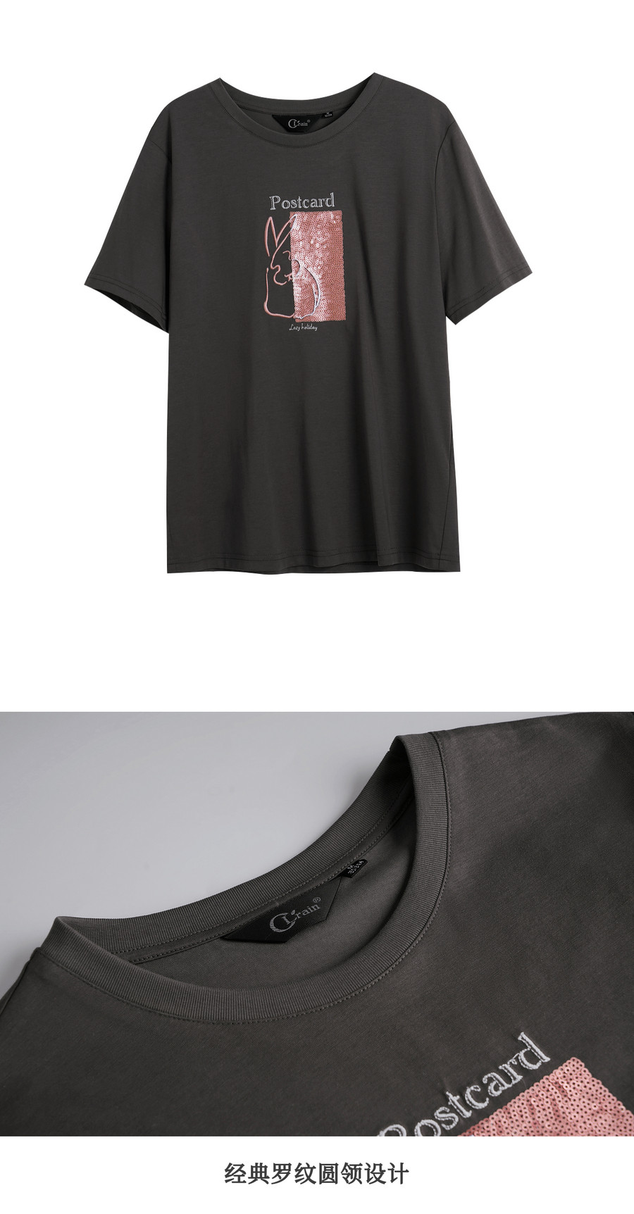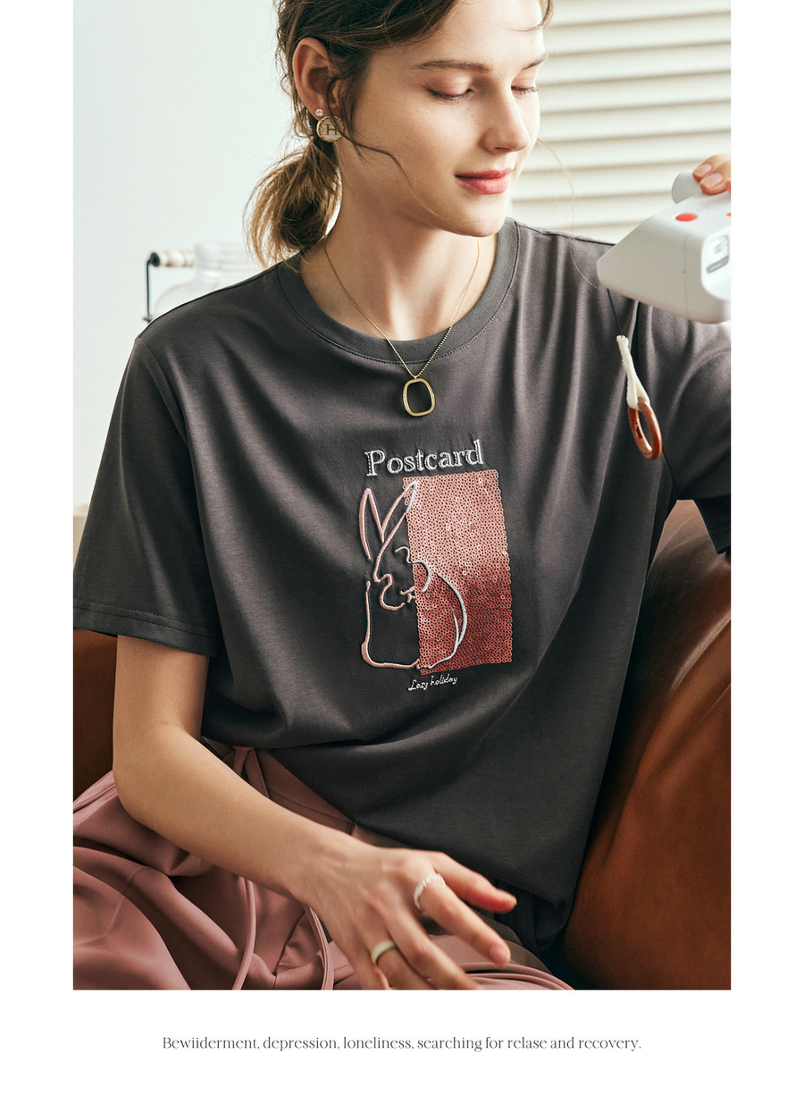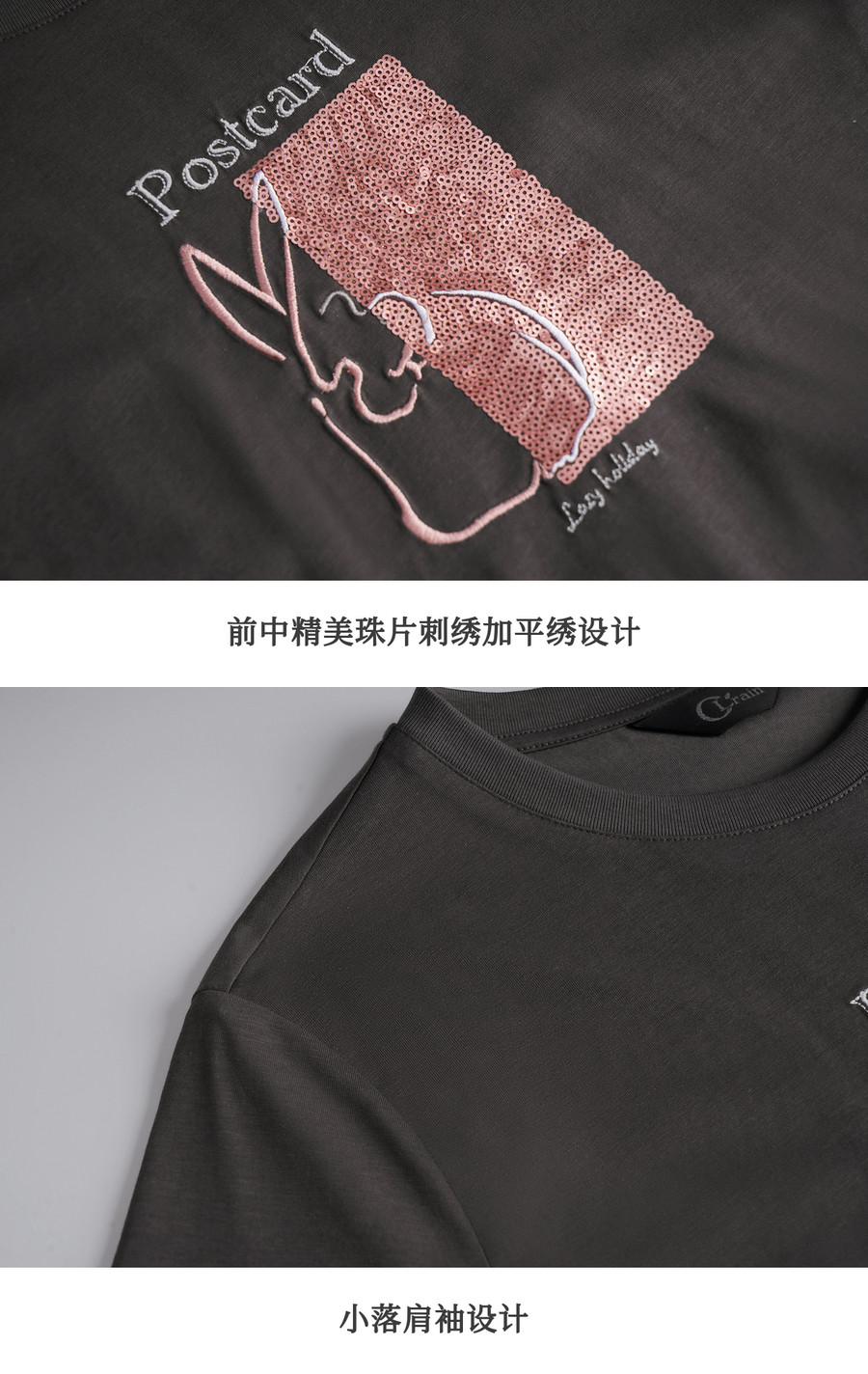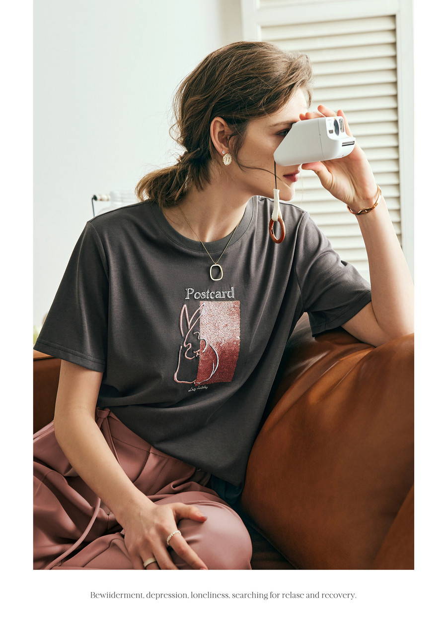 欧芮儿2026年新款夏季圆领灰色精美珠片绣设计休闲宽松短袖T恤女
