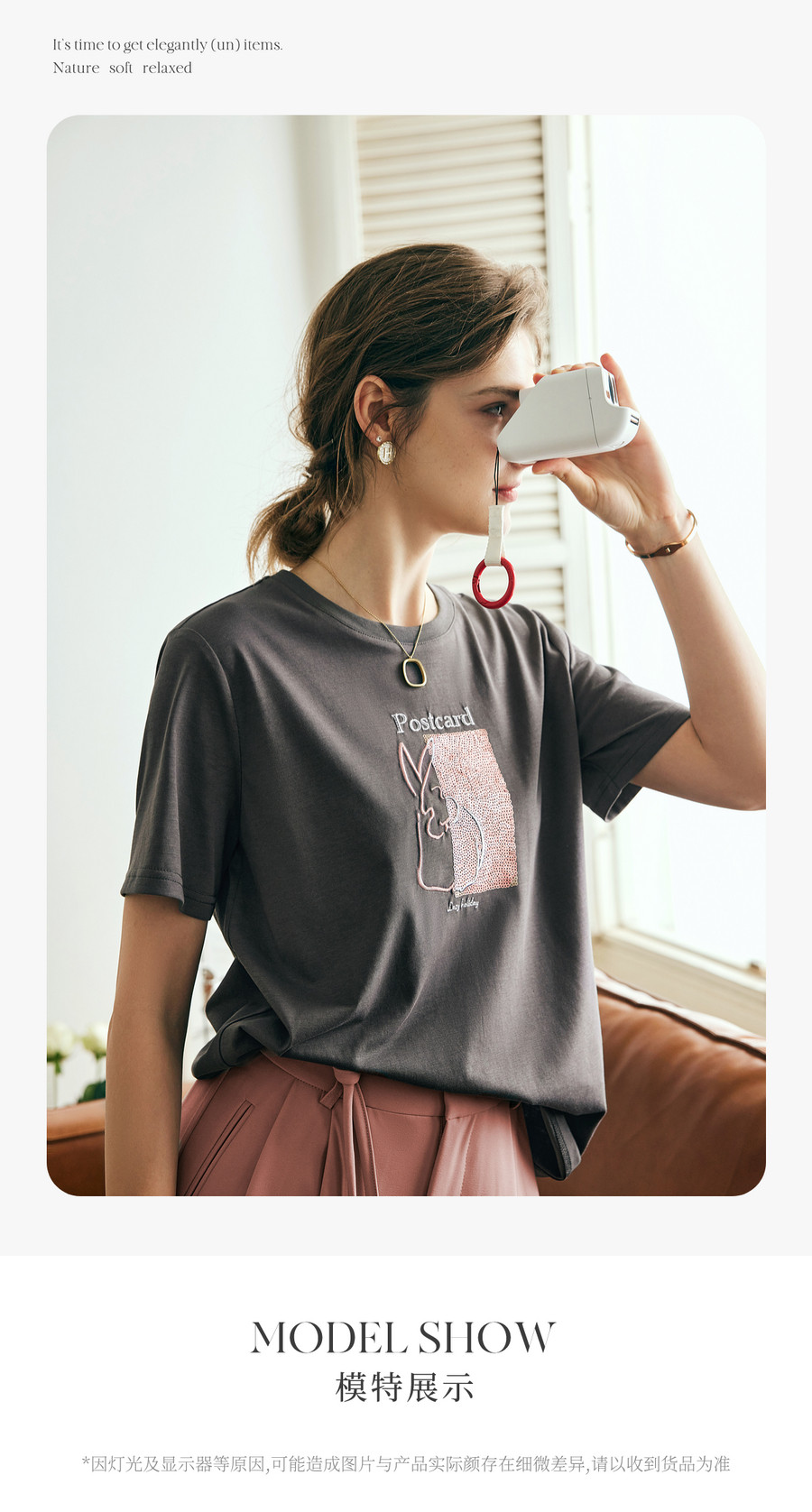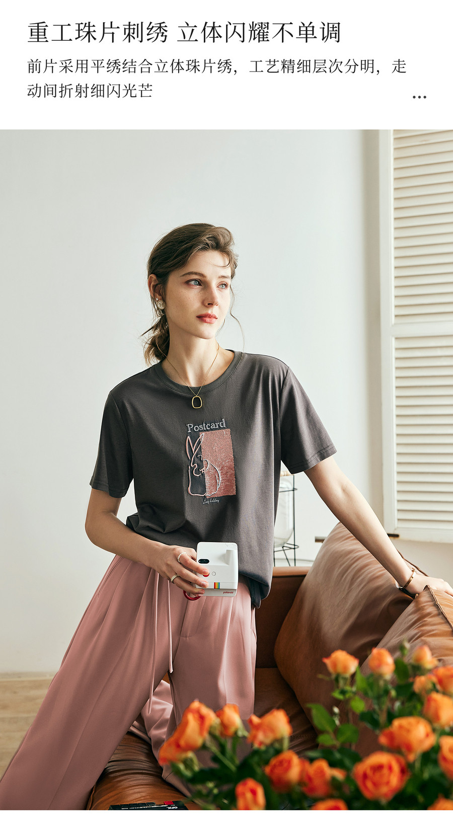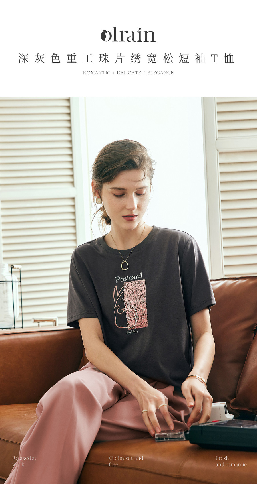 欧芮儿2026年新款夏季圆领灰色精美珠片绣设计休闲宽松短袖T恤女