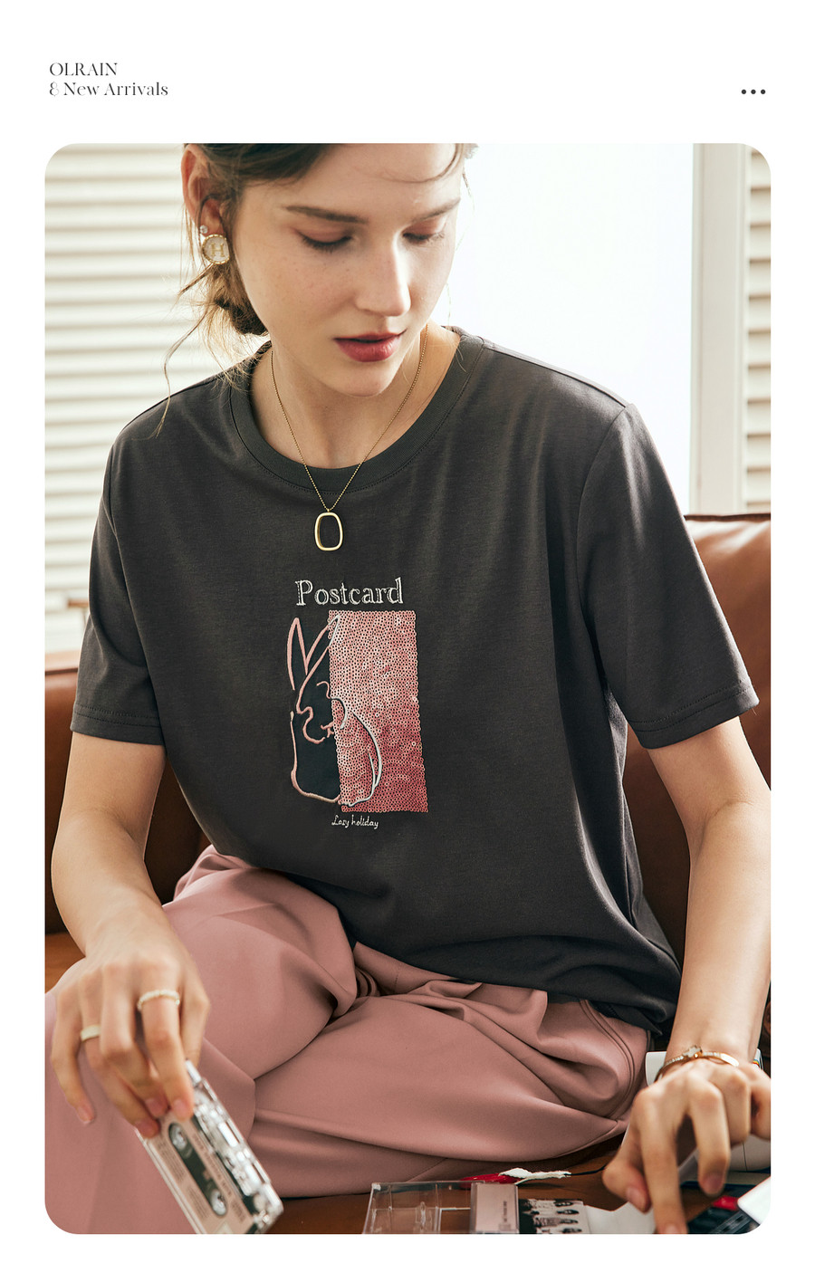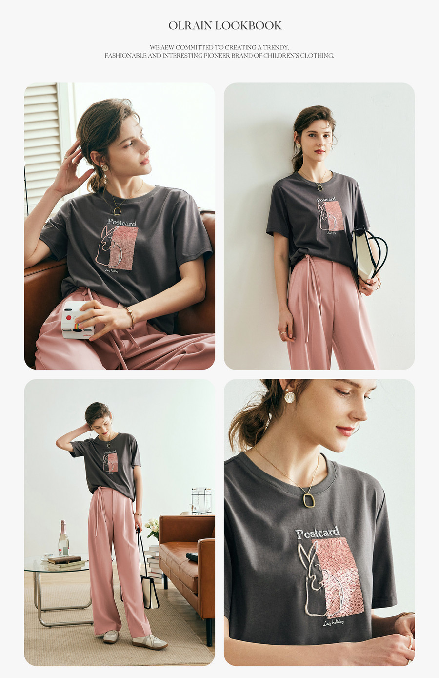 OLrain欧芮儿灰色短袖T恤女春季2025新款高级感通勤趣味刺绣上衣