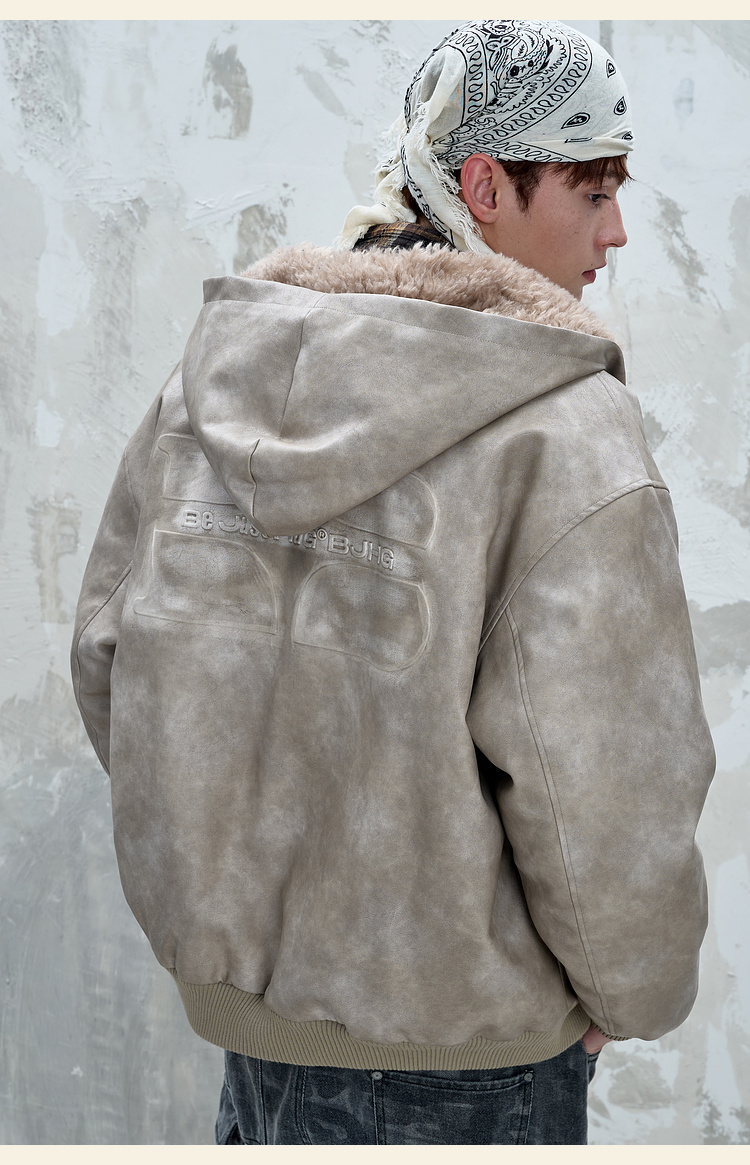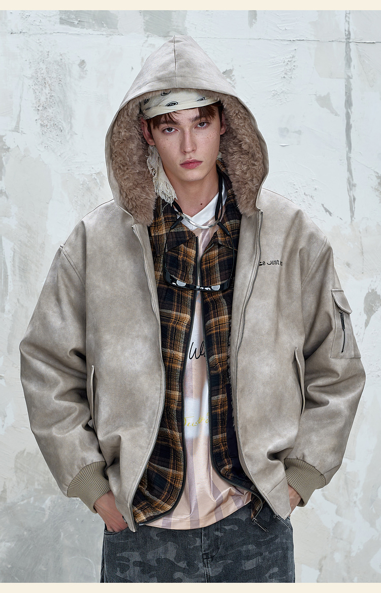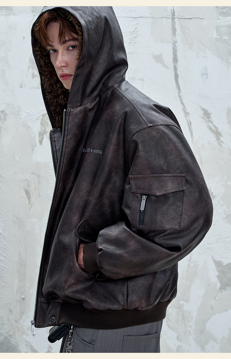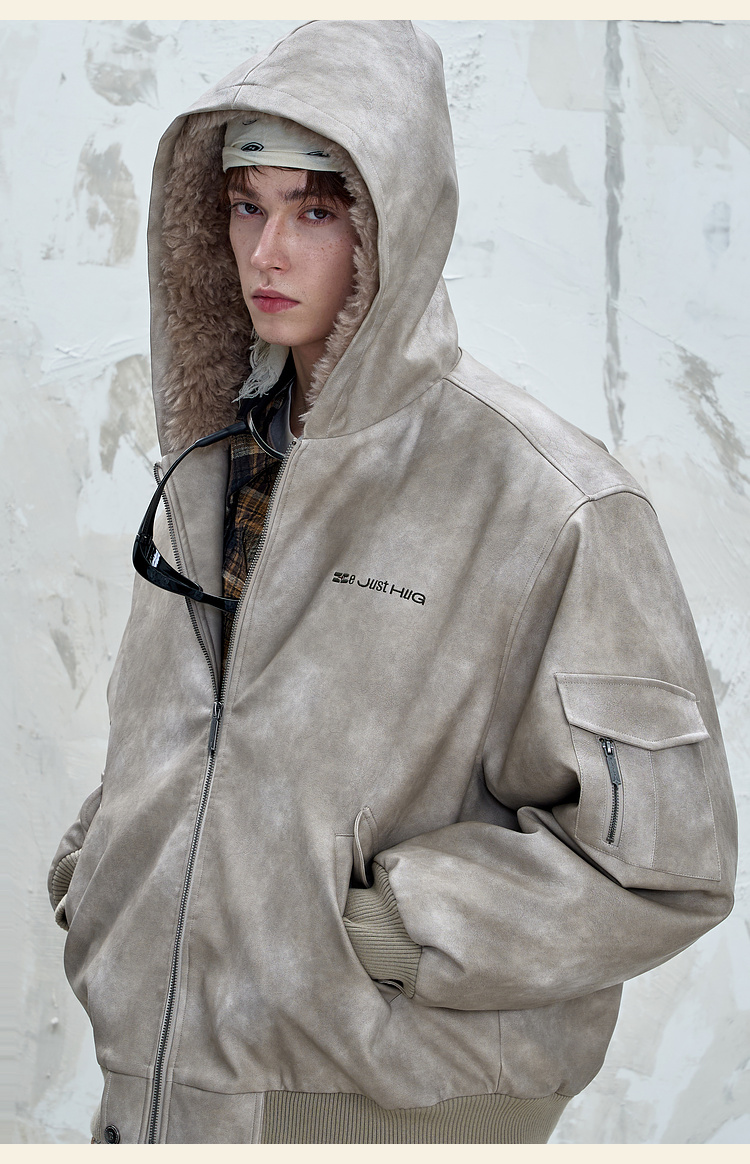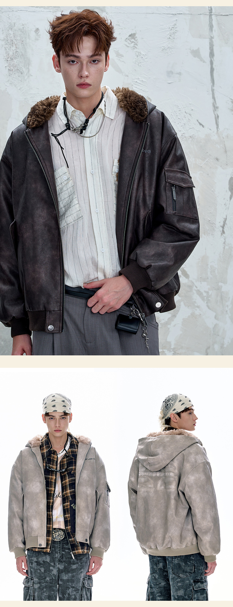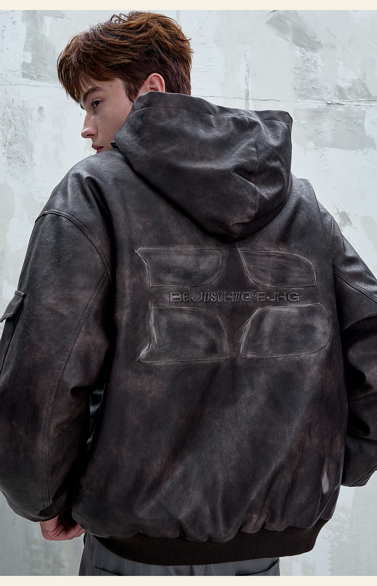 BJHG不计后果做旧PU皮飞行夹克棉服男款秋冬季复古连帽机能风外套