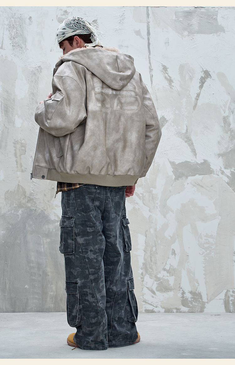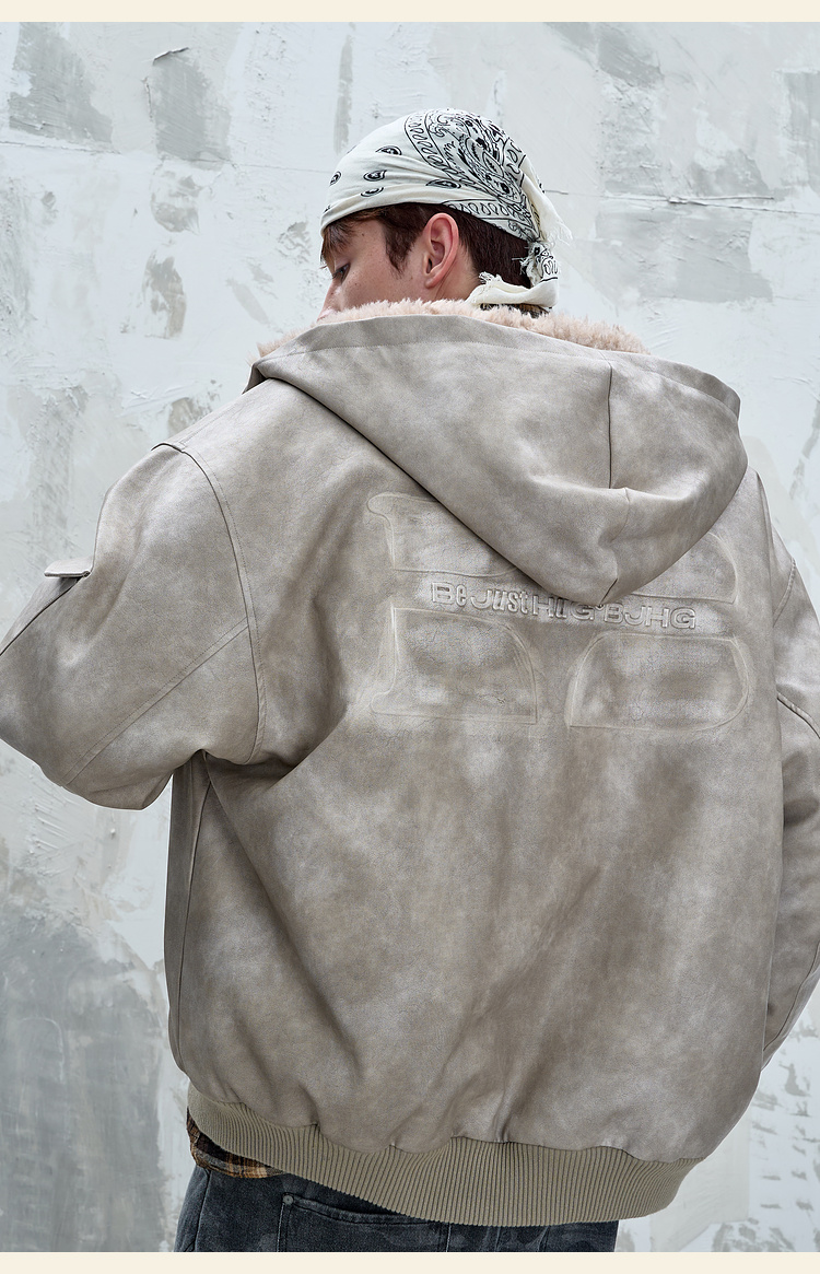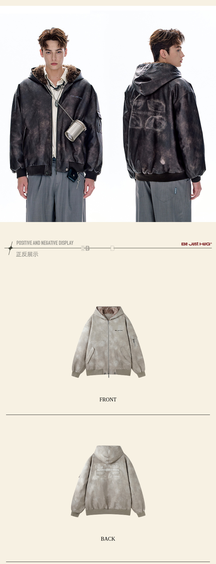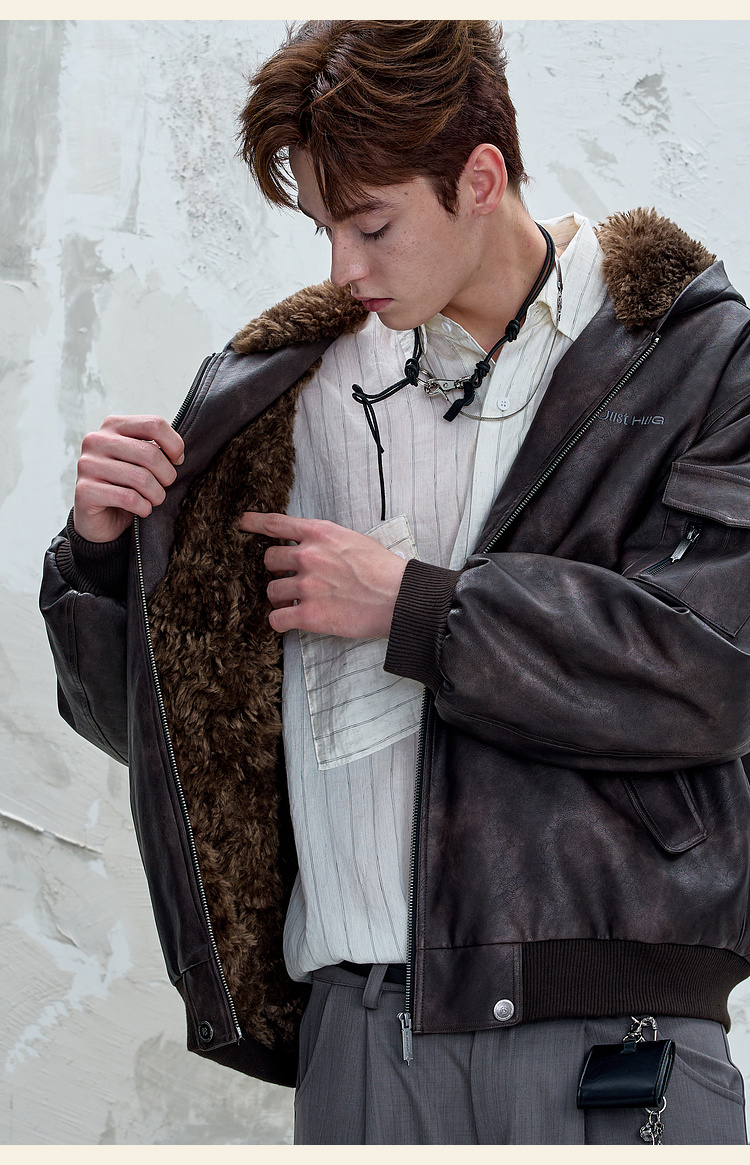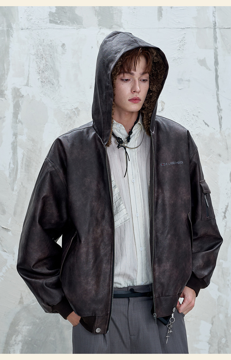 BJHG不计后果做旧PU皮飞行夹克棉服男款秋冬季复古连帽机能风外套