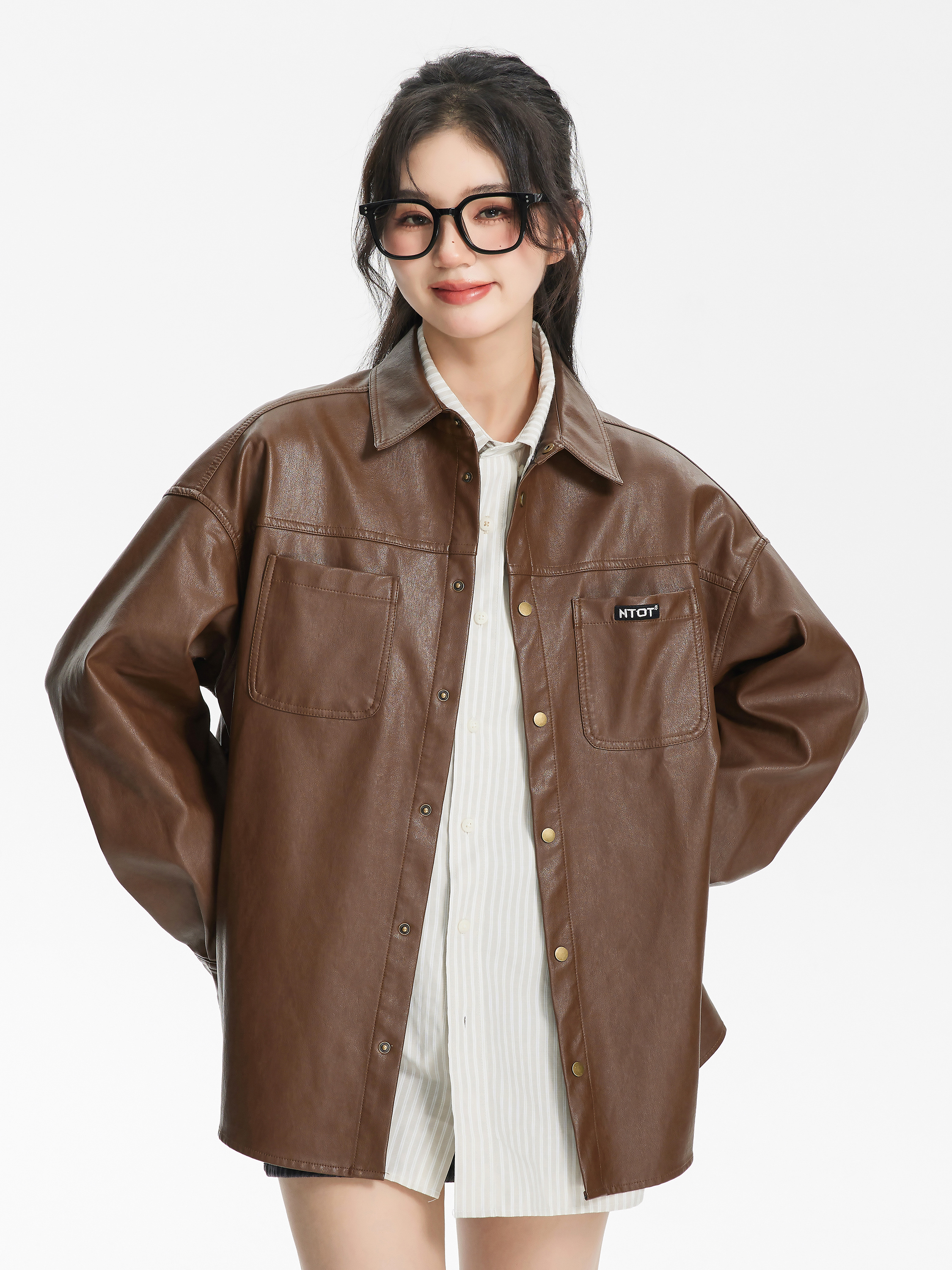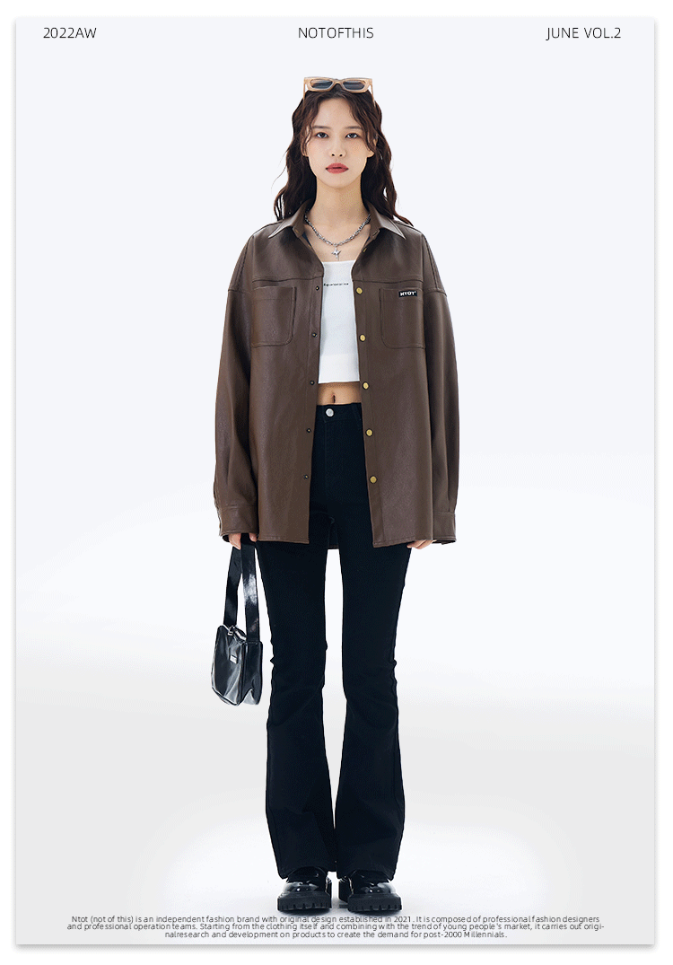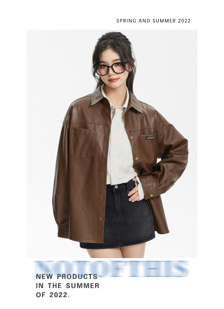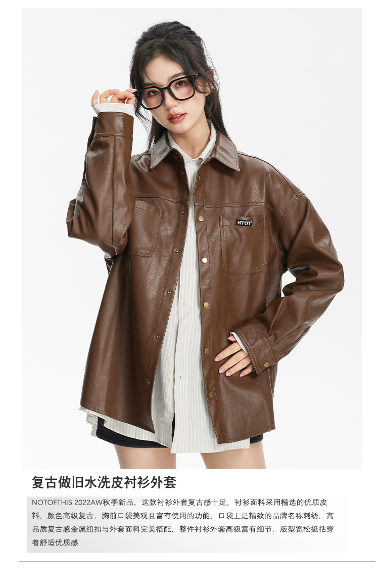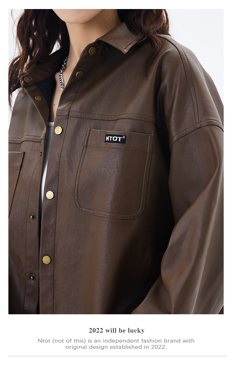 NTOT/NOTCS22159/中性咖色复古做旧水洗皮衬衫外套