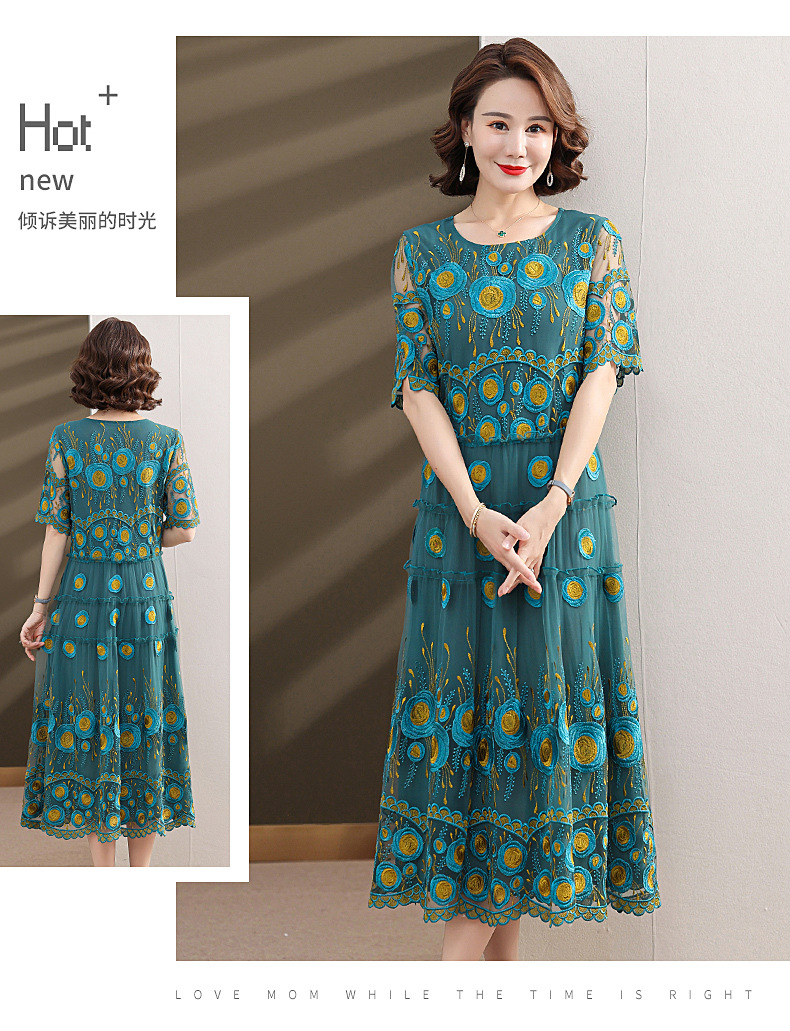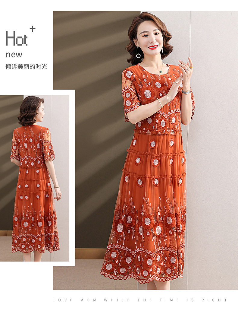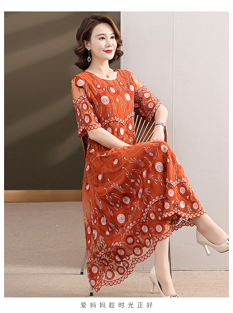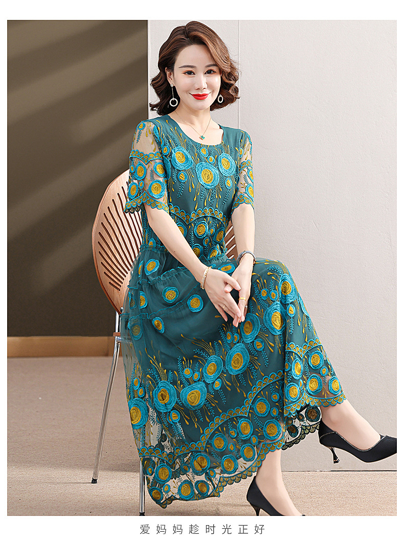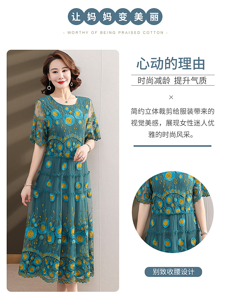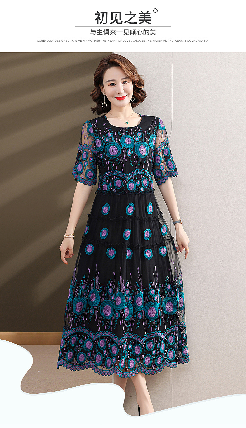 中年妈妈绣花蕾丝连衣裙女2023新款夏季中老年洋气过膝裙子50大码QX-W24