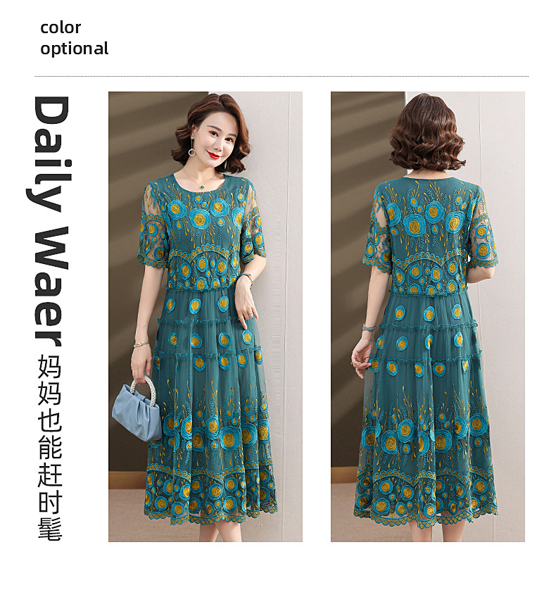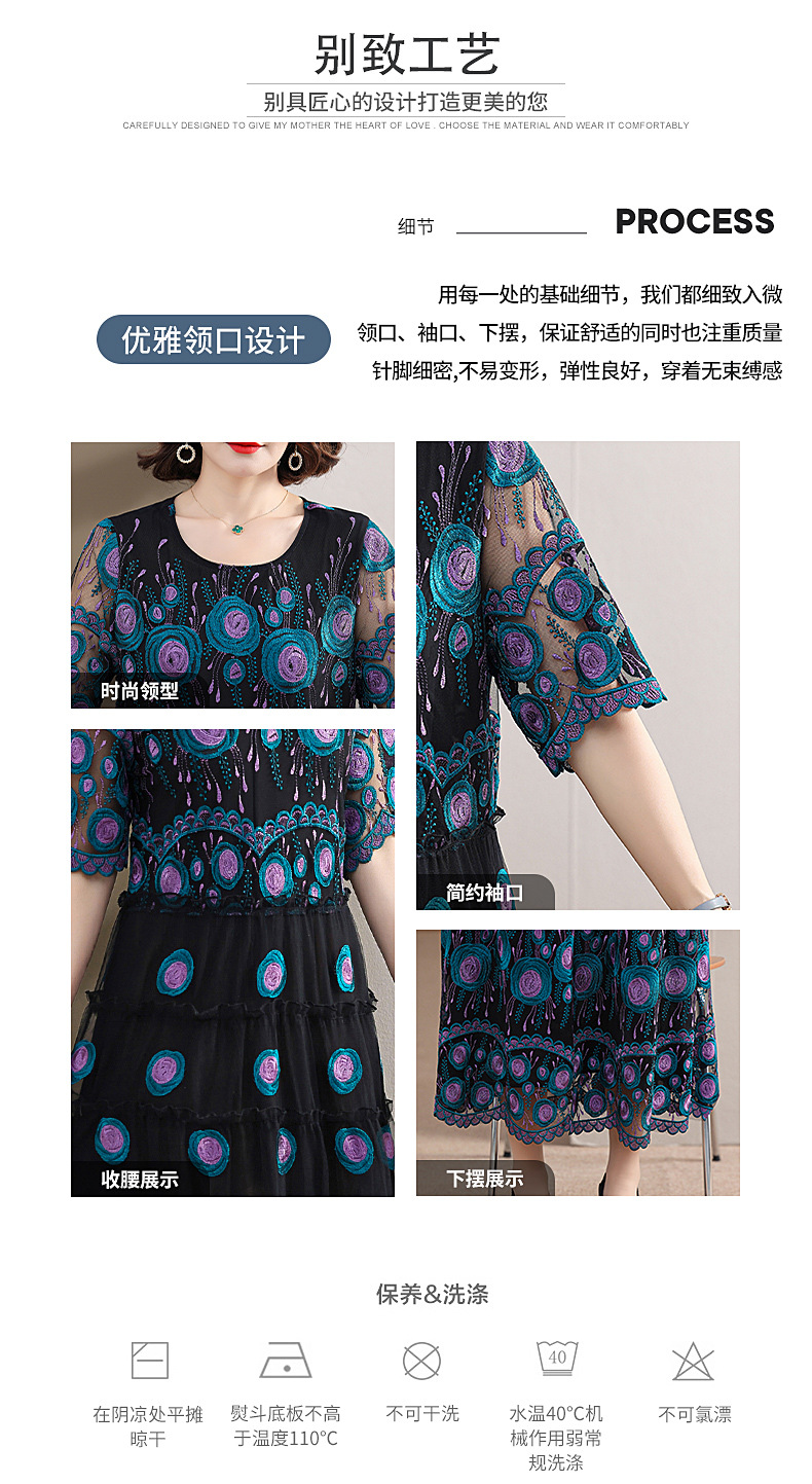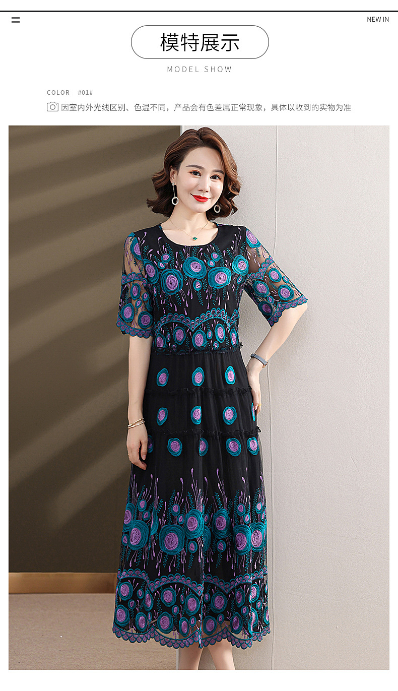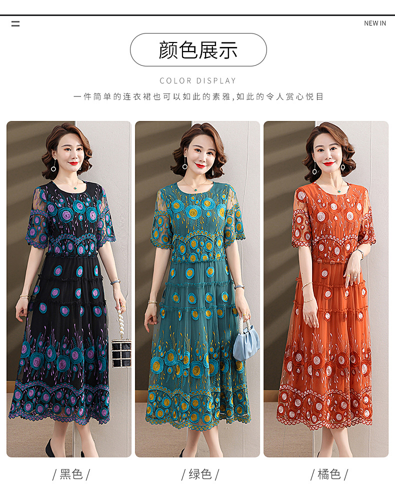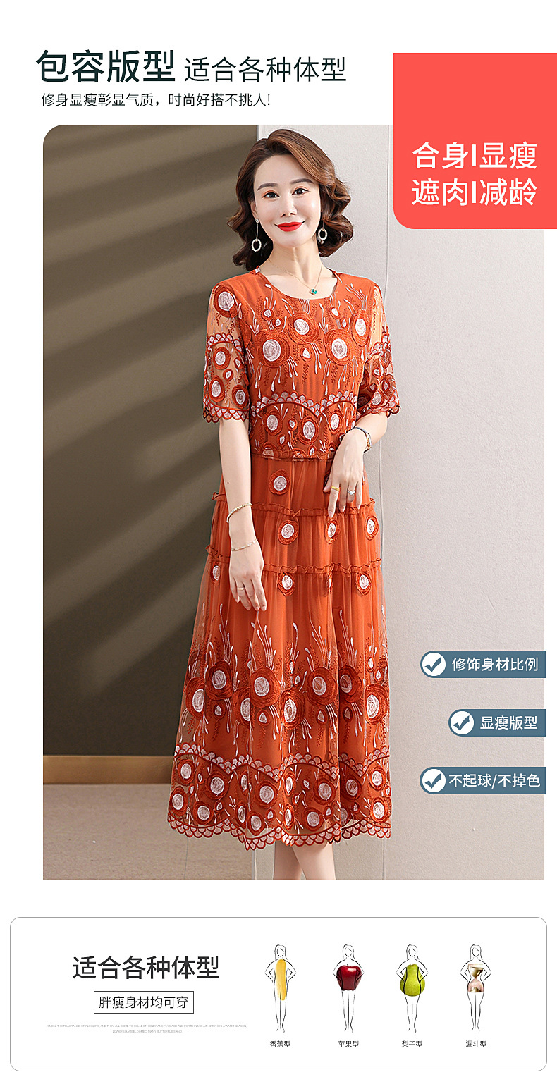 中年妈妈绣花蕾丝连衣裙女2023新款夏季中老年洋气过膝裙子50大码QX-W24