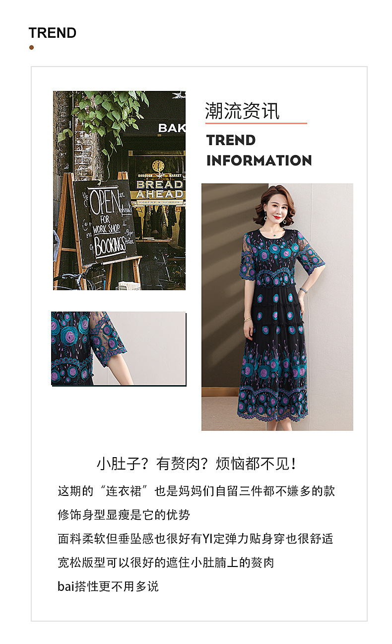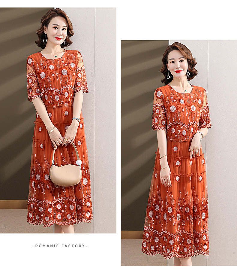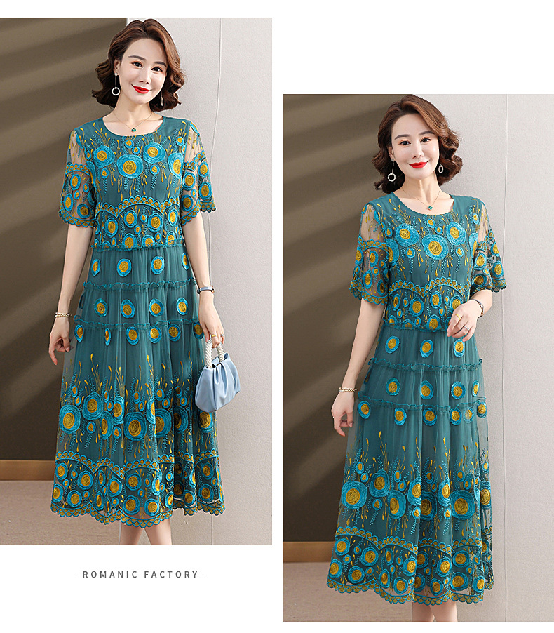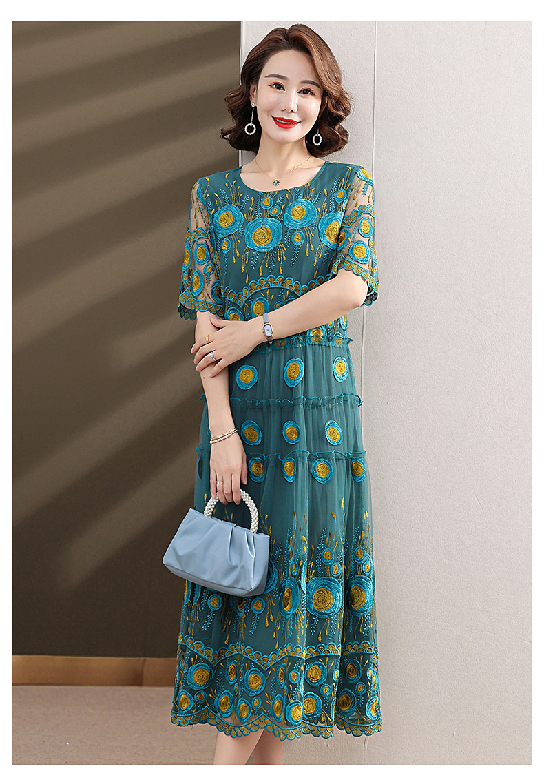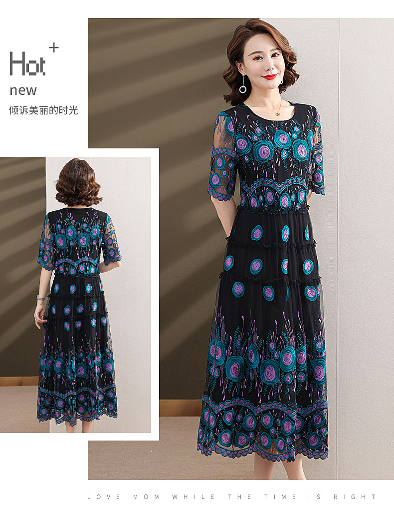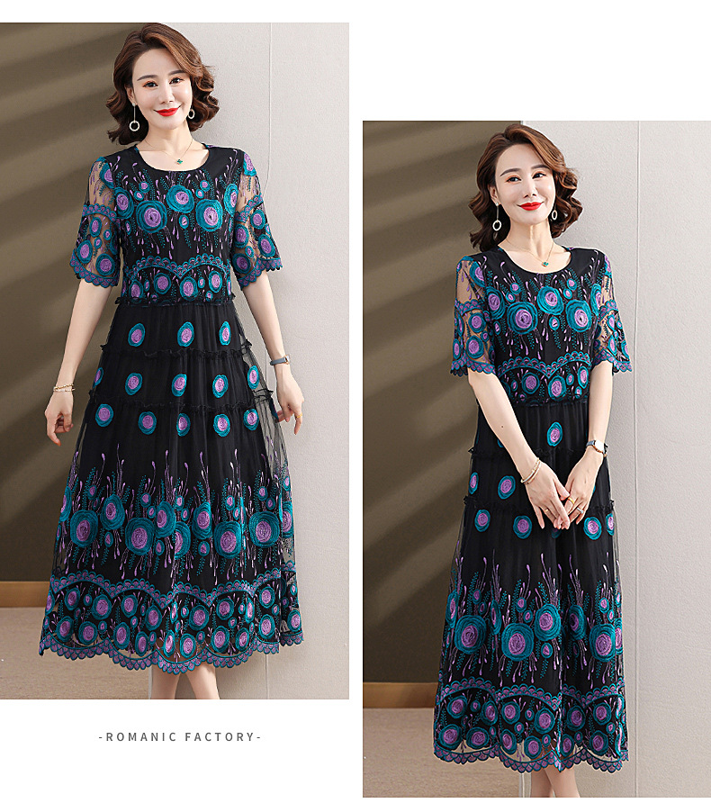 中年妈妈绣花蕾丝连衣裙女2023新款夏季中老年洋气过膝裙子50大码QX-W24