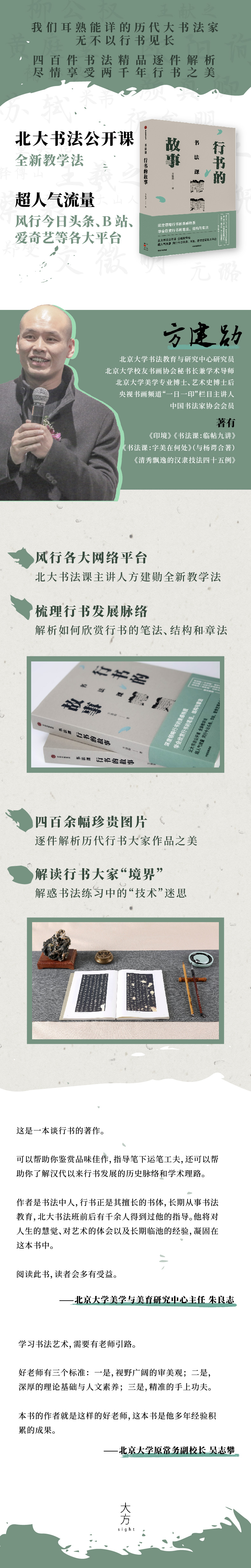 本书为方建勋老师编写的书法课程教材,全书从行书的发展,演变到代表书法家的作品,详细讲述了行书这一重要书法的历史,从而呈现了行书在不同历史阶段的价值和意义。文笔通畅朴实,生动有趣,同时配有丰富的图例,操作性强,适合青少年阅读和学习。作者认为,书法的书写,根本是人的心意情性的舒展与表达。如果太注重华丽的衣装,看重形式过于内在,技法大于人的表达,则很有可能走向形式主义,本末倒置,失去书法的“灵魂”。经常回顾早期的行书,直面早期书写的率真与直接,正可以让今天的我们在精雕细琢技法时,警醒自己不会忘本,不会掉进“技法至上”的深渊。