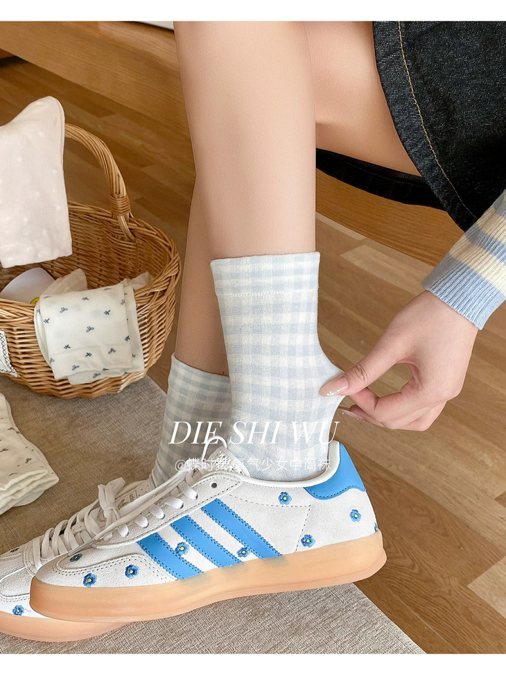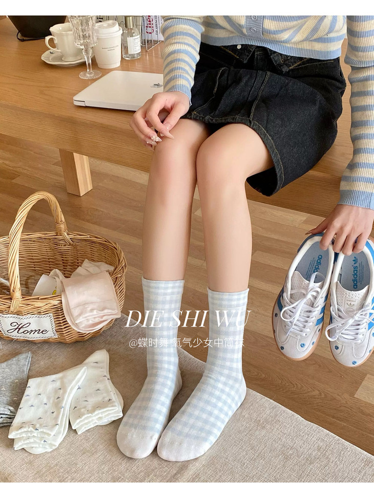 温柔到骨子里的少女感中筒袜💘 这组中筒袜也太懂少女心了! 奶白底色上的小碎花像把春天的樱瓣织进棉线,浅灰爱心款甜而不腻 奶粉纯色软乎乎的,蓝白格纹清清爽爽。卷边设计刚好衬出脚踝纤细 软得像云朵,贴在皮肤上连呼吸都变轻。搭白衬衫、牛仔裙、帆布鞋都好看,温柔到骨子里的少女感直接拉满!