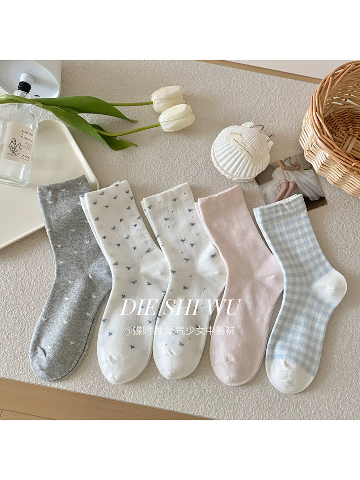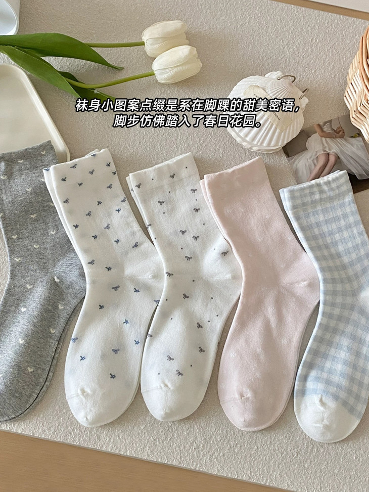 软fufu的春日袜子女神套装🌸 软fufu的春天从一双好袜子开始! 这组中筒袜每一双都像云朵裹在脚上:浅灰爱心甜而不腻,奶白碎花温柔治愈 奶粉纯色软糯到心化,蓝白格纹清清爽爽。棉质面料透气不闷脚 卷边不勒腿还能修饰腿型,搭小皮鞋、帆布鞋、乐福鞋都好看,软fufu的春日氛围感直接拉满!