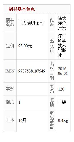 篇总论/11 下大肠切除术的术前准备/12 第二篇各论/17 章右半结肠切除术:先行后腹膜游离的内侧入路[下方入路(inferiorapproach)]/18 第二章右半结肠切除术:内侧入路法/34 第三章横结肠切除术/51 第四章左半结肠切除术/60 第五章乙状结肠切除术/68 第六章直肠低位前切除术/82 第七章消化道重建体外操作:功能性端端吻合/94 第八章消化道重建体外操作:三角吻合/98 第九章消化道重建体外操作:经肛门手工吻合[经括约肌间切除(intersphinctericresection,ISR)]/104 第十章消化道重建体内操作:DST[双吻合技术(doublestaplingtechnique)]/108 第十一章消化道重建体内操作:翻转DST(doublestaplingtechnique)吻合/112 索引/120 |