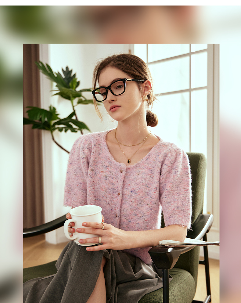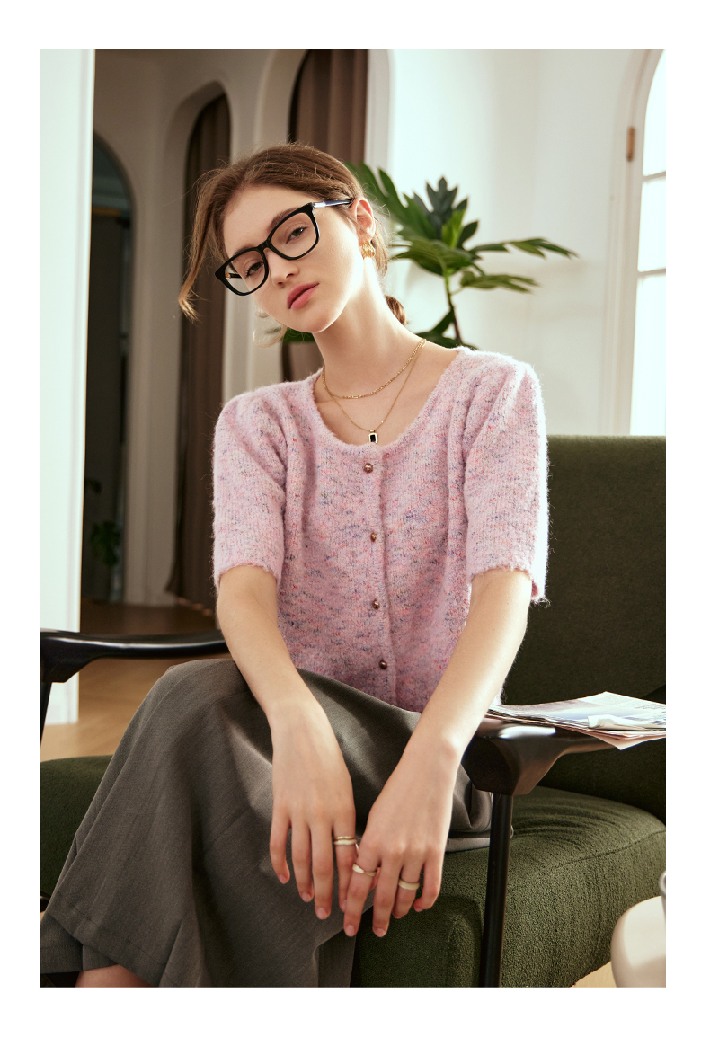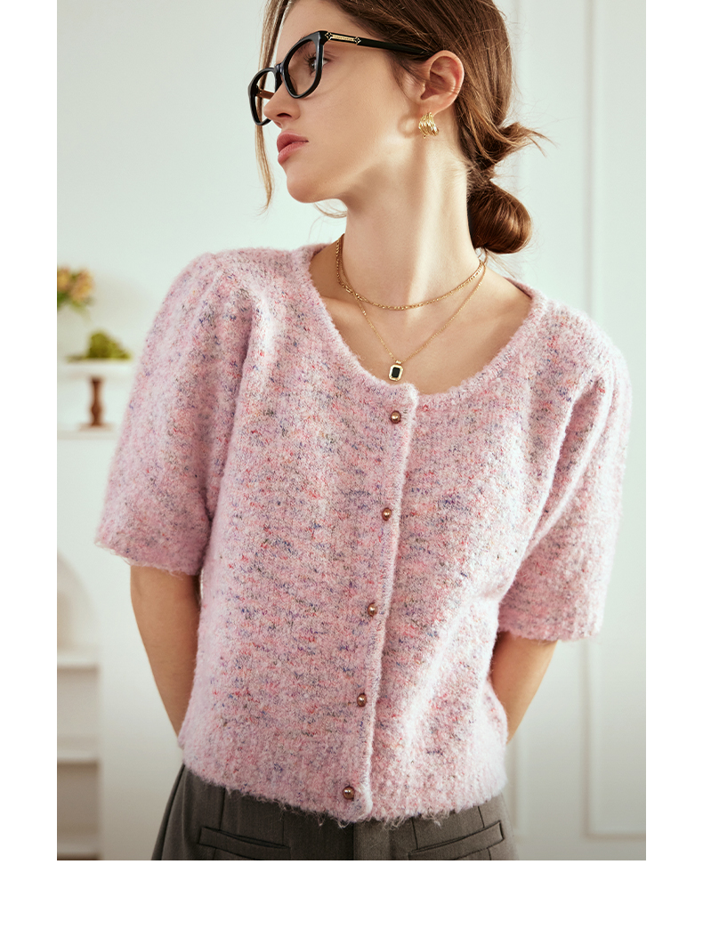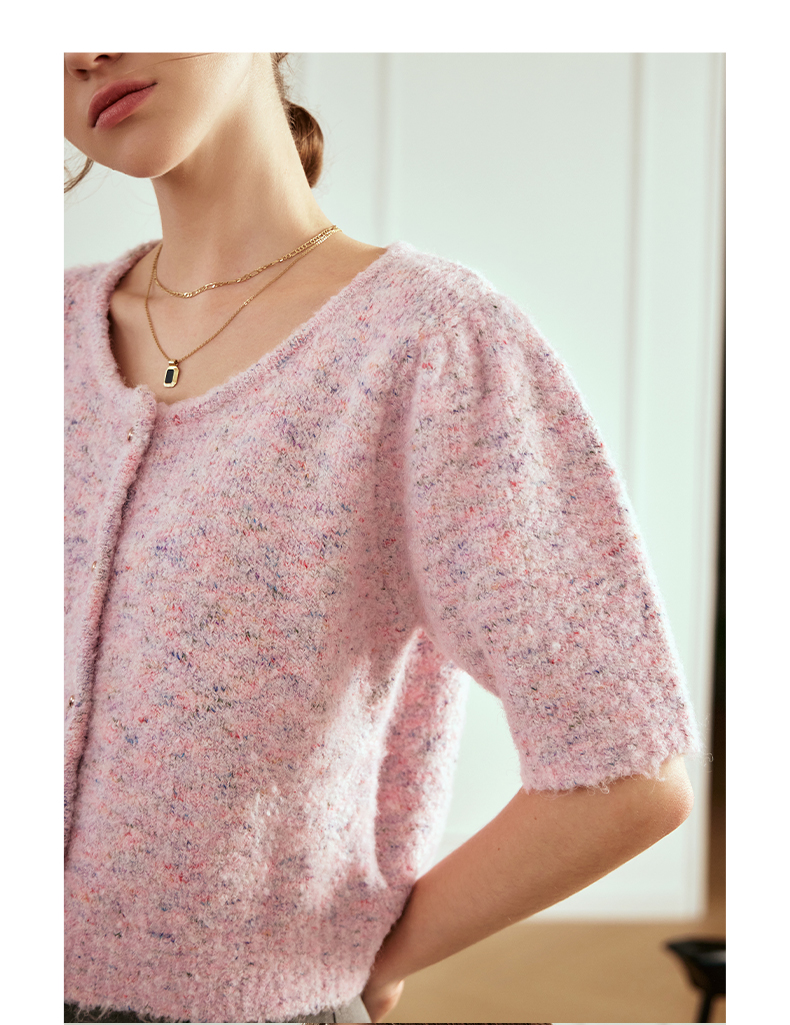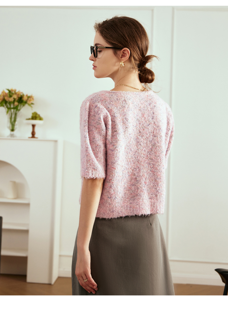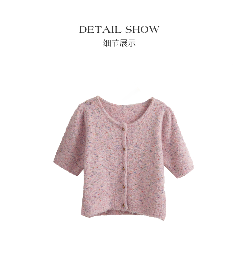 OLrain欧芮儿粉色薄针织衫女秋冬2023年新款圆领花纱短袖上衣
