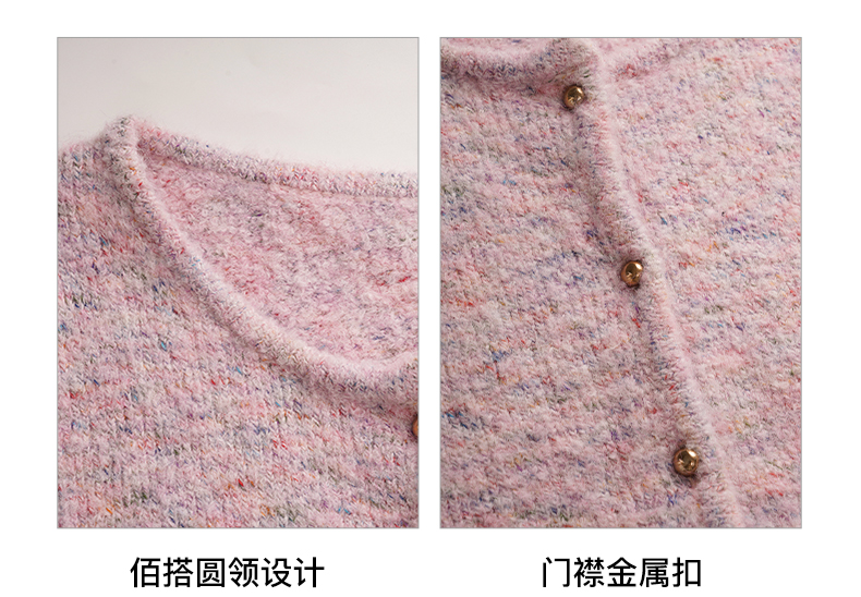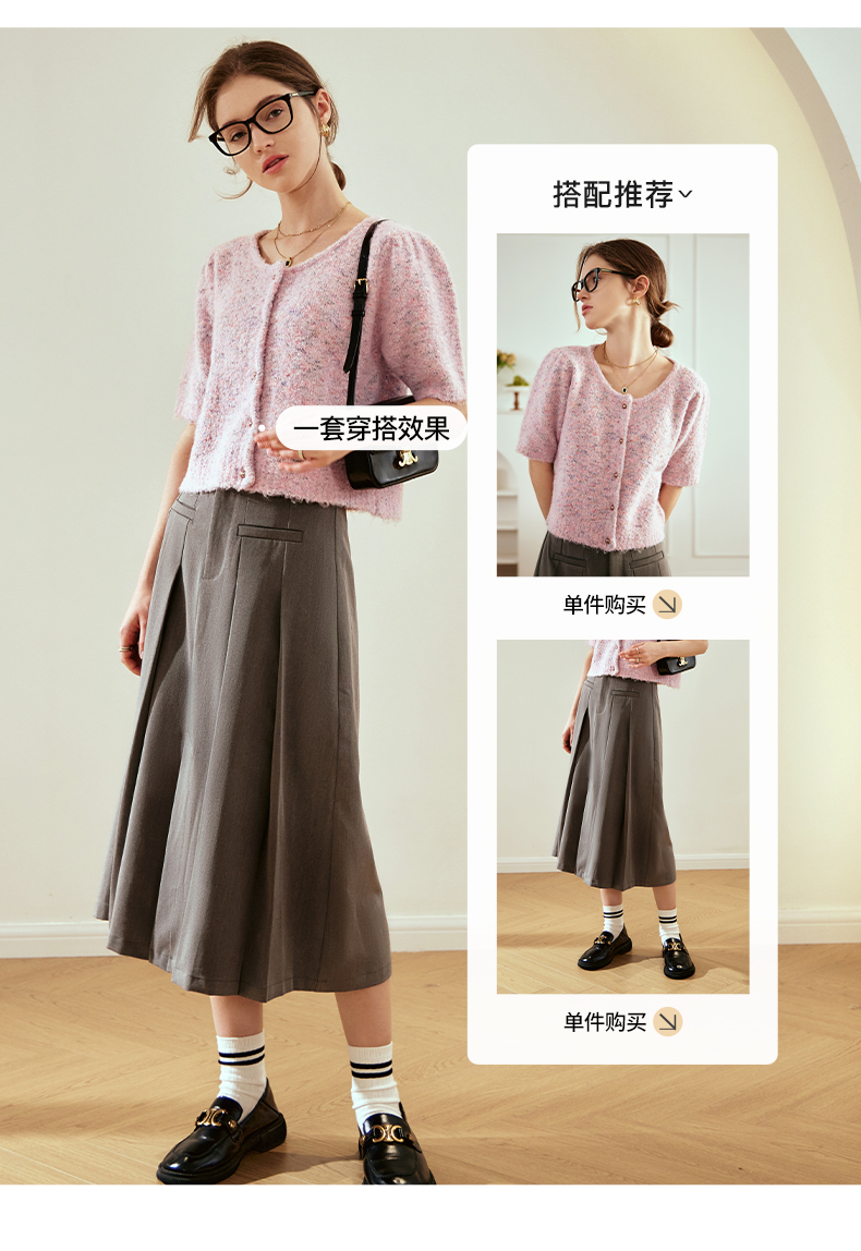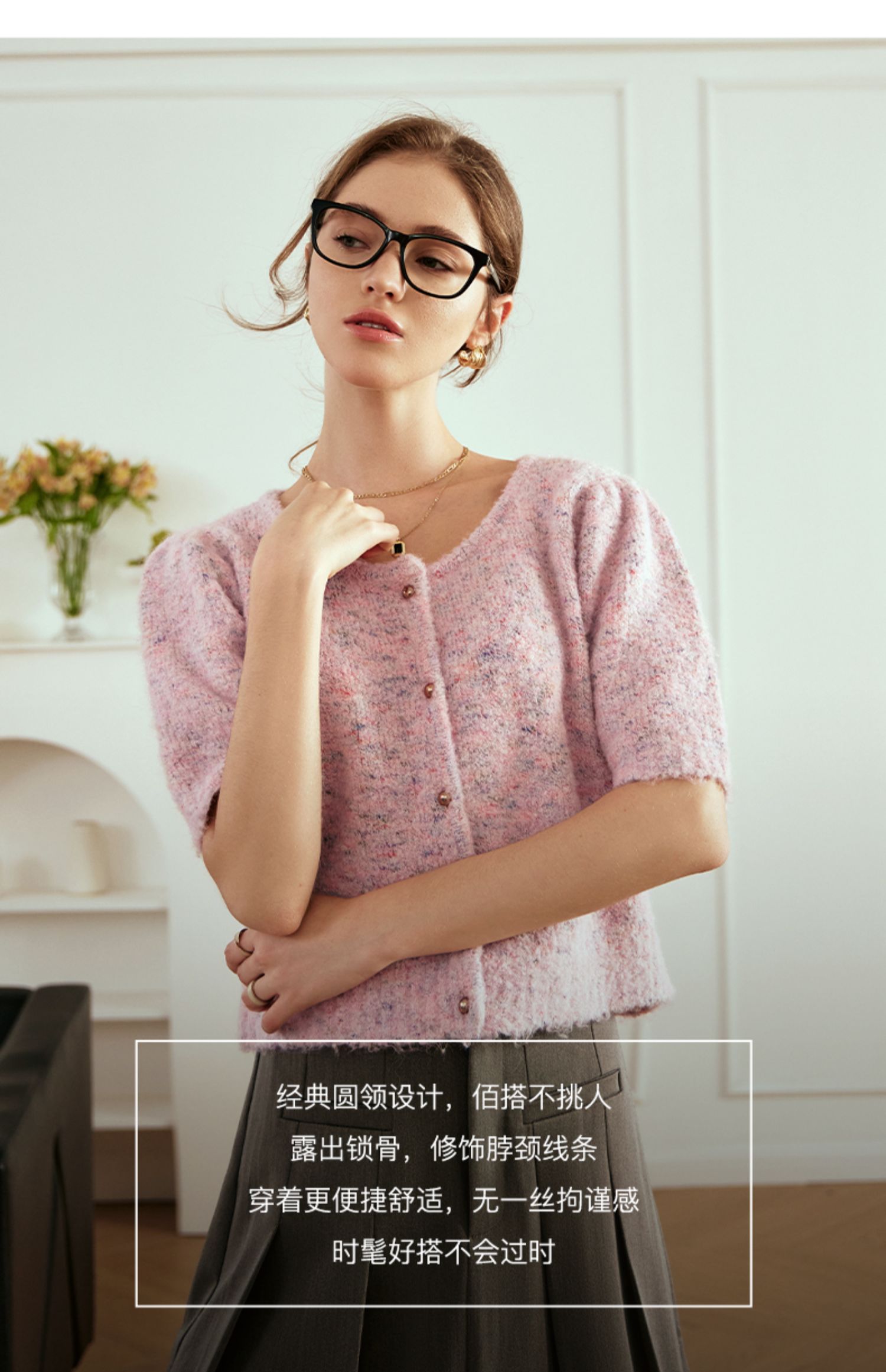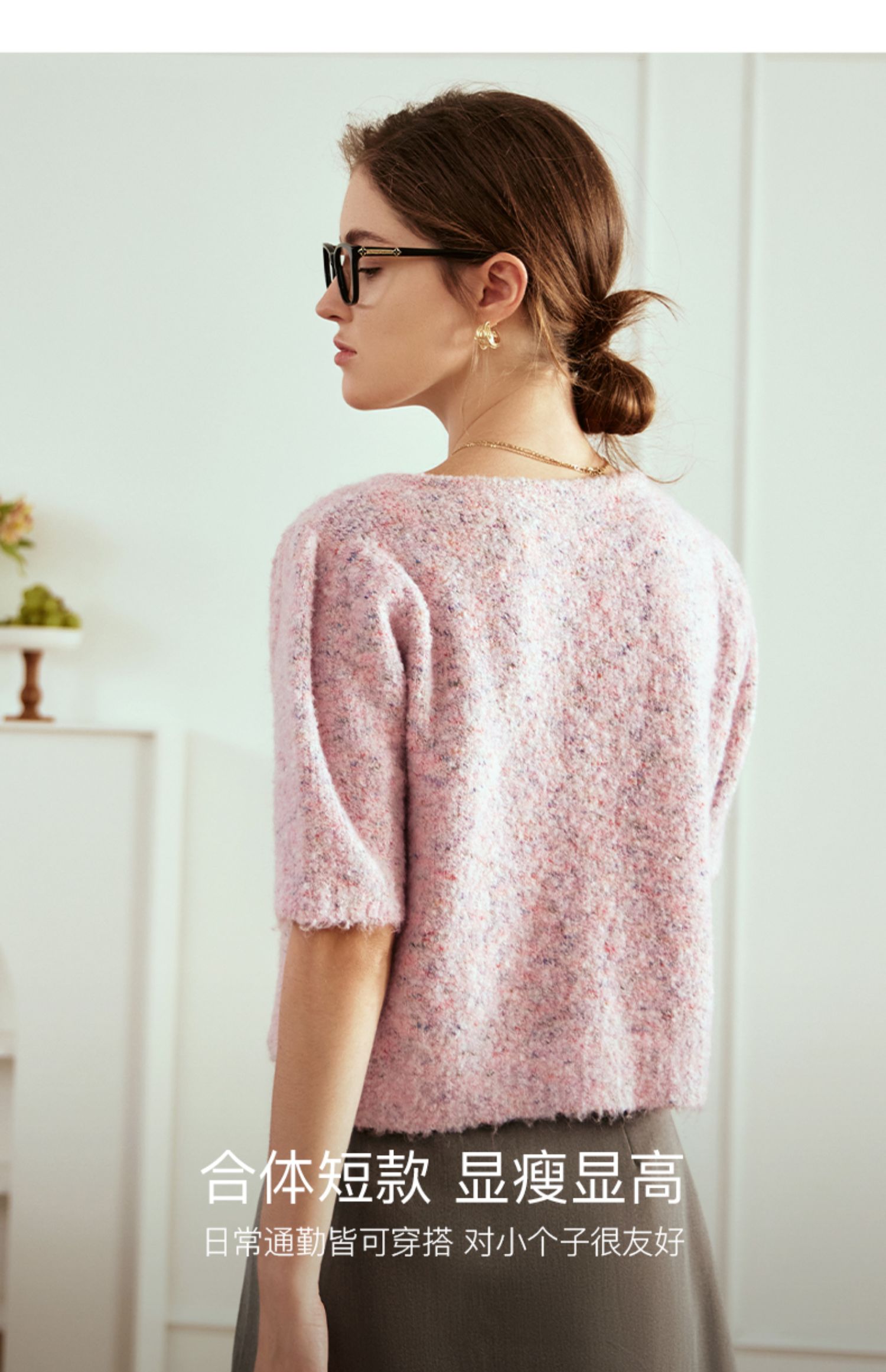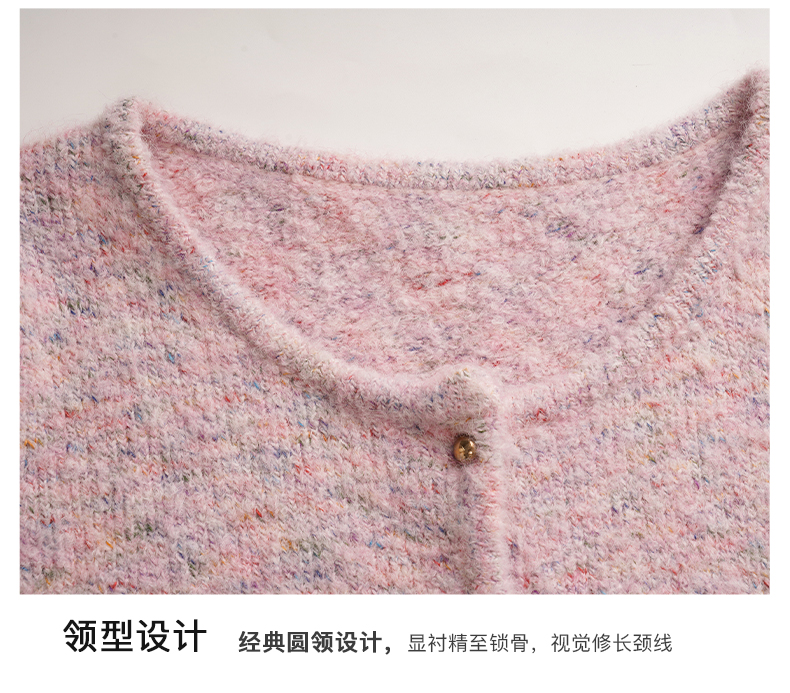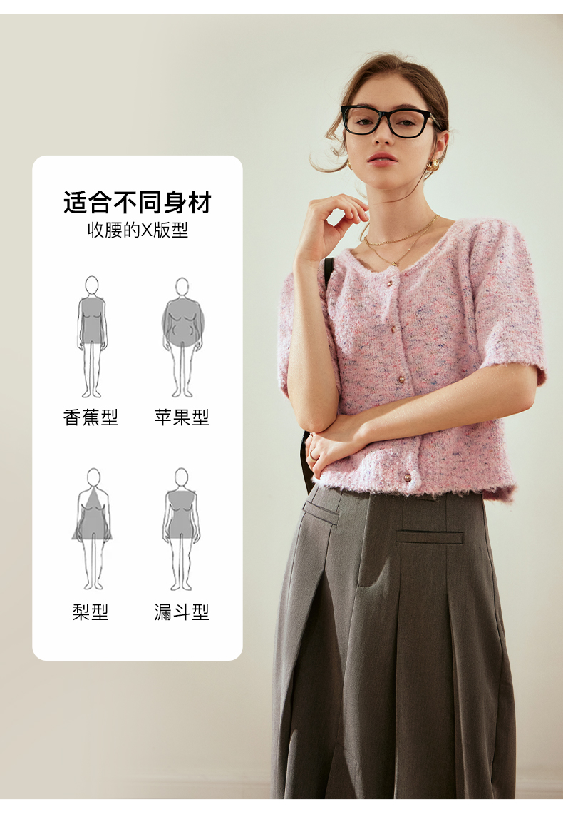 OLrain欧芮儿粉色薄针织衫女秋冬2023年新款圆领花纱短袖上衣