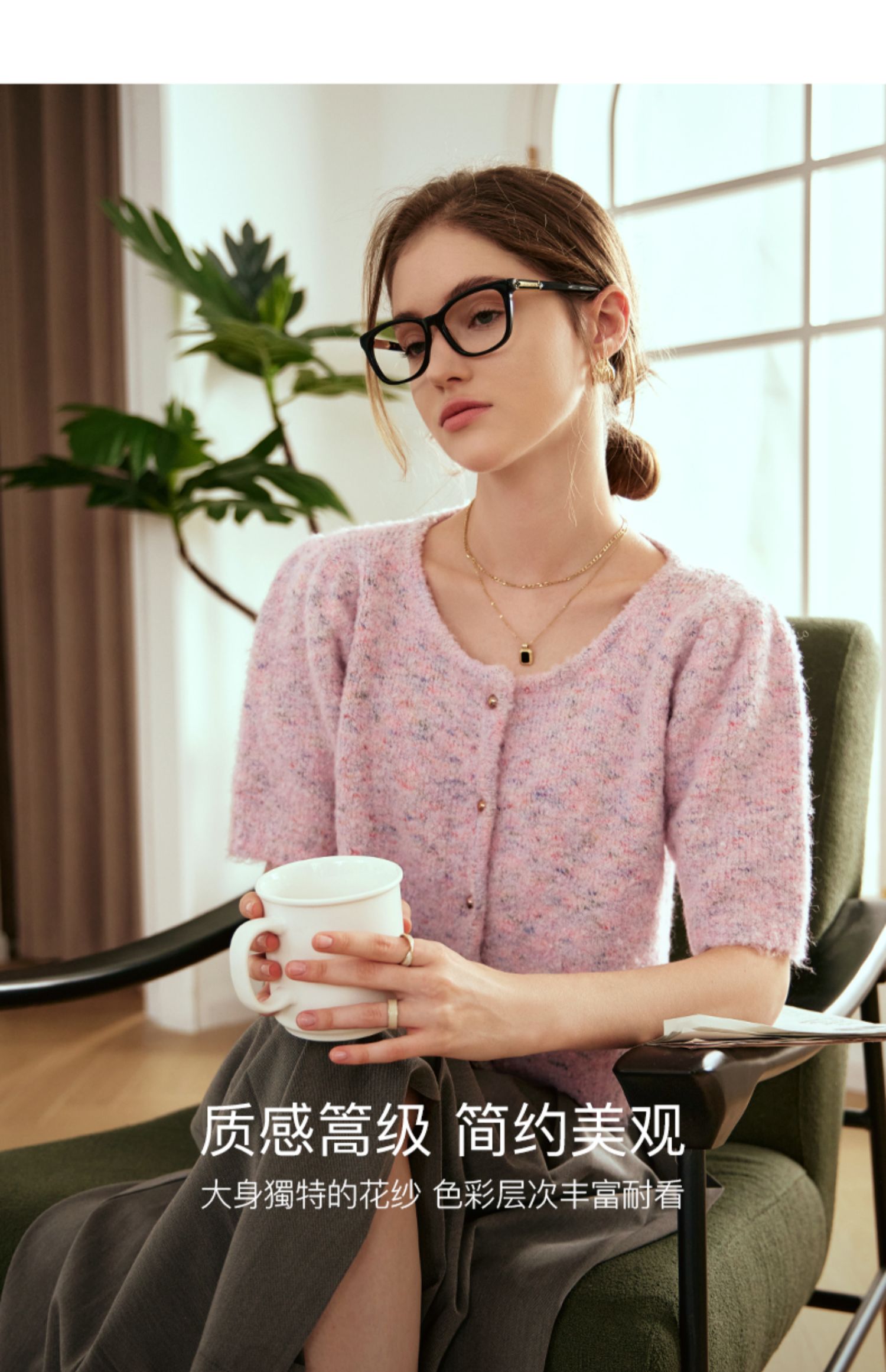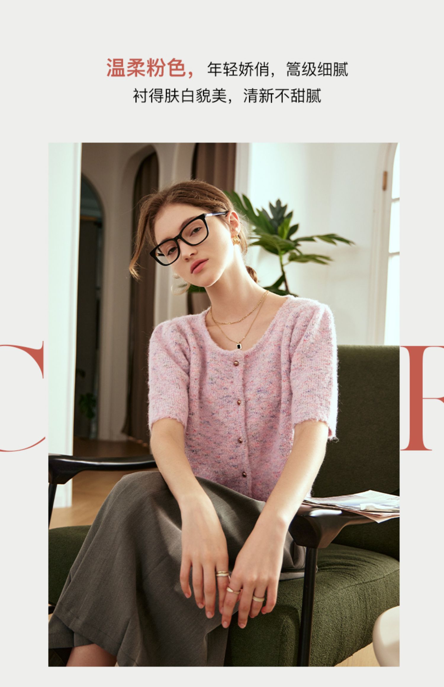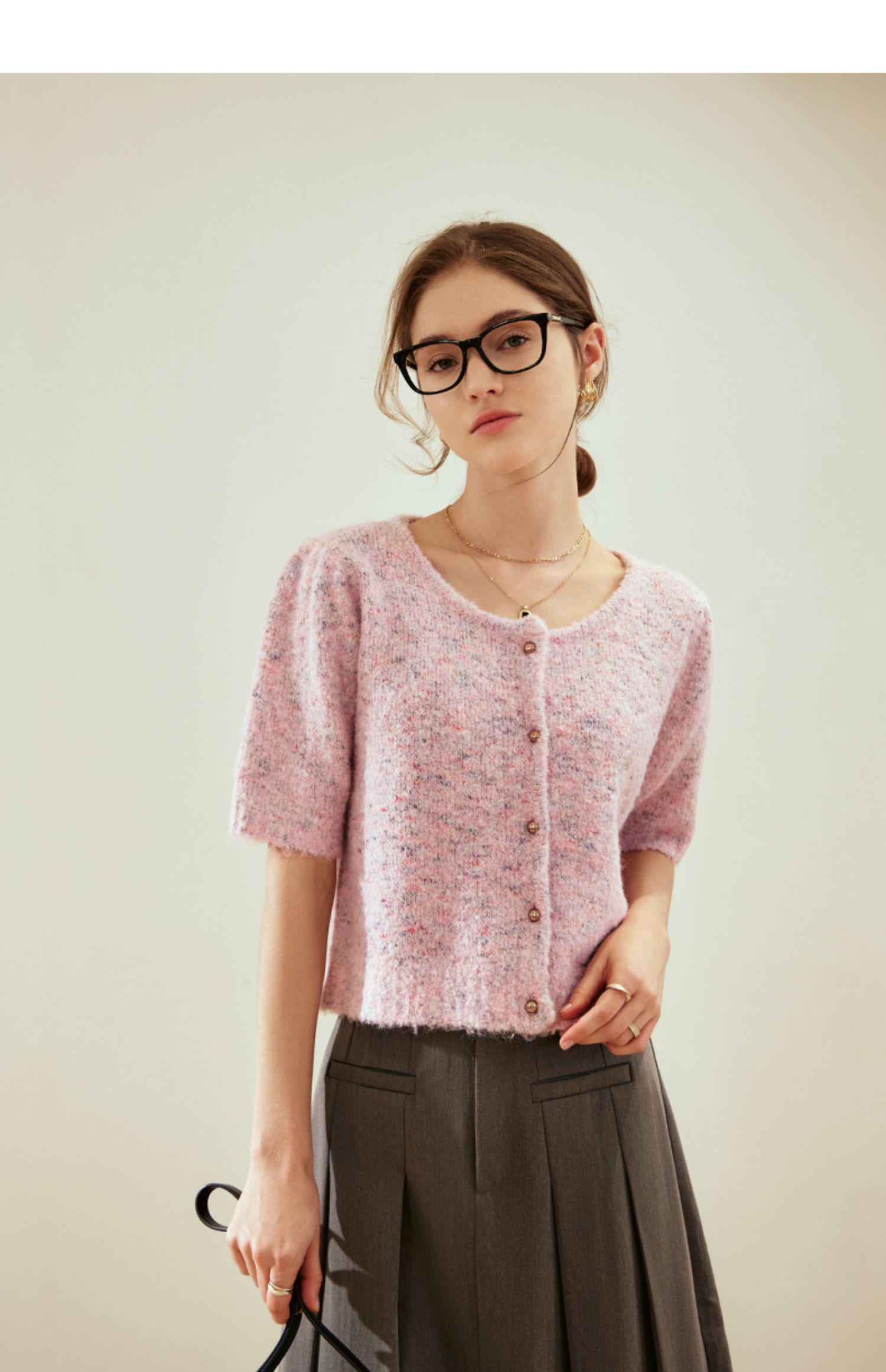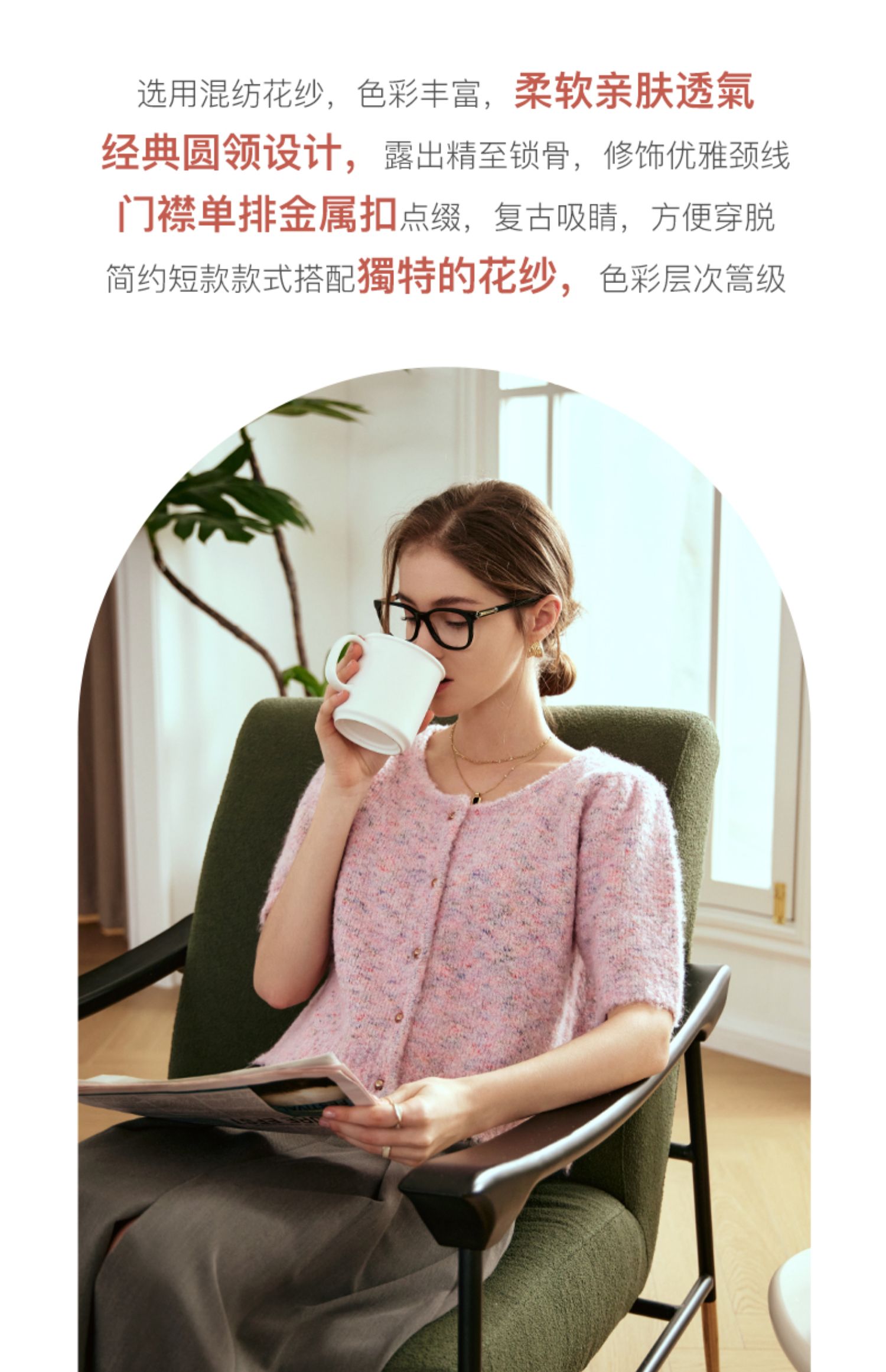 OLrain欧芮儿粉色薄针织衫女秋冬2023年新款圆领花纱短袖上衣