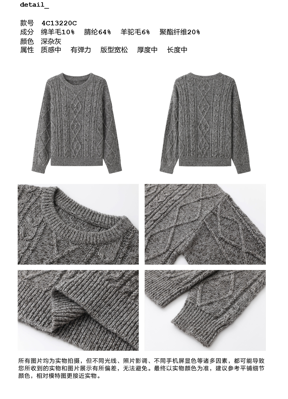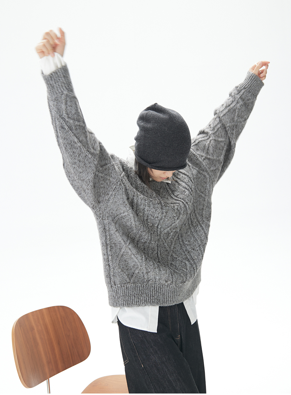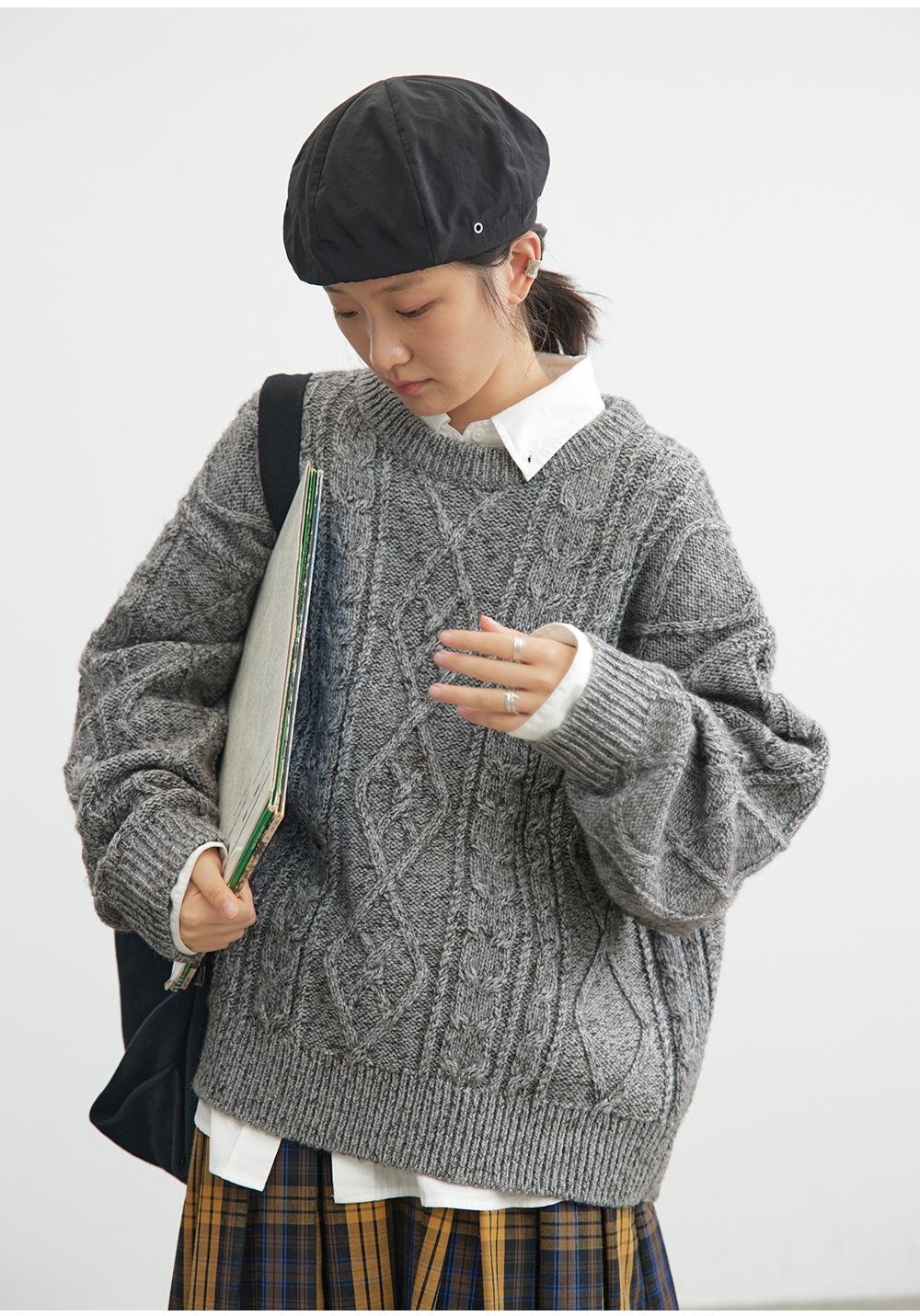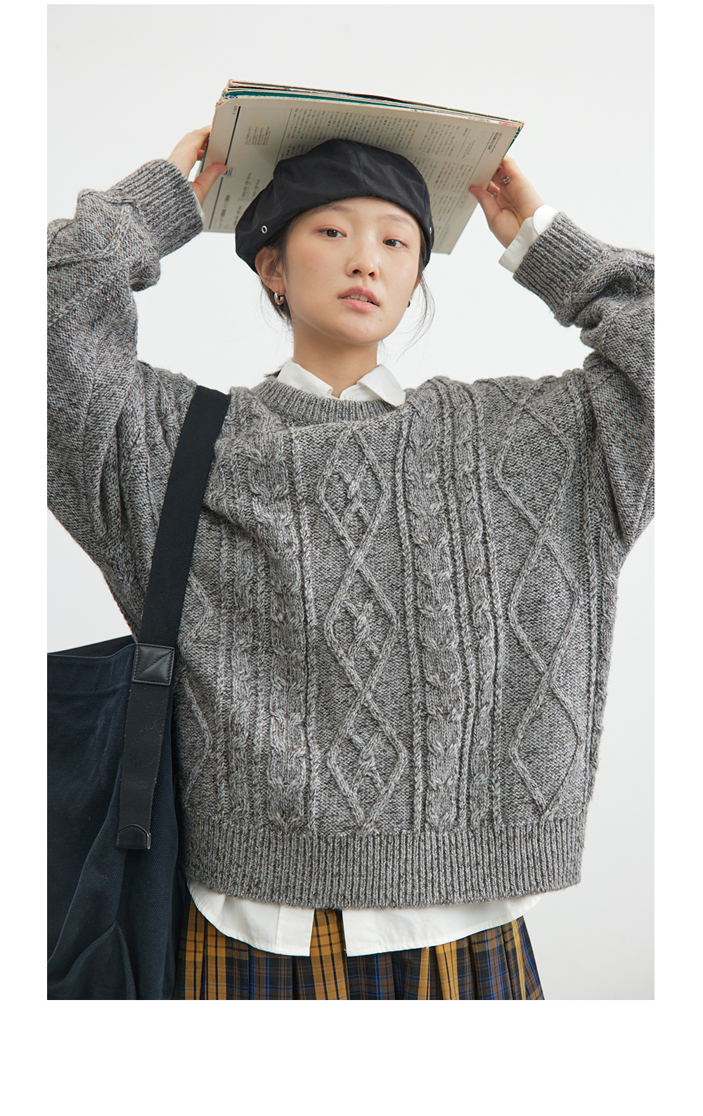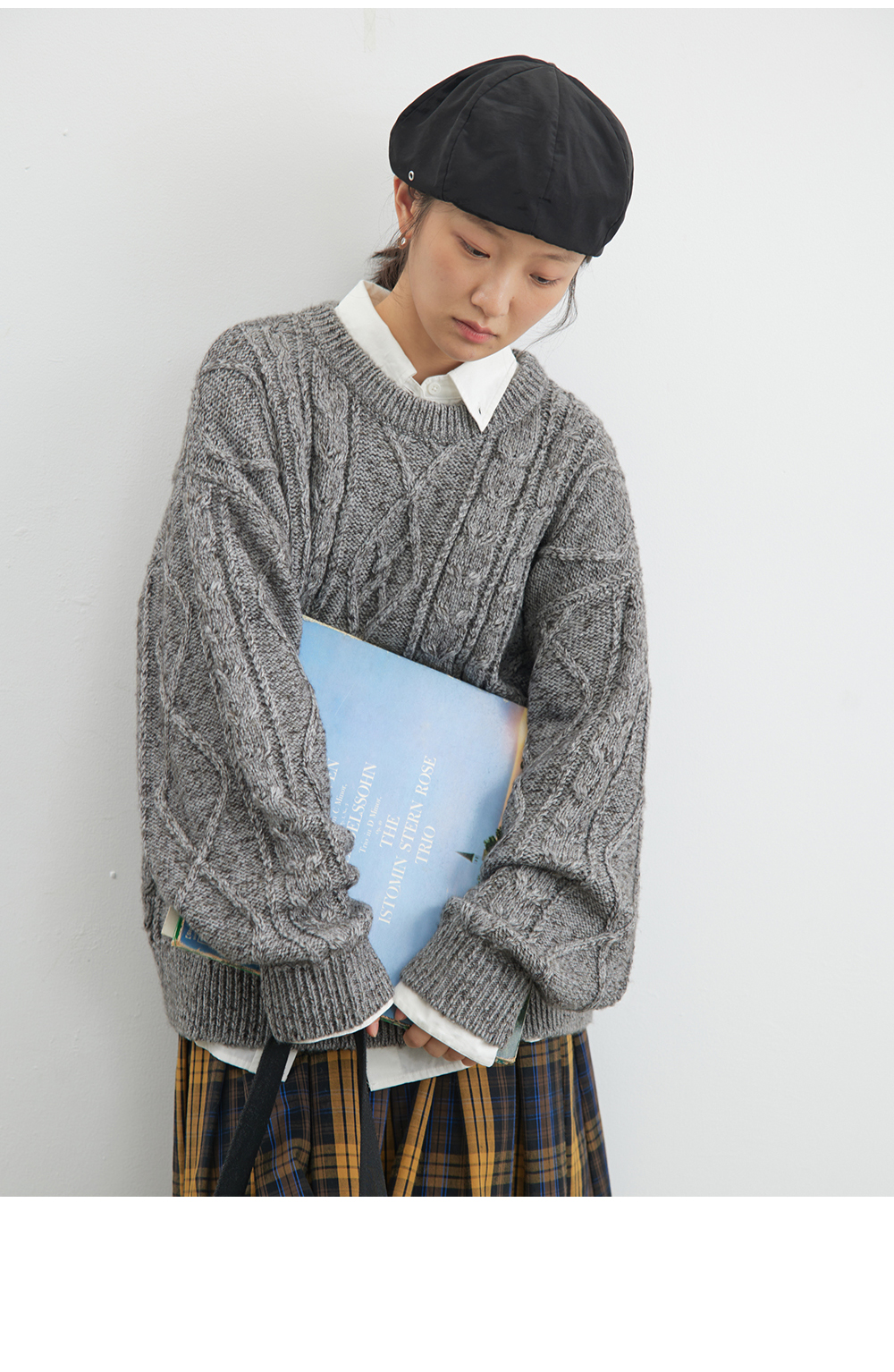 步履不停/4C13220C/复古麻花圆领杂灰色套头毛衣针织衫