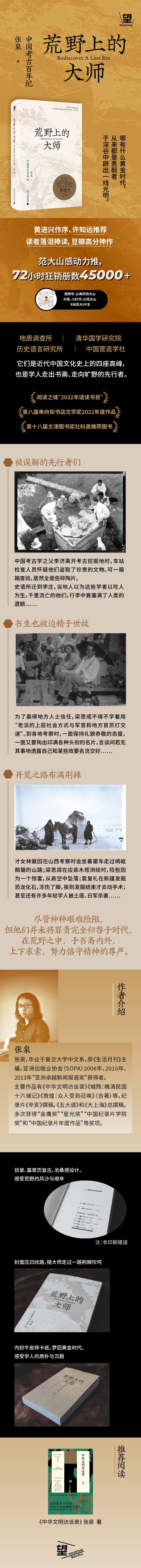 "《荒野上的大师》讲述的是1920年代中国考古初创的故事。作者以地质调查所、清华国学研究院、中央研究院史语所和营造学社四大机构的发展为主线,描绘了中国考古的诞生经过。这四大机构走出了诸多考古名家,(李济、赵元任、吴宓、贾兰坡、夏鼐、梁思成、林徽因、梁思永等等),作者以细腻感性的笔法,讲述了他们在考古现场和学术书斋中的工作与贡献,突出了他们在逆境中开辟新天地的勇气和毅力,表现了他们在内忧外患之际凭热血和专业为国效力的事迹。《荒野上的大师》还描绘了当时的诸多重大发现,这些发现让中国在世界考古舞台上有了话语权。值此中国考古百年,《荒野上的大师》意在重温先行者的精神和品德,希冀今人再创中国考古的“黄金时代”。