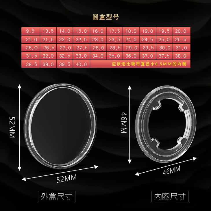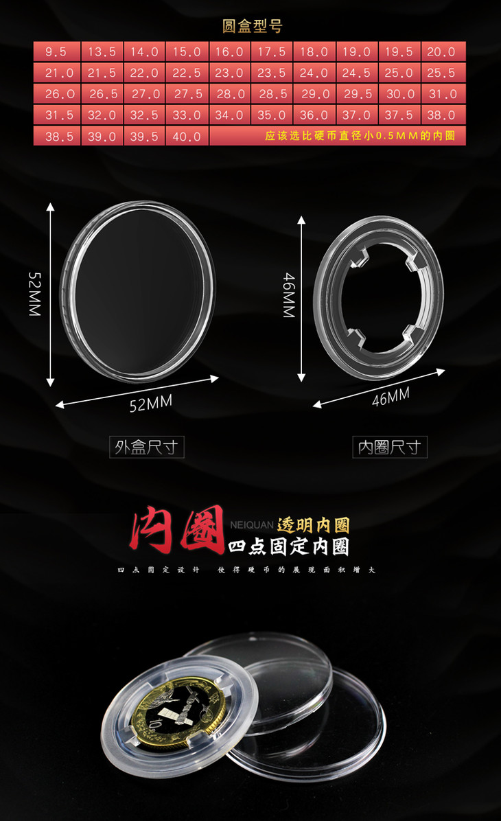 购买时请选择比钱币的精确直径小0-0.5MM的为最合适,比如钱币的精确直径是27MM的,应该选择的型号是26.5MM的为最合适。