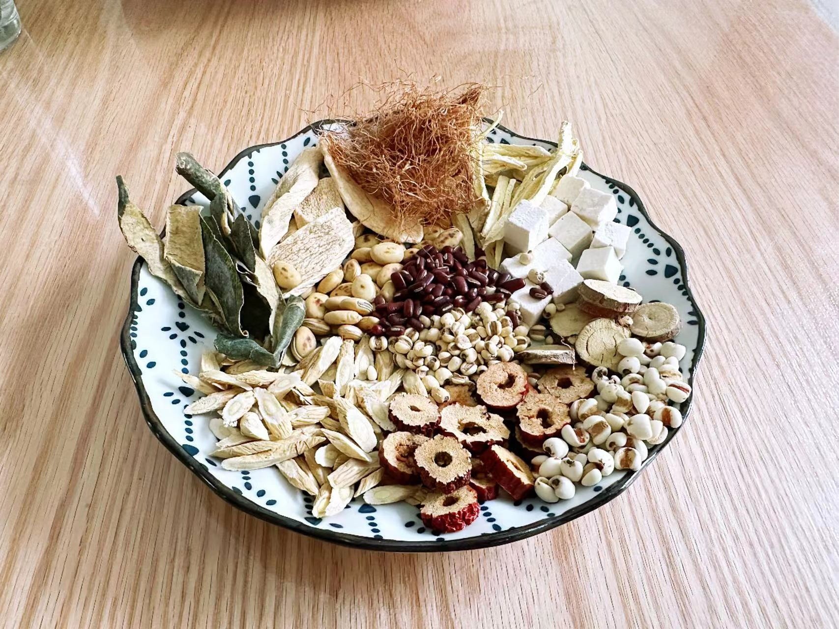 配料表:黄芪、红枣、薏米仁、茯苓、赤小豆、麸炒铁棍怀山药、白扁豆、冬瓜皮、姜、玉米须、甘草。