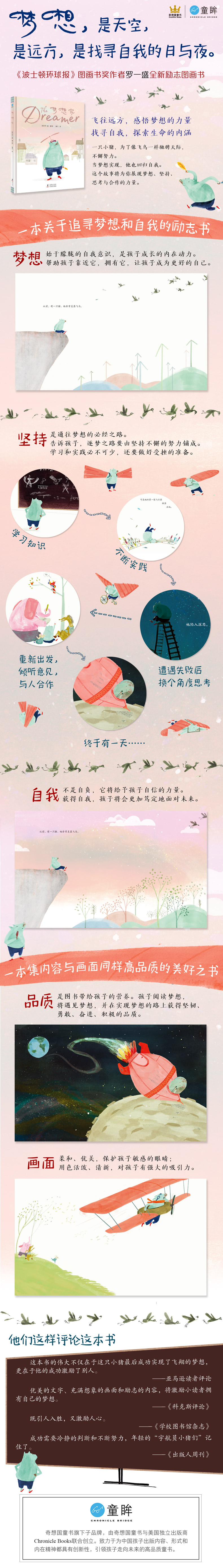 从前有一只小猪,它羡慕飞鸟,想像它们一样展翅飞翔,但是他没有翅膀。为了实现自己的梦想,小猪开始了自己不屈不挠的逐梦之路。他努力学习、思考,制定飞行计划,建造了精细的实验装置,还一遍又一遍地进行飞行冒险。经过无数次尝试,一遍又一遍的演算和实验后,在朋友们的帮助下,他终于成功飞了起来。它飞啊飞,飞到了任何想去的地方,看遍一切与众不同的景色。但,他最终发现自己最爱的事情还是坐在老地方,望着天空中自在飞翔的小鸟。罗一盛创造了一个引人入胜、充满奇思妙想并激励人心的世界。在这里,一切皆有可能,就连小猪也能学会飞翔。