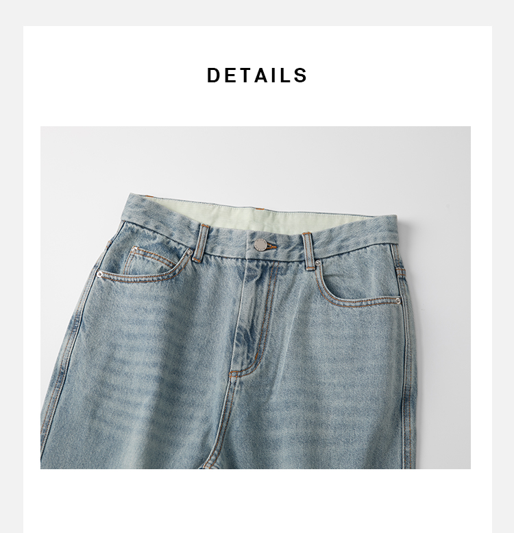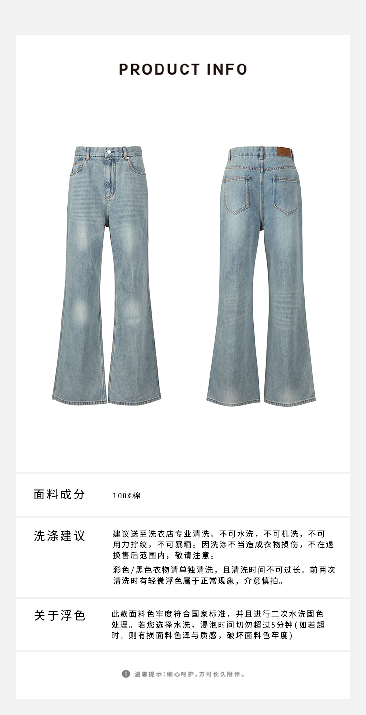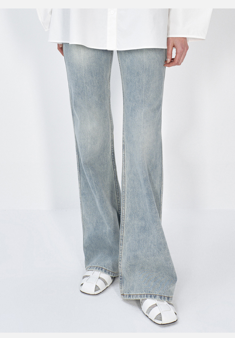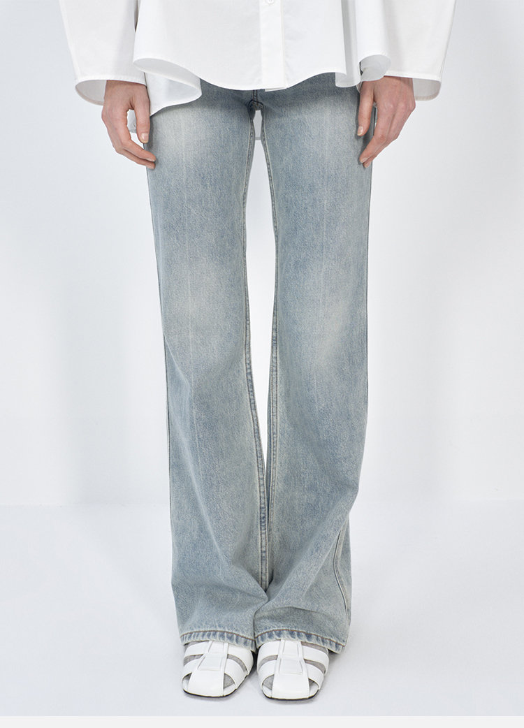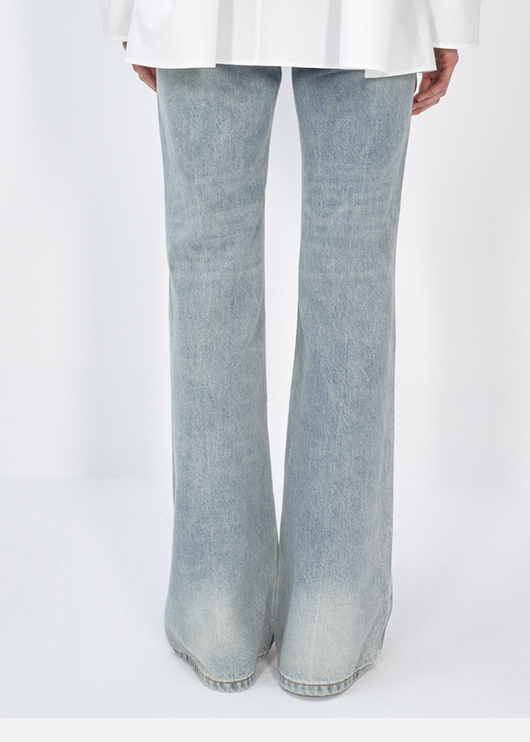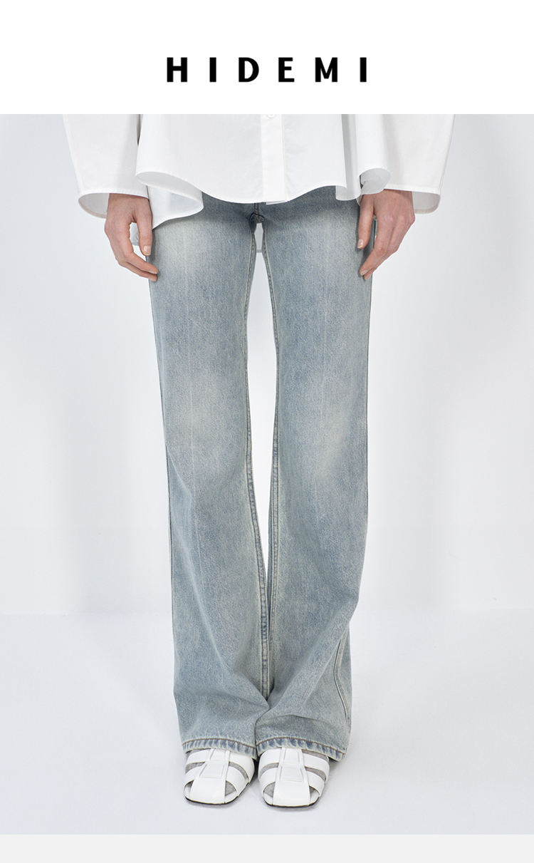 HIDEMI蓝色柔软做旧感多重水洗喇叭形宽松阔腿牛仔裤
