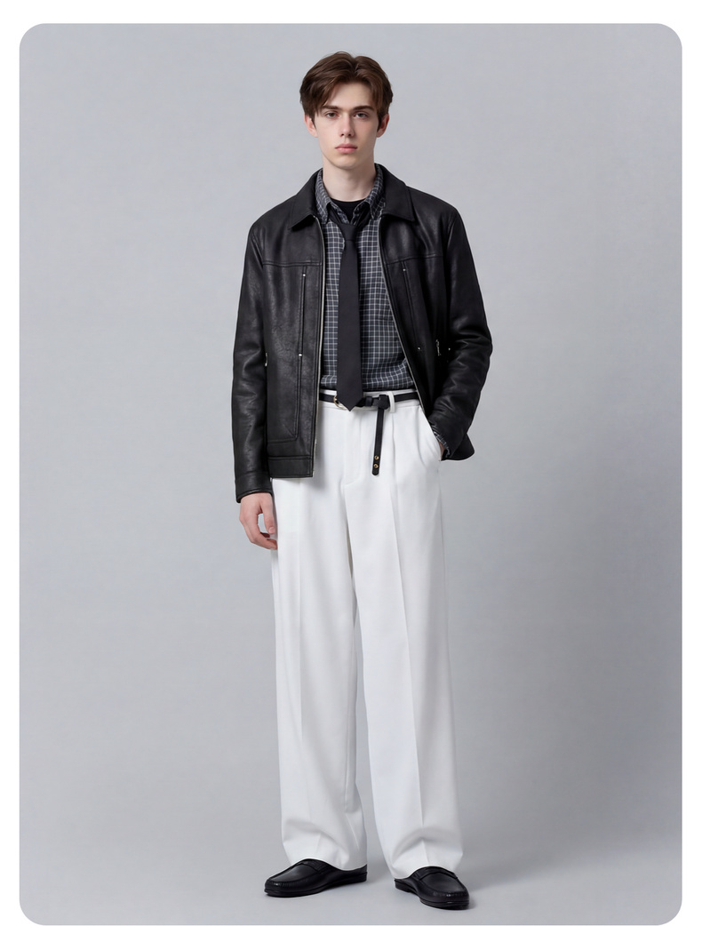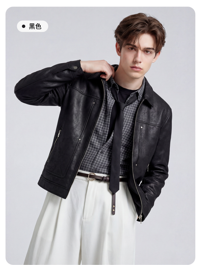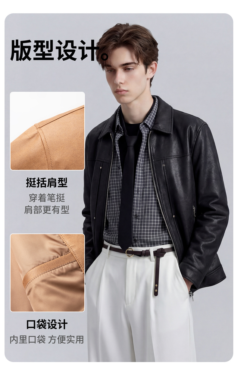 圣得西2025秋新款时尚休闲皮衣外套男商务行政轻奢翻领真皮外套