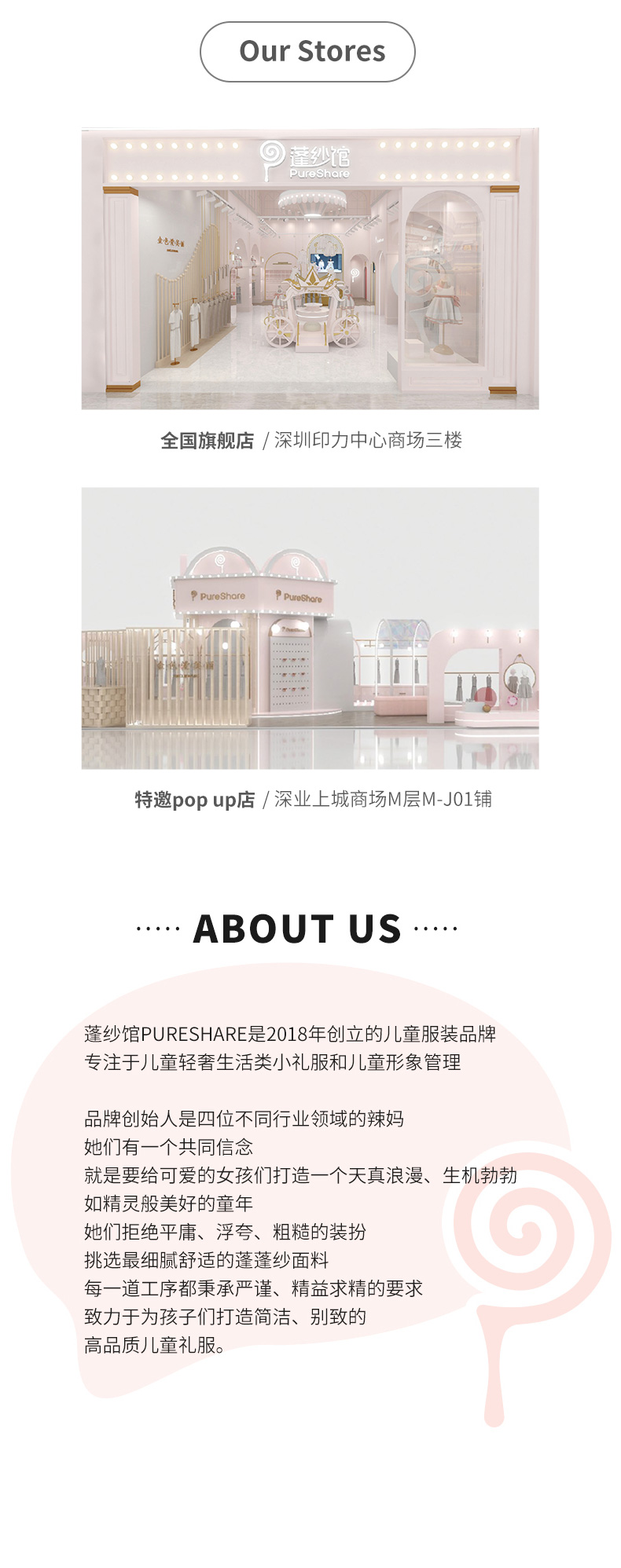 - PureShare蓬纱馆,2018年创立的儿童服装品牌,专注于儿童轻奢生活类小礼服,主张“让孩子做最独特的自己”的品牌理念,为孩子们提供时尚简洁、优雅而又不失童真的生活类礼服。