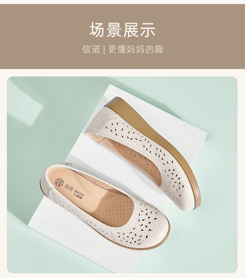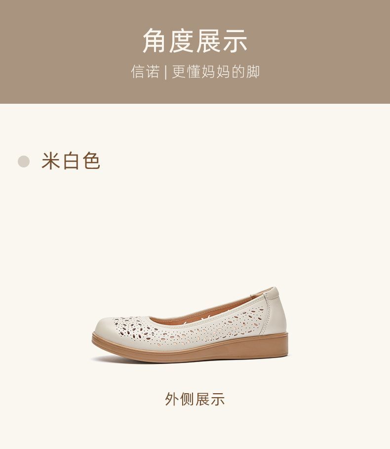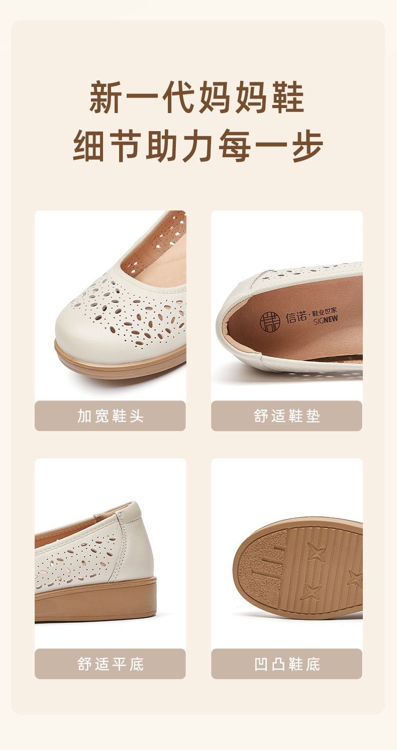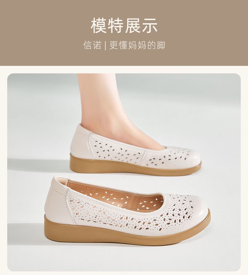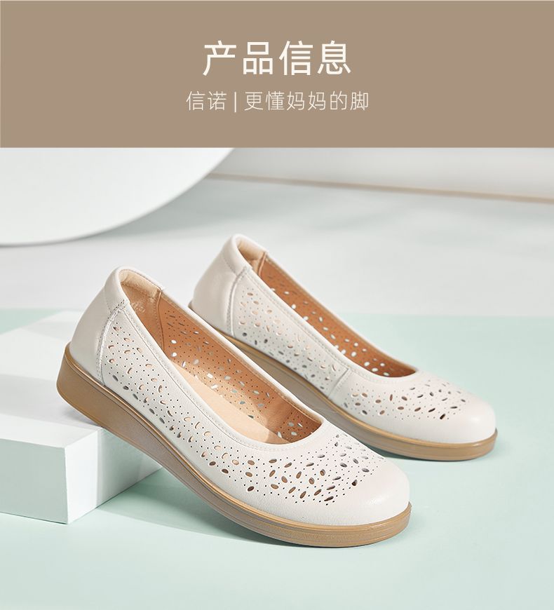 信诺真皮舒适女鞋2025新款夏季洞洞鞋平底镂空单鞋透气妈妈鞋凉鞋5C6801-027