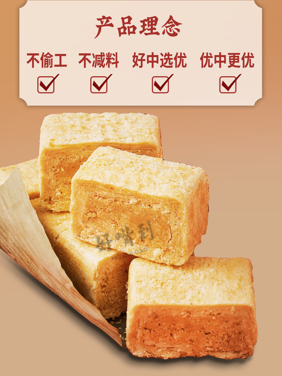 不减料,是传统材料不减少。在传统食材里好中选优,优中更优。传统贡糖,选用东北优质花生仁,用海藻糖替代传统白砂糖, 麦芽糖里不能掺杂糖浆。