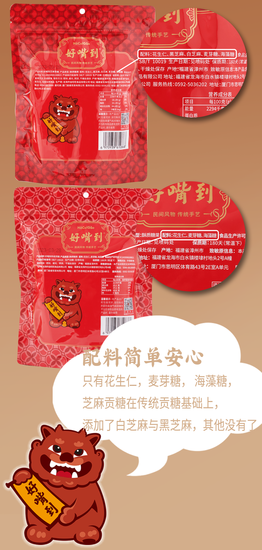 因此,我们的配料表也非常干净,只有花生仁,麦芽糖, 海藻糖;芝麻贡糖在传统贡糖基础上,添加了白芝麻与黑芝麻,其他没有了。