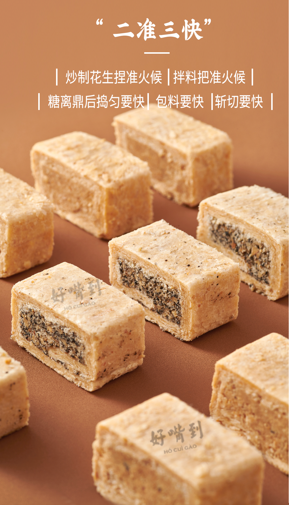 贡糖,采用传统的非遗工艺制作,坚持“不偷工,不减料,好中选优,优中更优”的产品理念, 在口感上,用海藻糖替代白砂糖,利用海藻糖的低吸湿性,减缓贡糖表面糖化黏黏的速度。