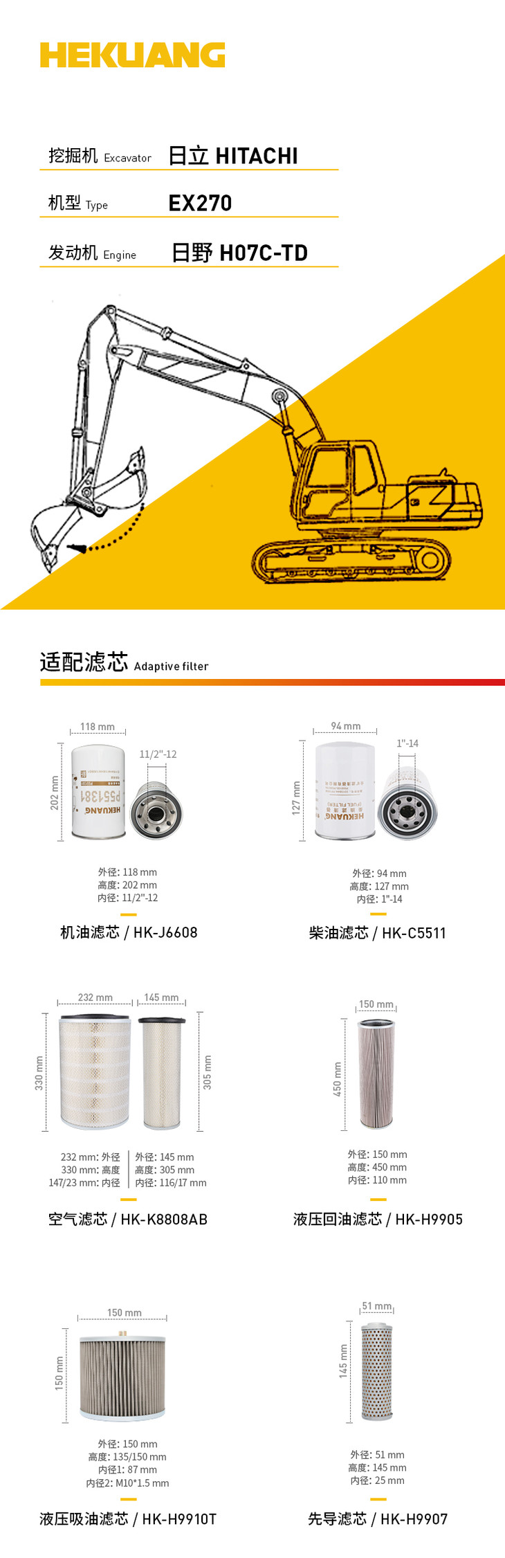 日立EX270(日野H07C-TD)挖掘机滤芯 机油柴油空气滤芯 液压油先导滤芯