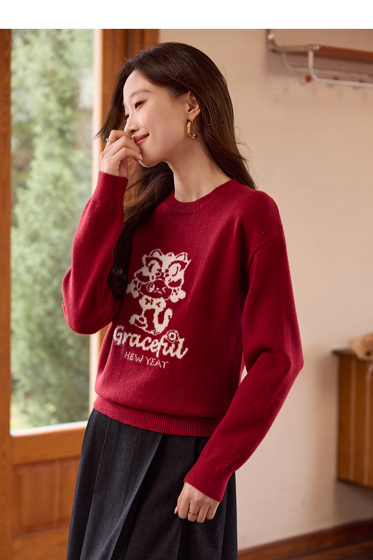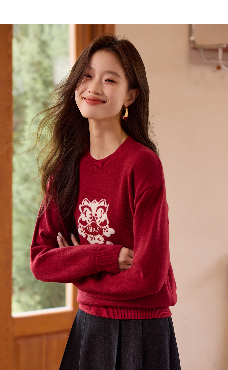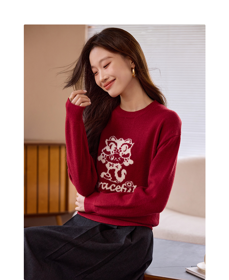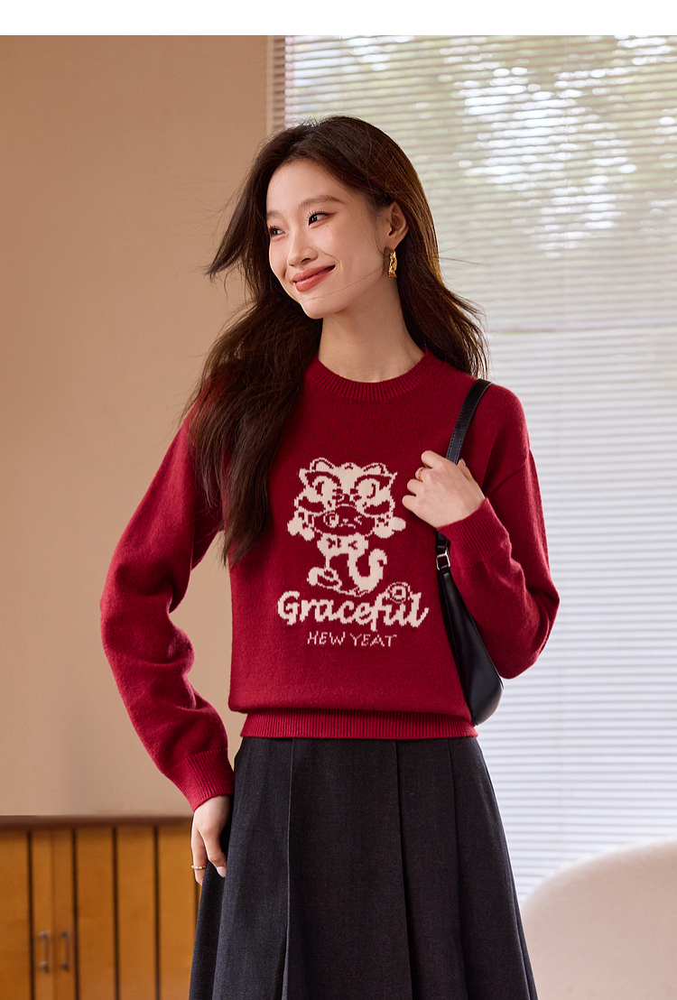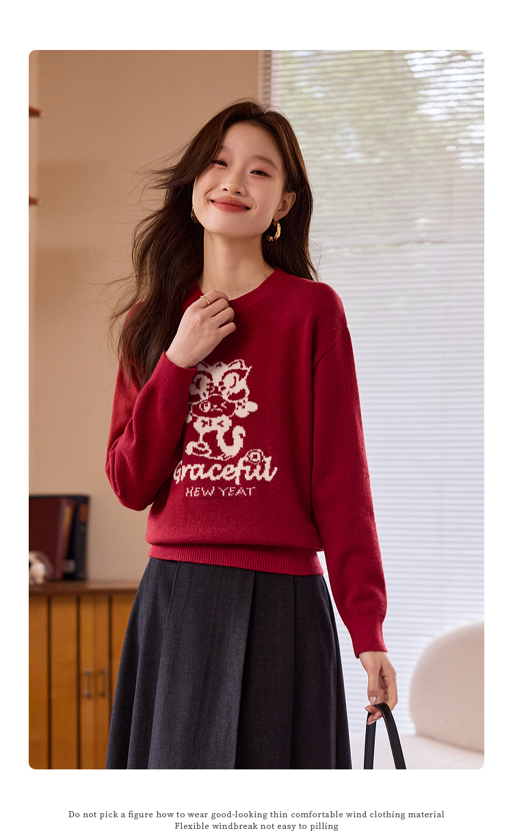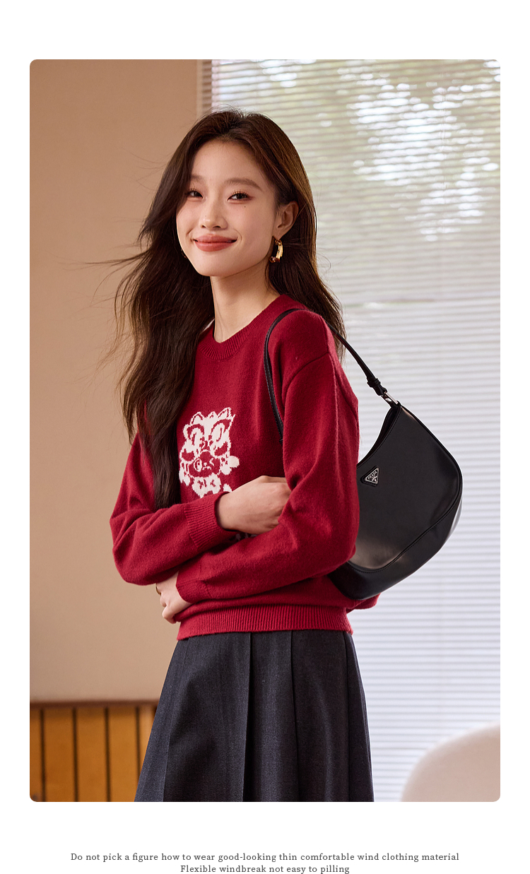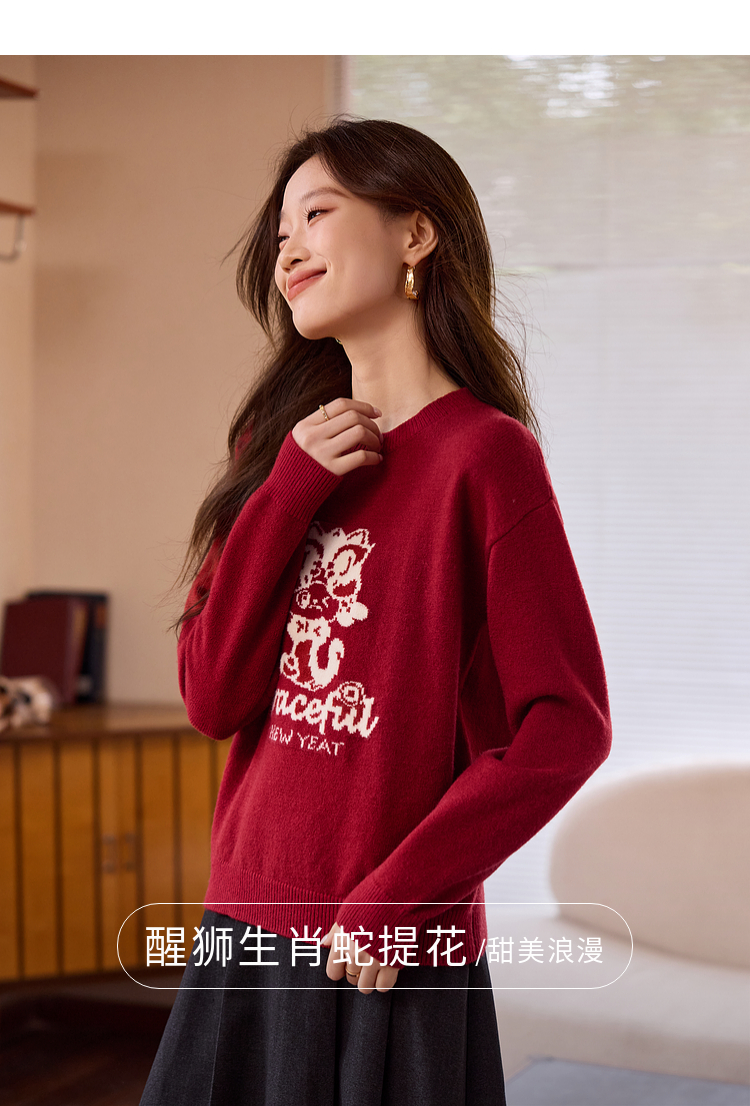 【年货节】熙世界蛇年毛衣女红色本命年生肖提花圆领打底针织衫2025秋冬款