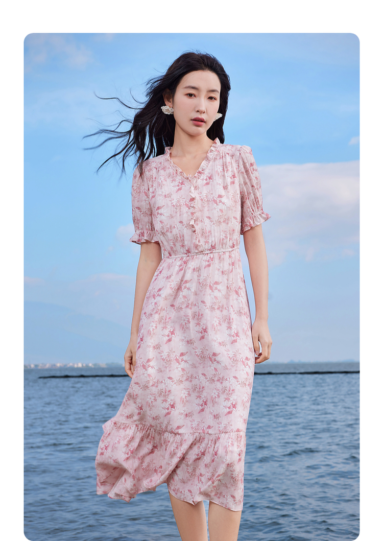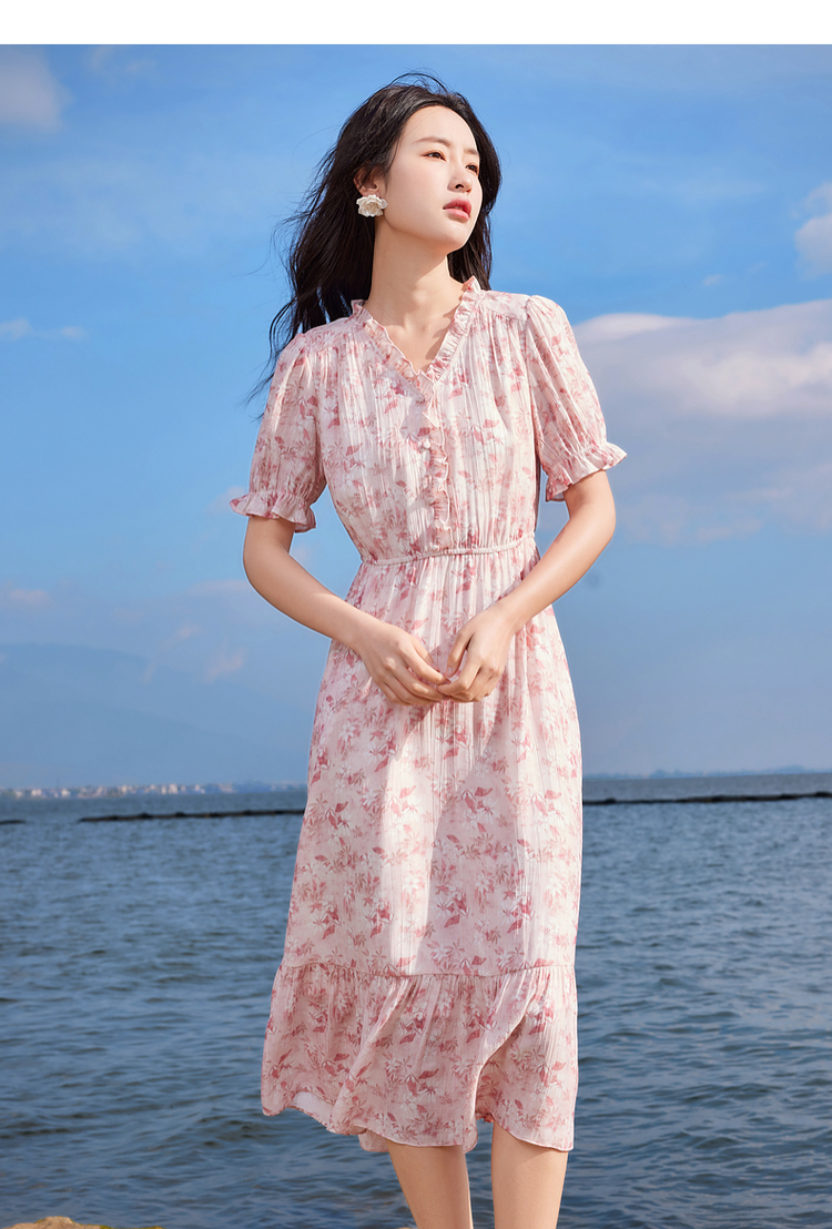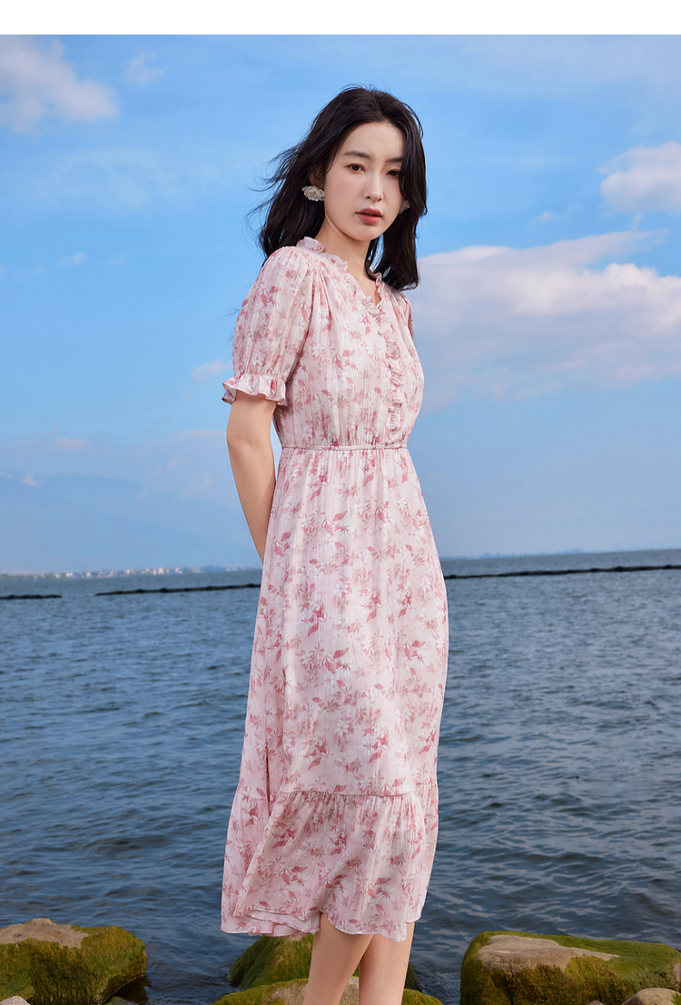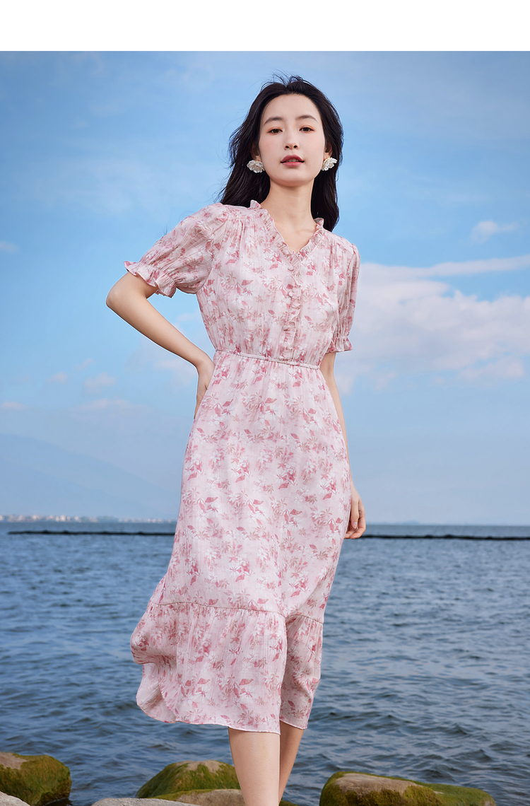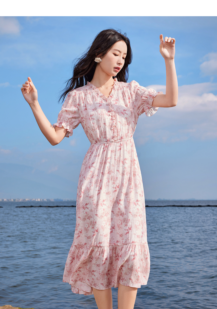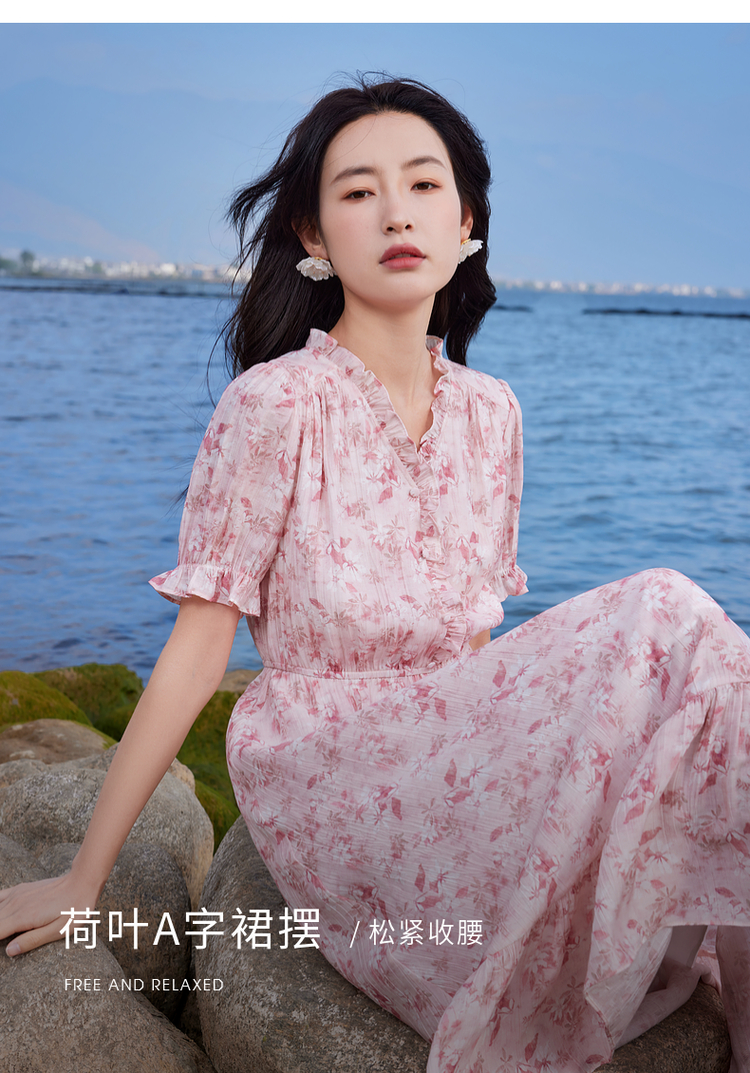 【专属特价】熙世界裙子夏季女2025新款法式V领泡泡袖荷叶边a字碎花连衣裙绝美