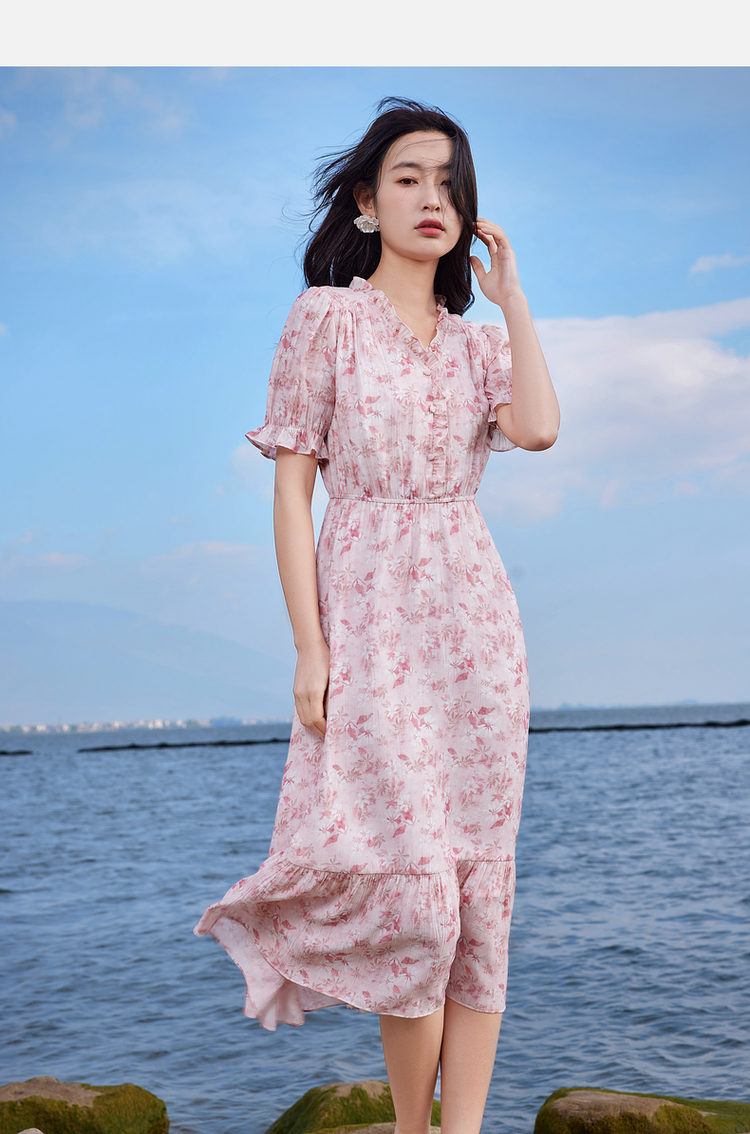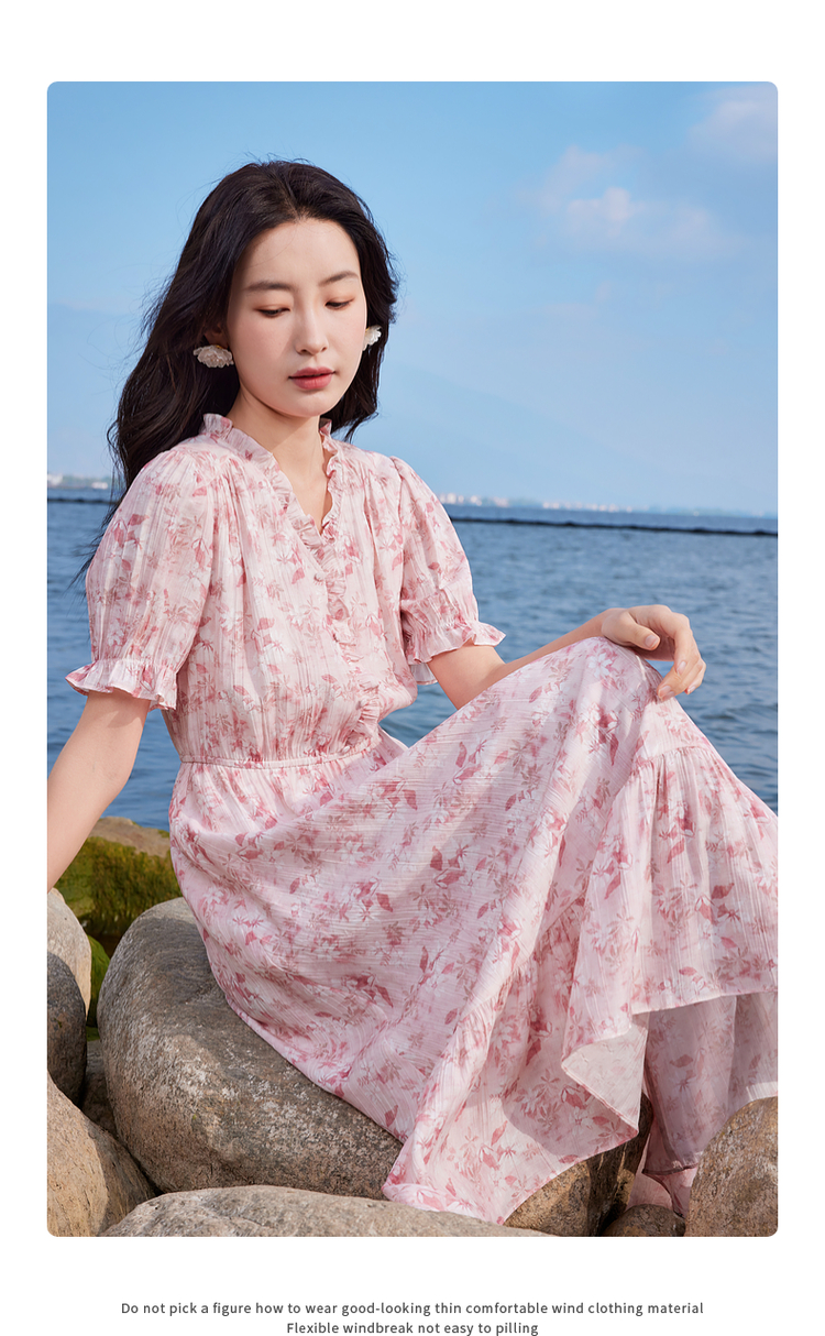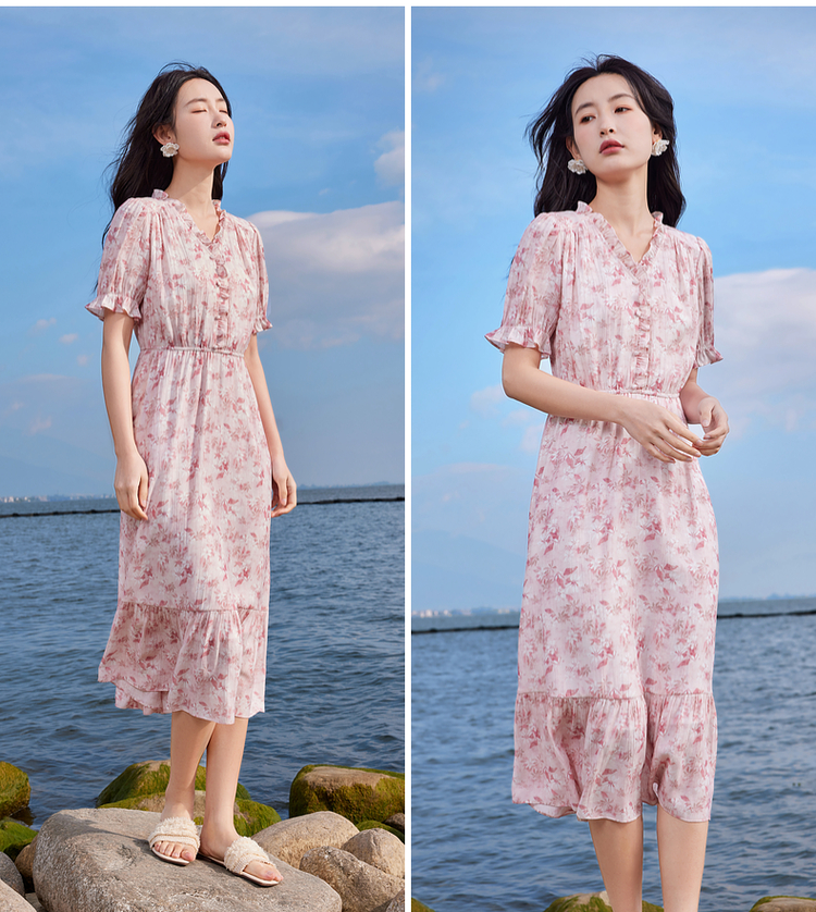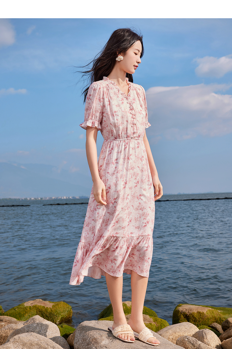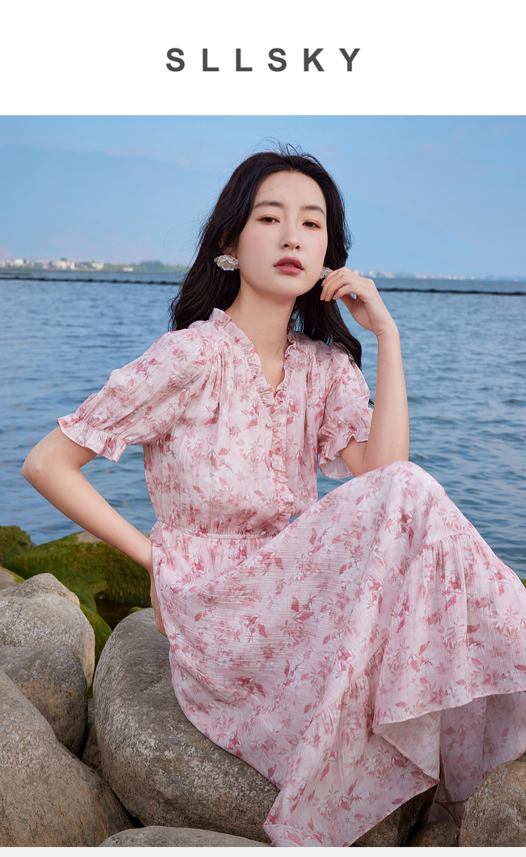 【专属特价】熙世界裙子夏季女2025新款法式V领泡泡袖荷叶边a字碎花连衣裙绝美