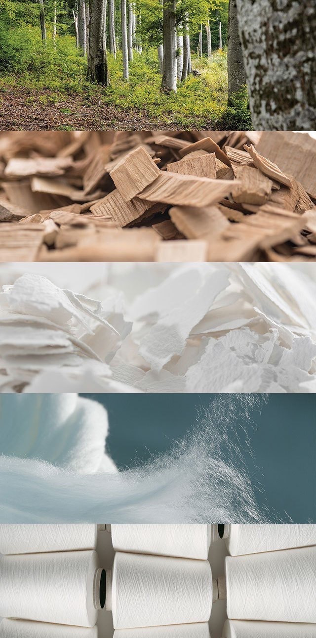 兰精莫代尔的工艺复杂: 树→木头→纸浆→纤维→纱线→面料 但优点也非常明显 所以在业界,兰精莫代尔面料是高档的代名词其生产过程环保,可自然降解,不仅提供了优质的穿着体验,也体现了利蜂品牌对环境保护的尊重。