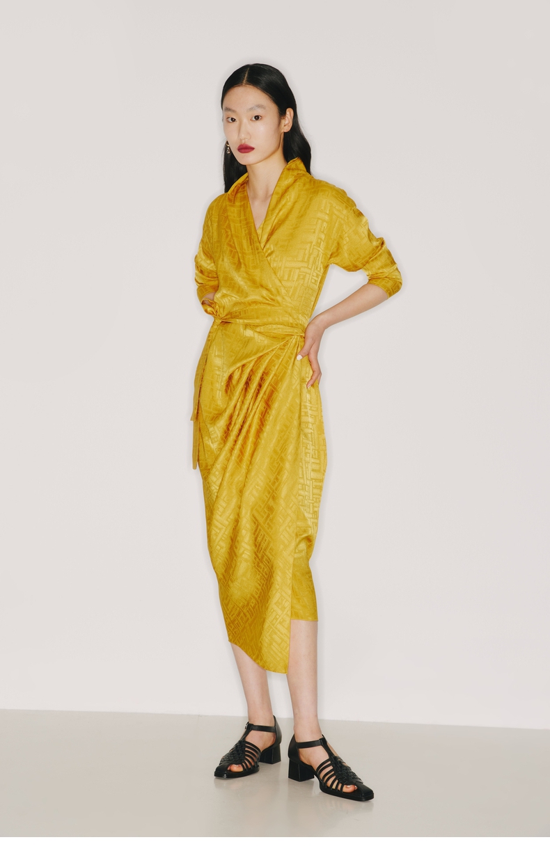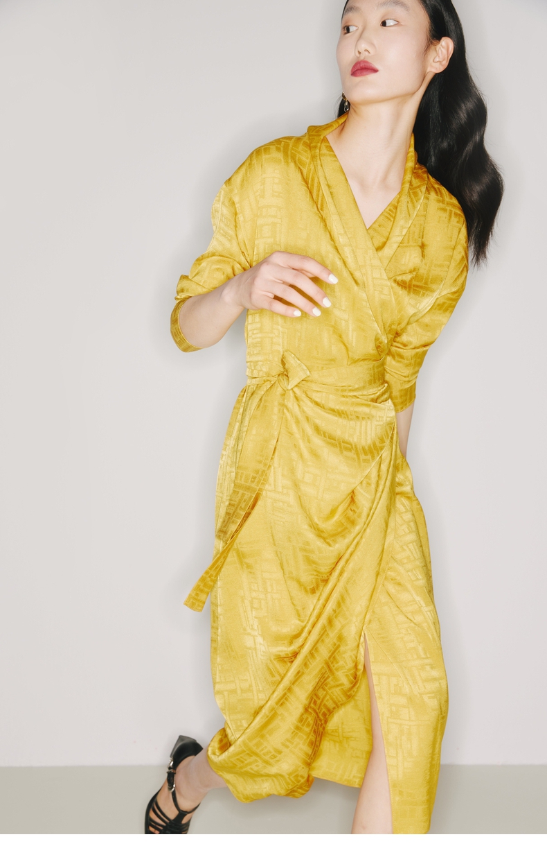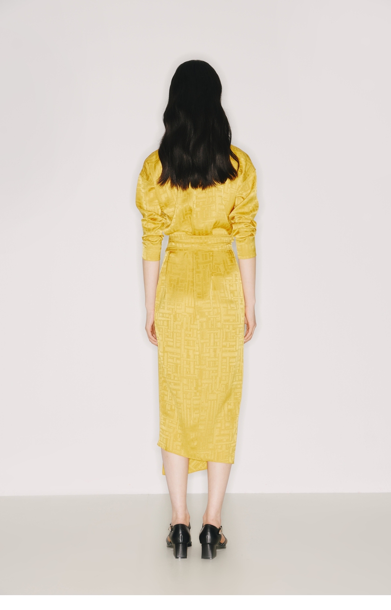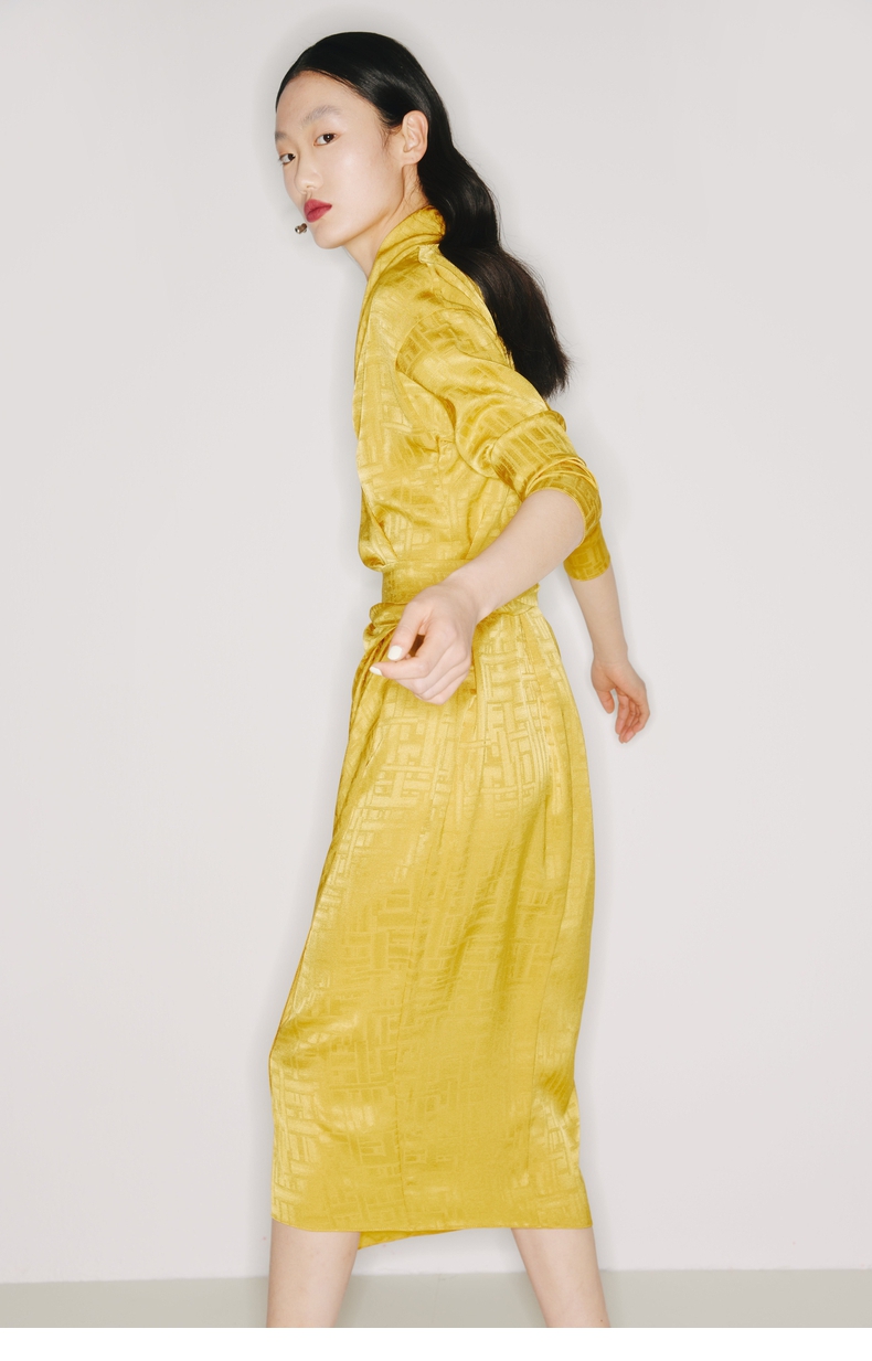 【春日信徒】定制款日本进口三醋酸琉璃黄立裁裹身长袖连衣裙/22000030B