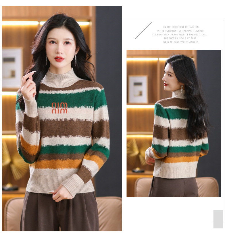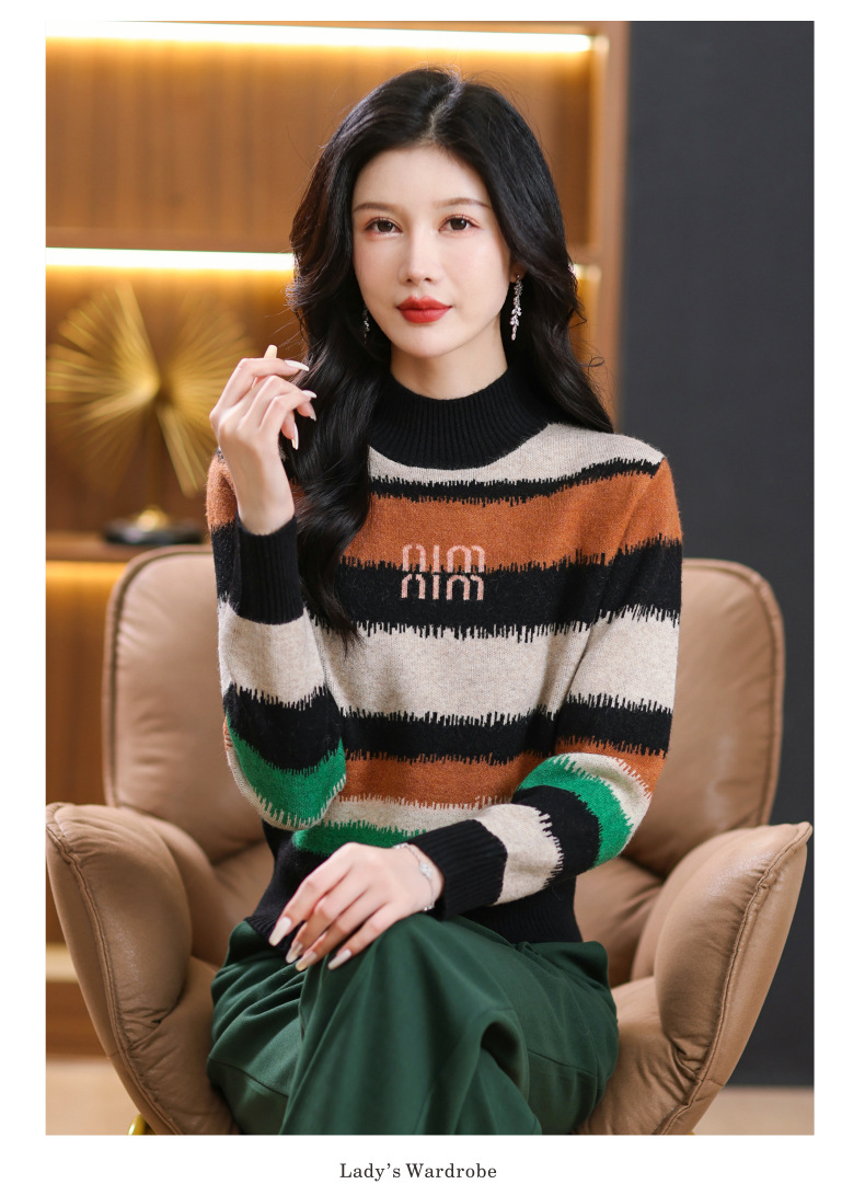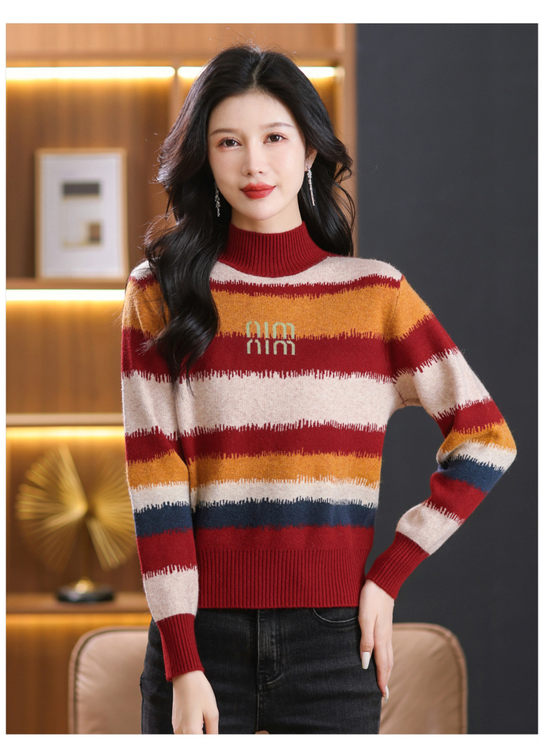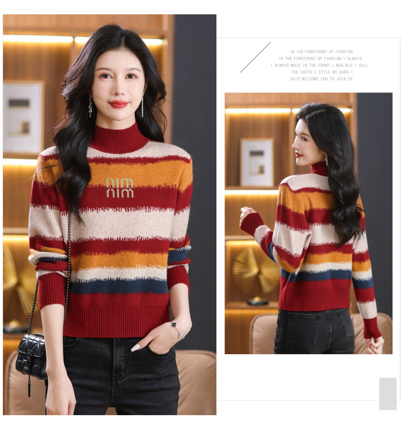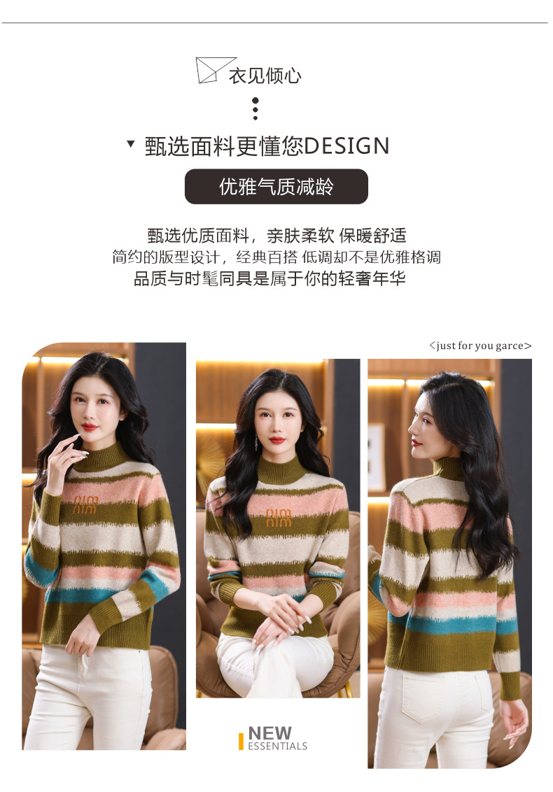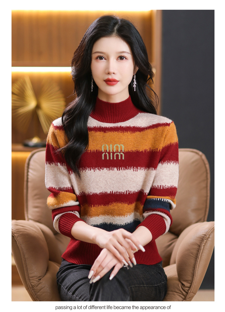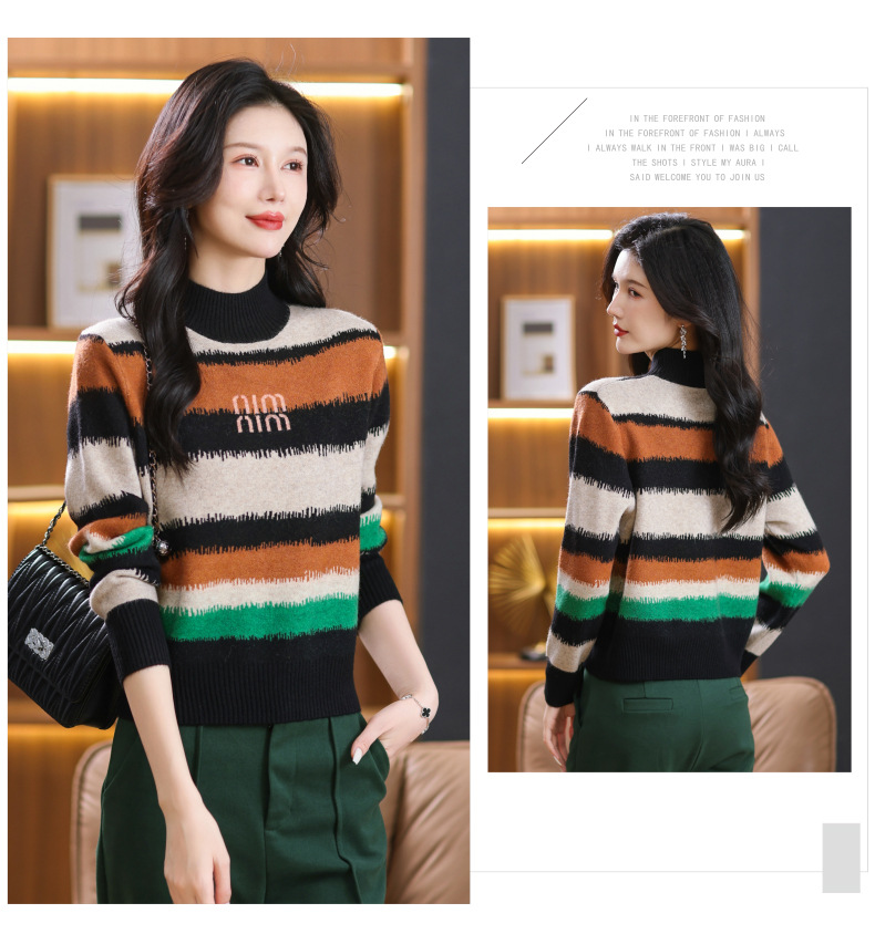 短款毛衣秋冬半高领打底衫,新款拼色时尚洋气内搭条纹上衣CC-101-35353