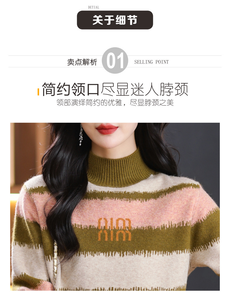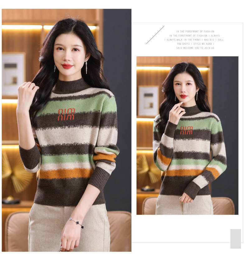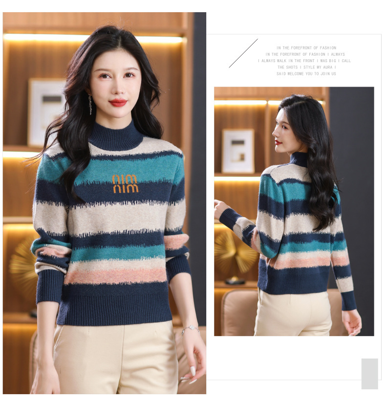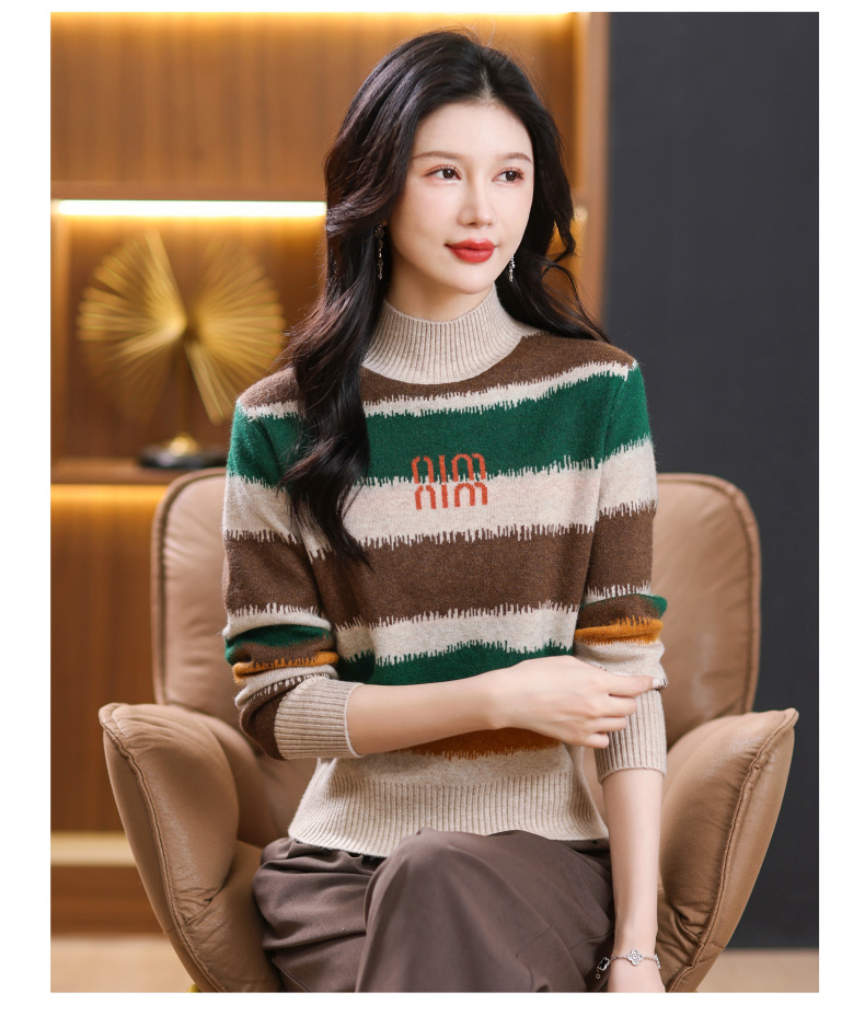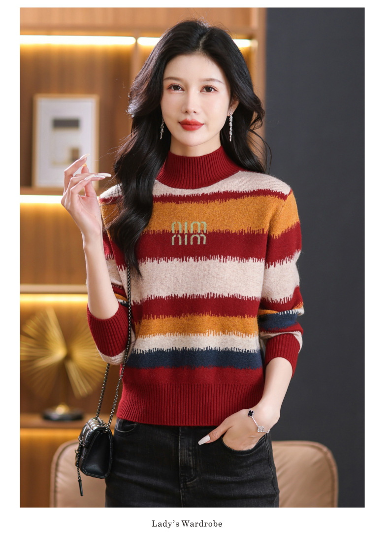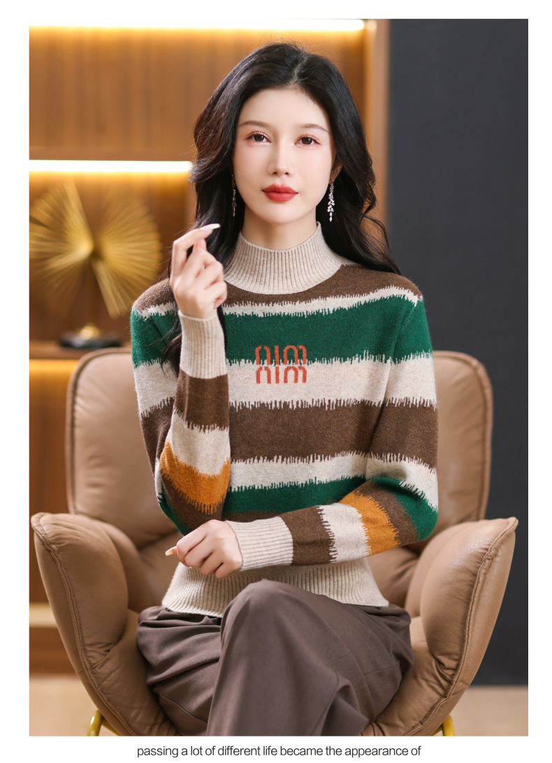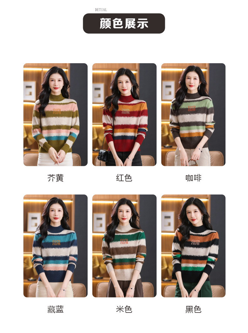 短款毛衣秋冬半高领打底衫,新款拼色时尚洋气内搭条纹上衣CC-101-35353