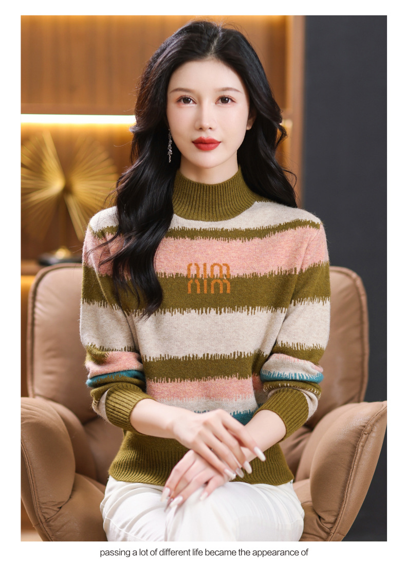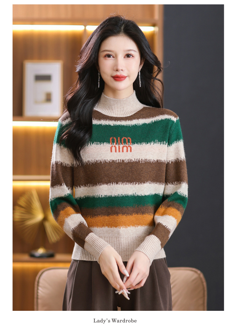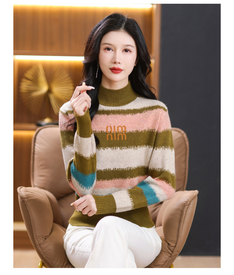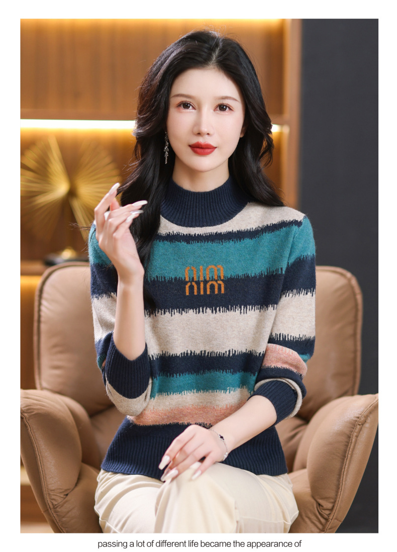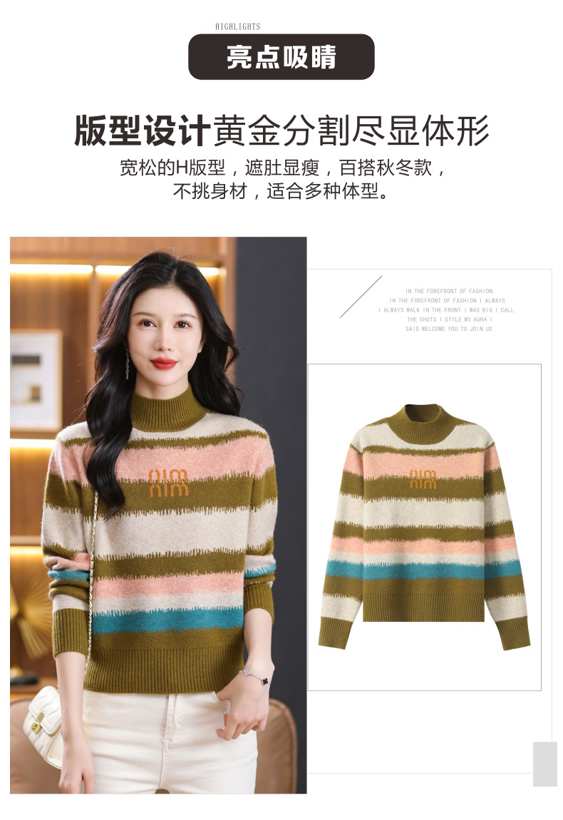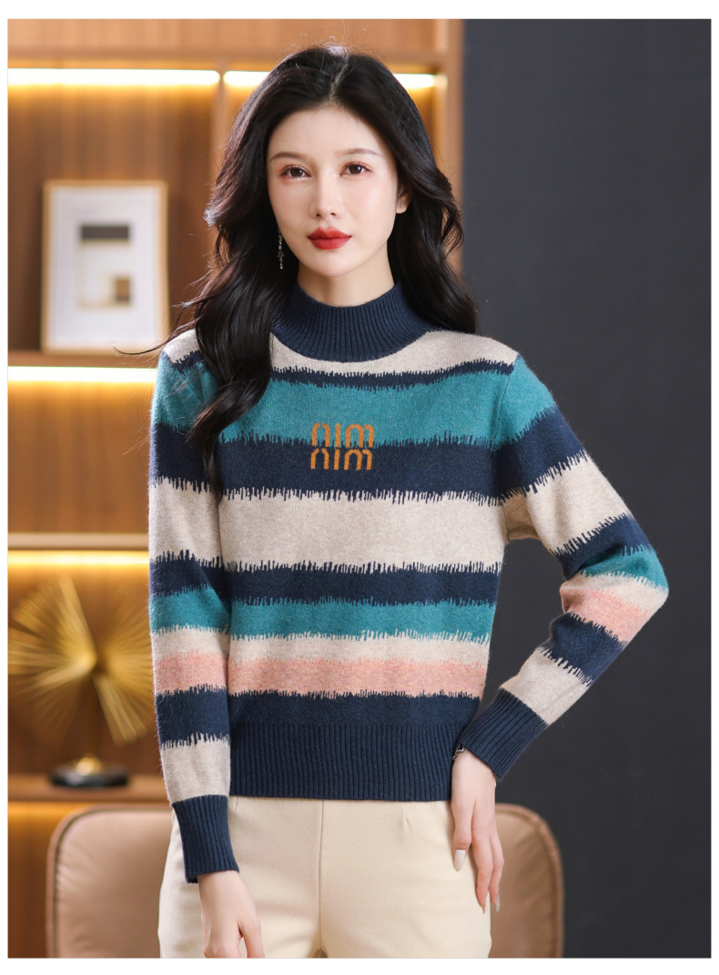 短款毛衣秋冬半高领打底衫,新款拼色时尚洋气内搭条纹上衣CC-101-35353