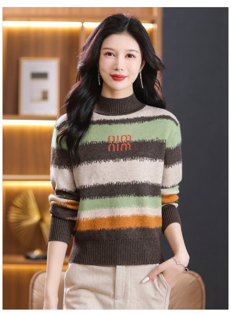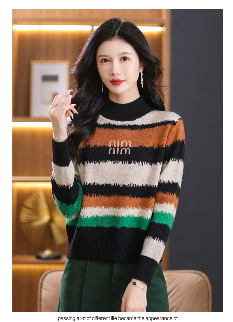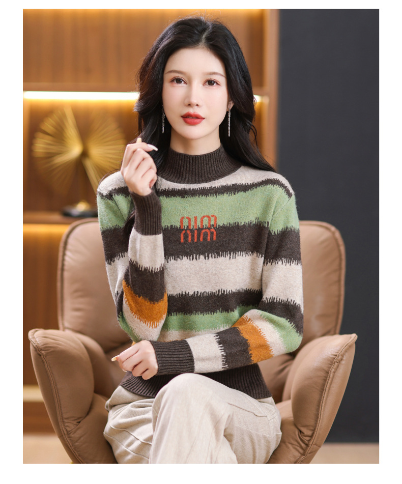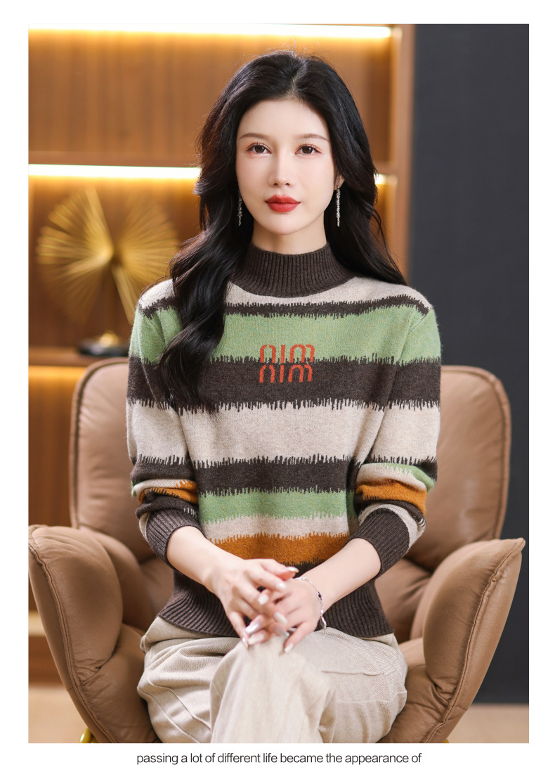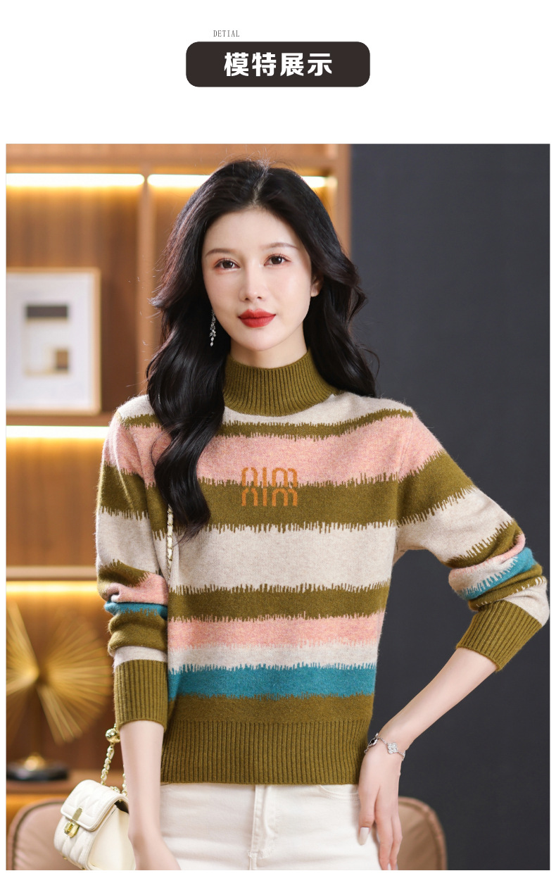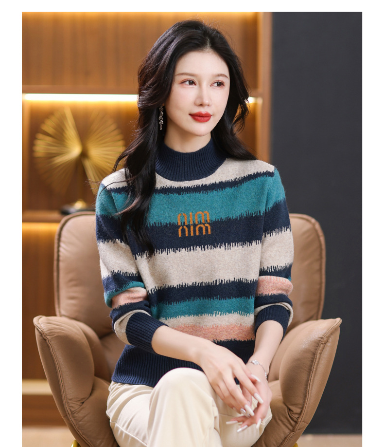 短款毛衣秋冬半高领打底衫,新款拼色时尚洋气内搭条纹上衣CC-101-35353