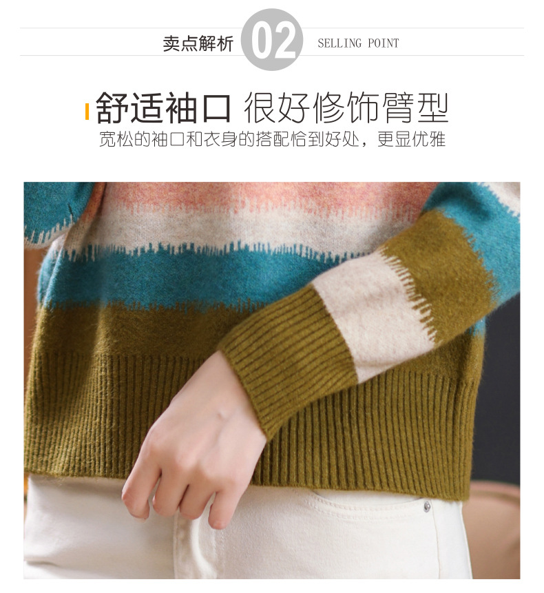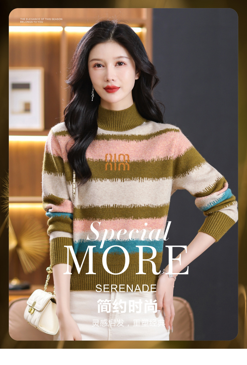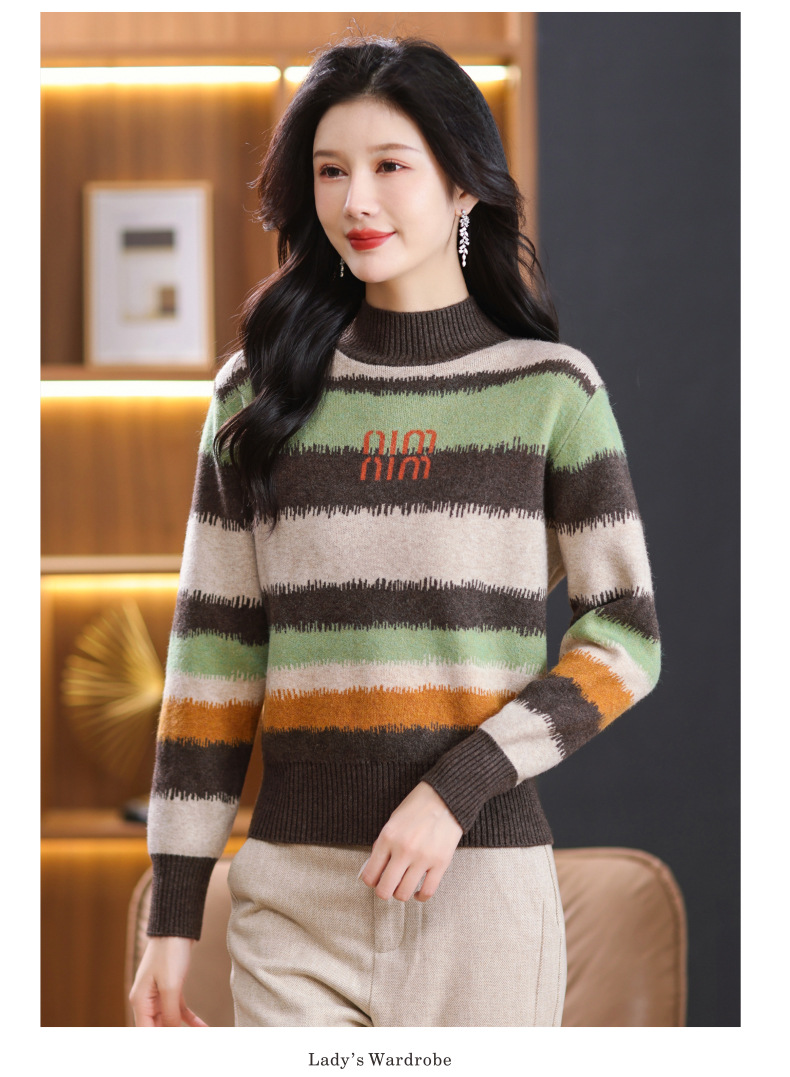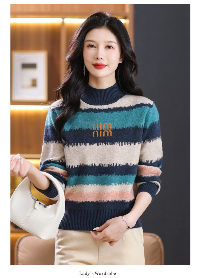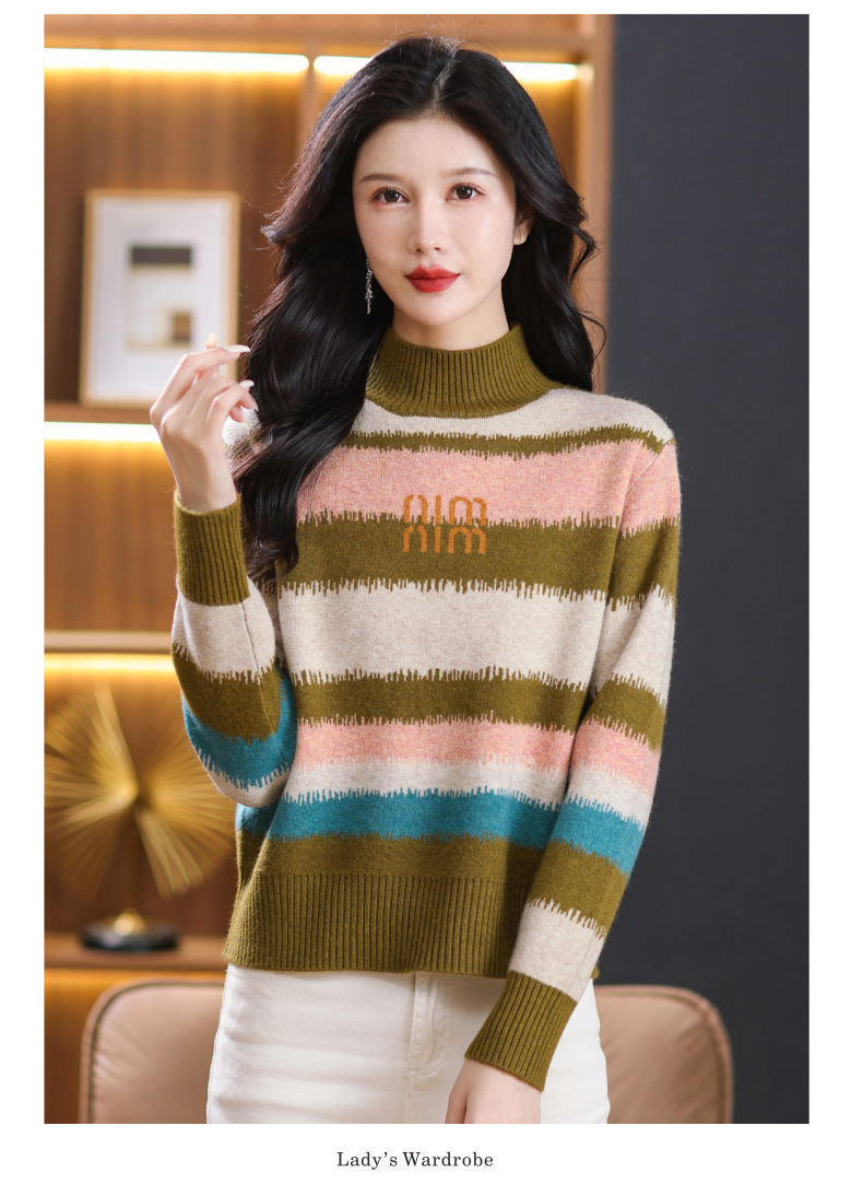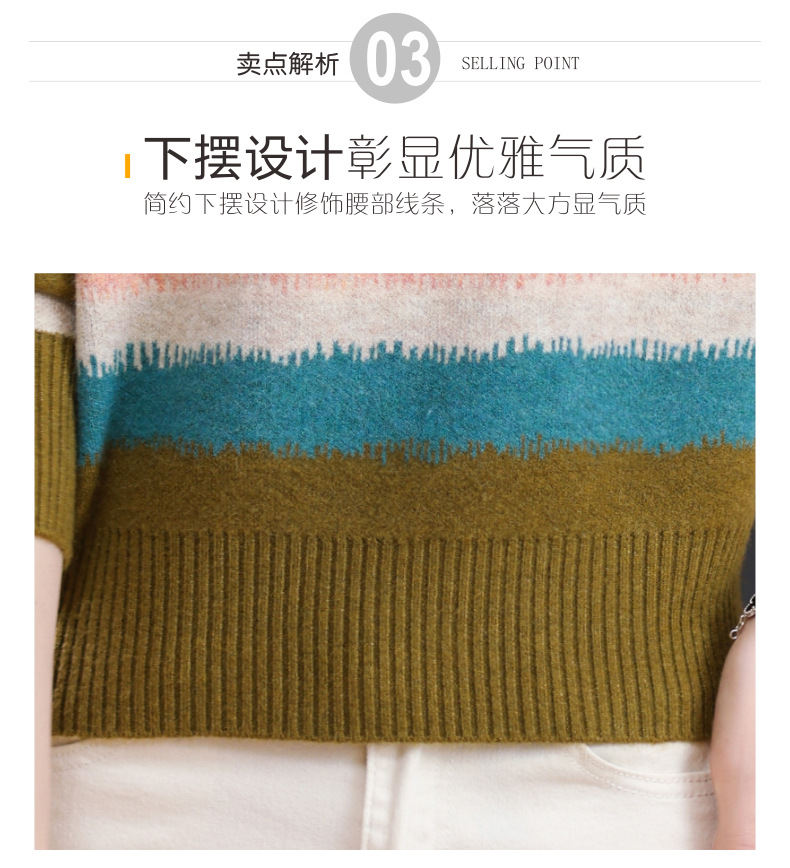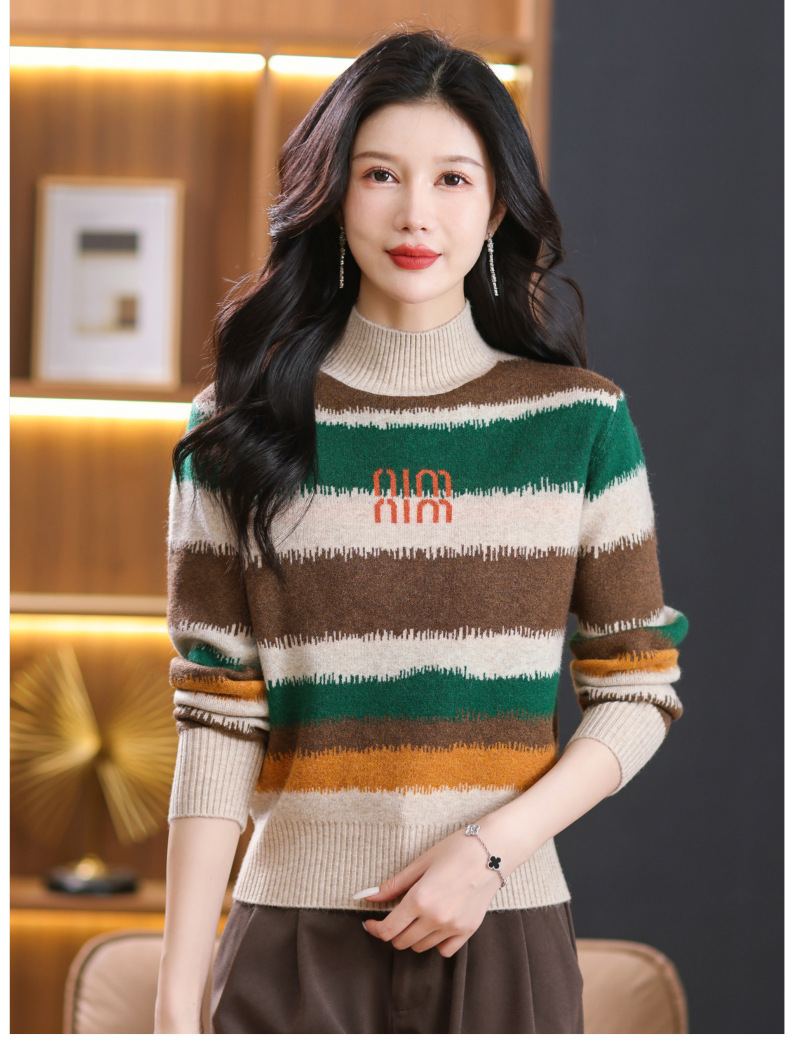 短款毛衣秋冬半高领打底衫,新款拼色时尚洋气内搭条纹上衣CC-101-35353