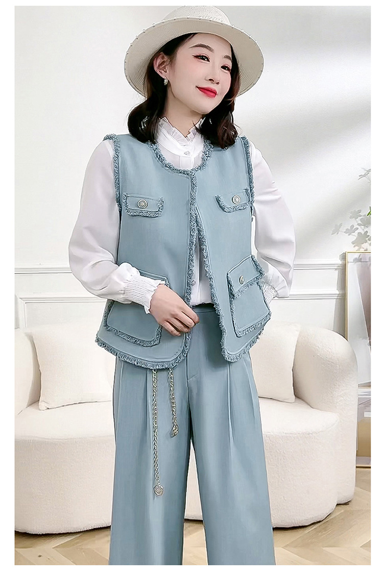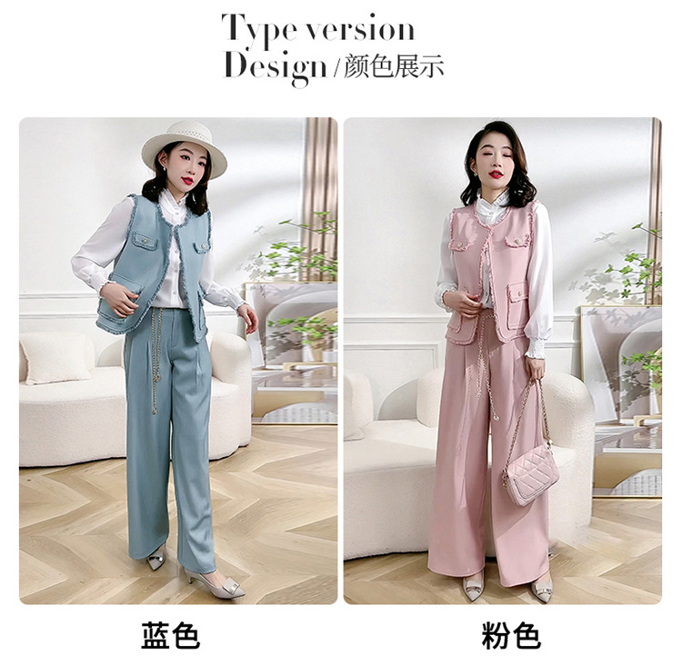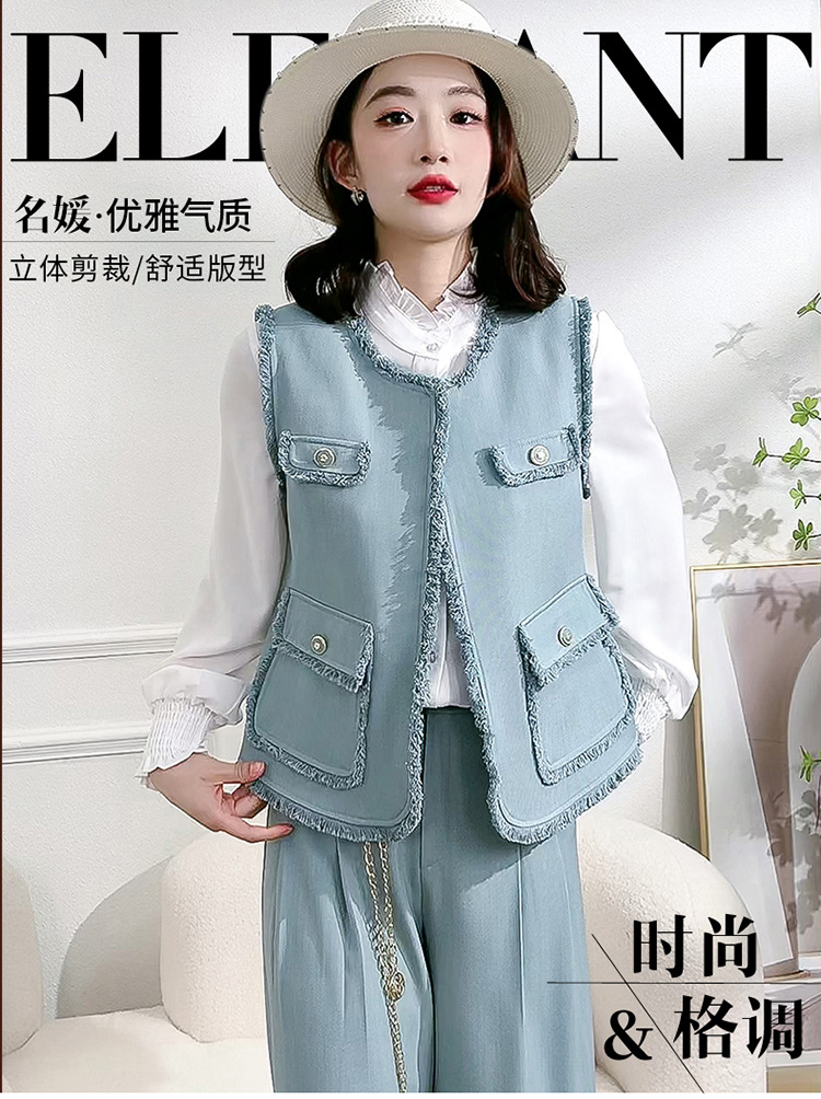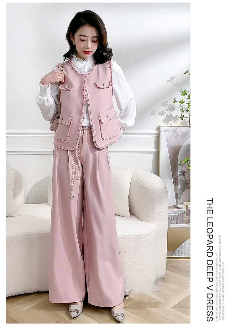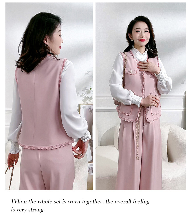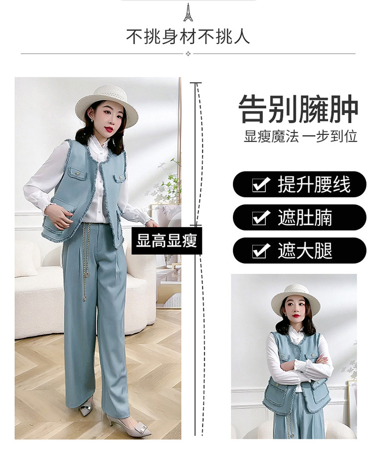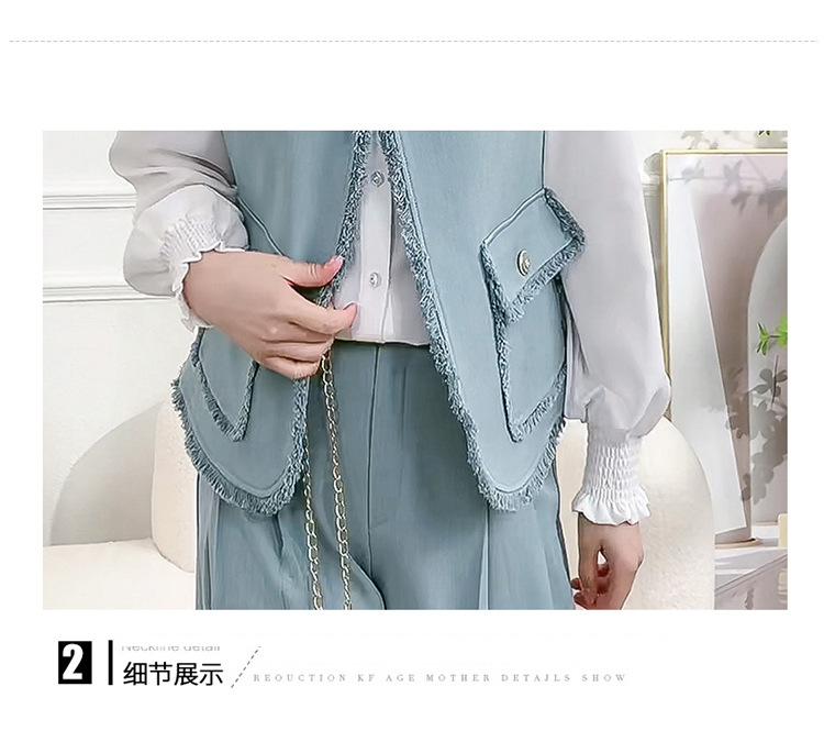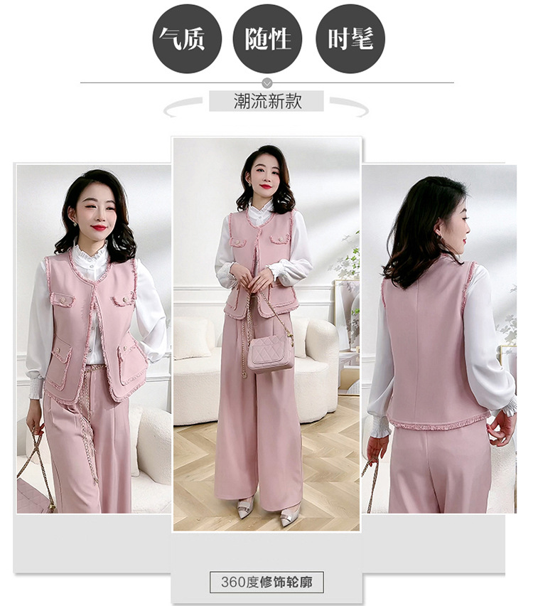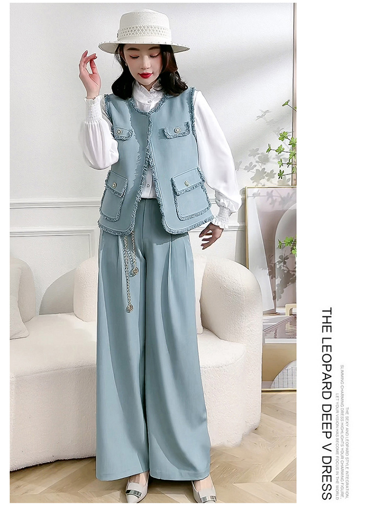 春款短款内搭衬衫+时髦外搭马甲+宽松休闲阔腿裤三件套QYM-XQD-70A2426-L