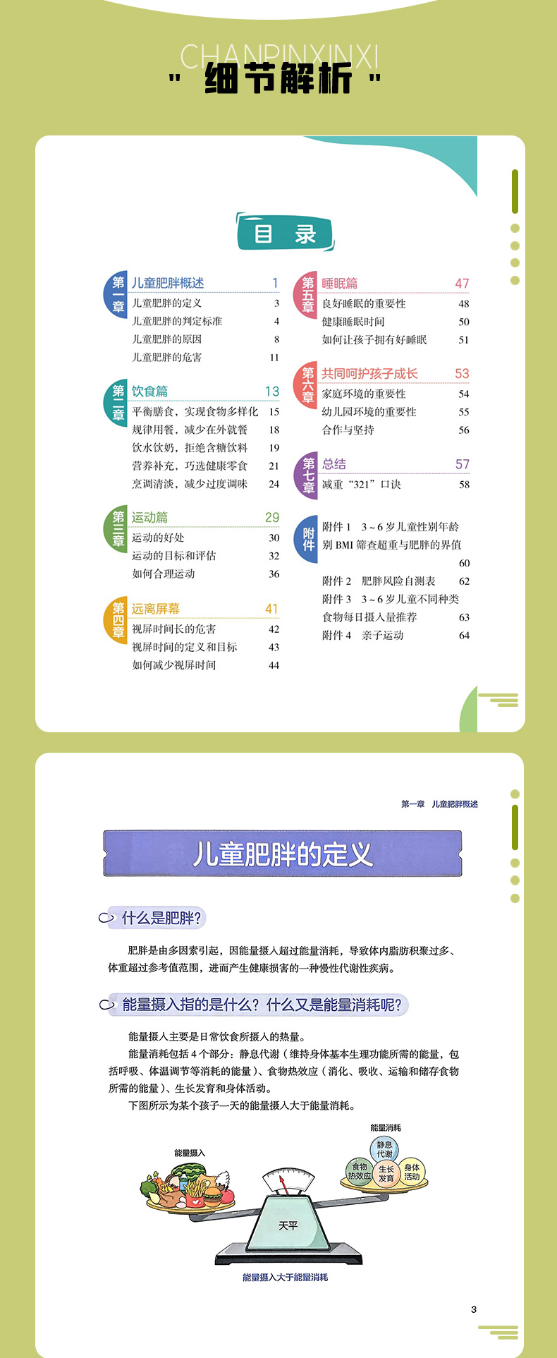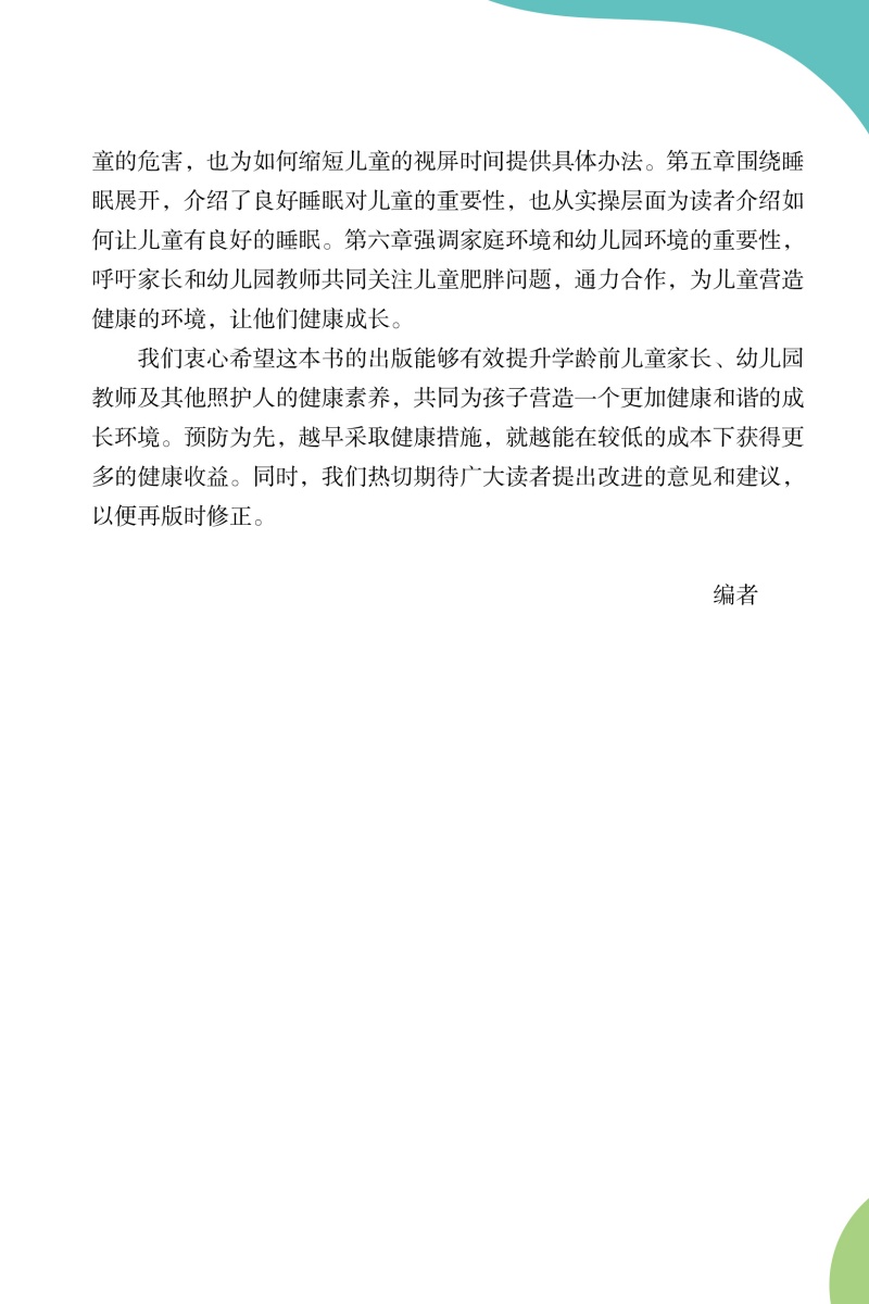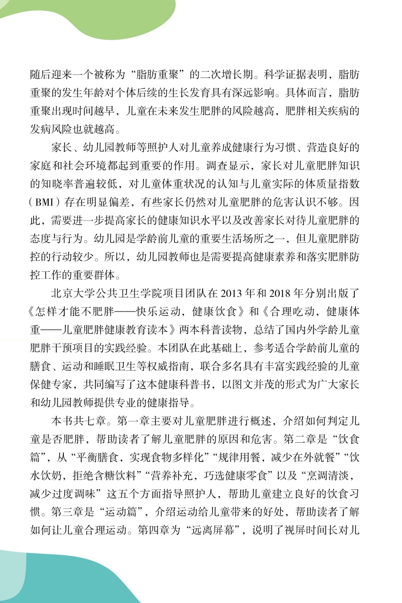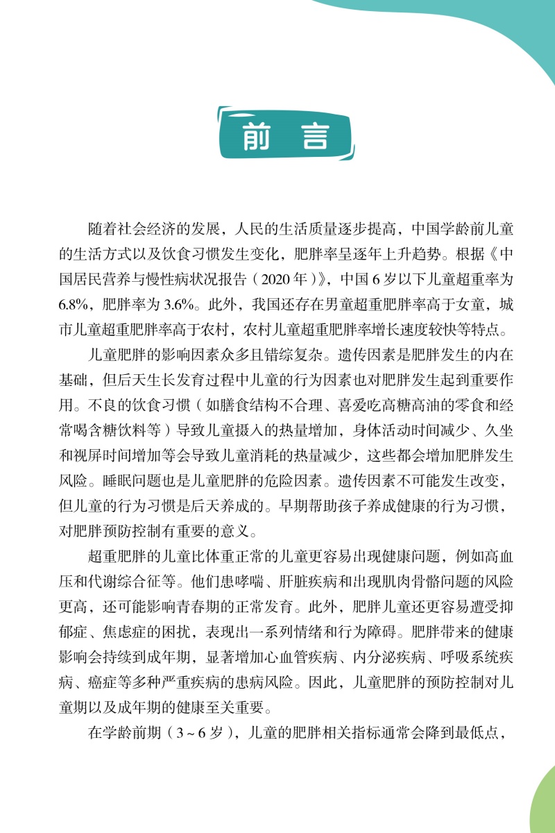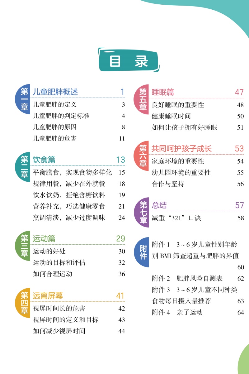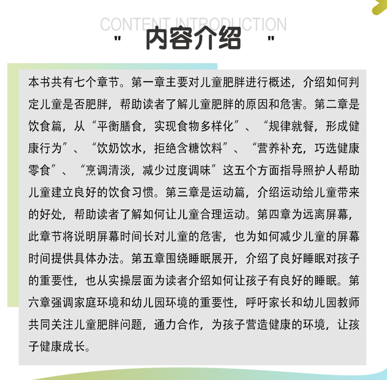 本书共有七个章节。第一章主要对儿童肥胖进行概述,介绍如何判定儿童是否肥胖,帮助读者了解儿童肥胖的原因和危害。第二章是饮食篇,从“平衡膳食,实现食物多样化”、“规律就餐,形成健康行为”、“饮奶饮水,拒绝含糖饮料”、“营养补充,巧选健康零食”、“烹调清淡,减少过度调味”这五个方面指导照护人帮助儿童建立良好的饮食习惯。第三章是运动篇,介绍运动给儿童带来的好处,帮助读者了解如何让儿童合理运动。第四章为远离屏幕,此章节将说明屏幕时间长对儿童的危害,也为如何减少儿童的屏幕时间提供具体办法。第五章围绕睡眠展开,介绍了良好睡眠对孩子的重要性,也从实操层面为读者介绍如何让孩子有良好的睡眠。第六章强调家庭环境和幼儿园环境的重要性,呼吁家长和幼儿园教师共同关注儿童肥胖问题,通力合作,为孩子营造健康的环境,让孩子健康成长。