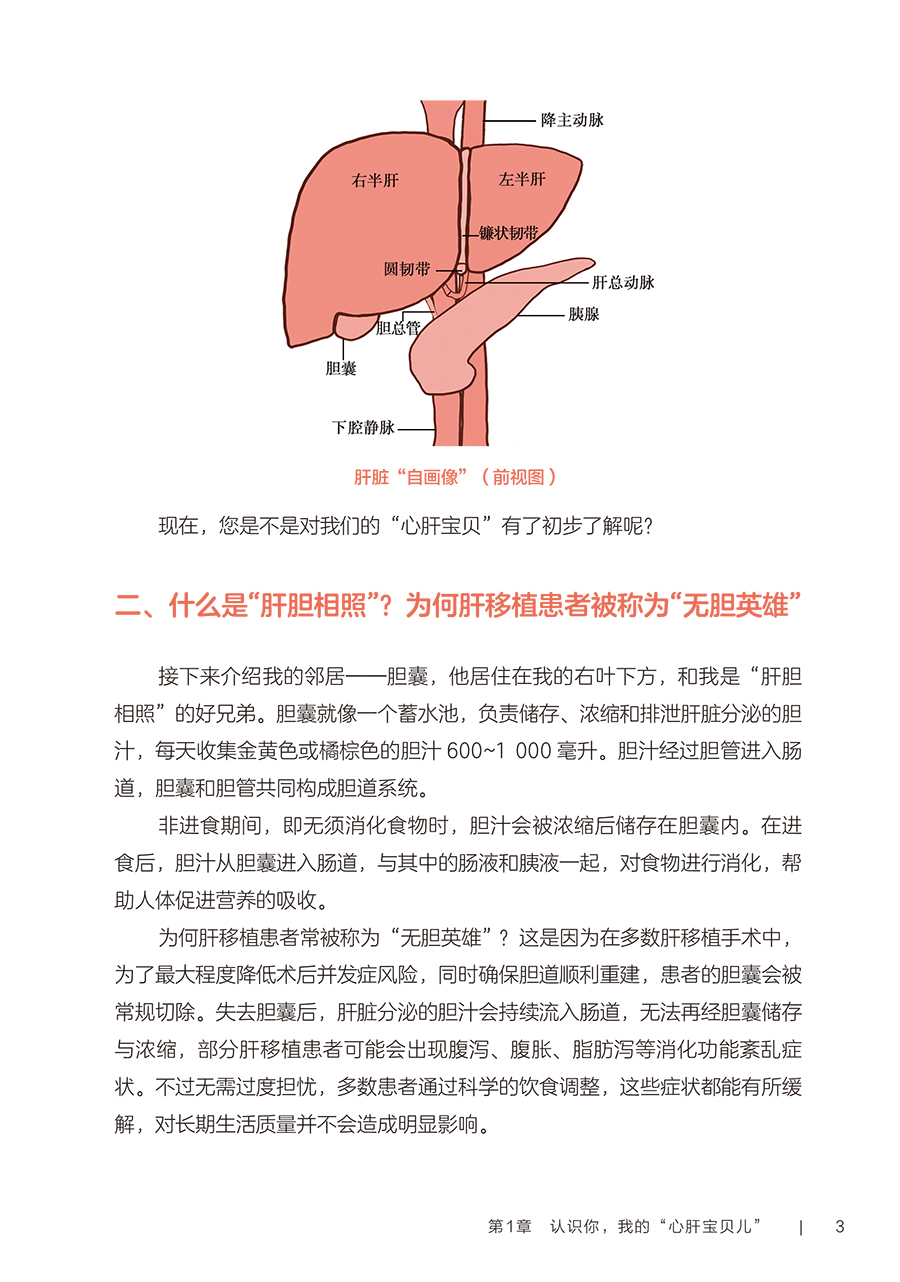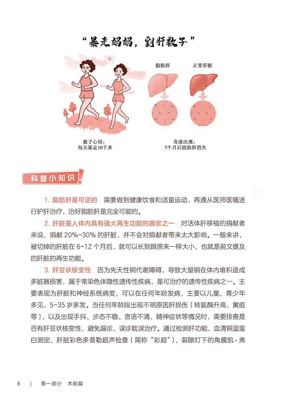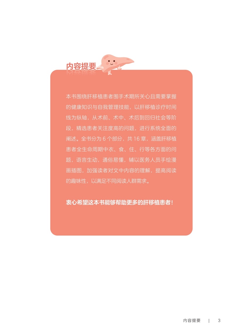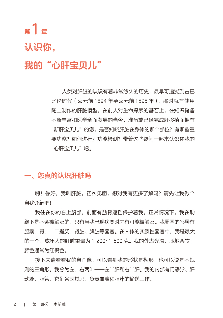 第一部分术前篇 第1章认识你,我的“心肝宝贝儿”/2 一、您真的认识肝脏吗/2 二、什么是“肝胆相照”?为何肝移植患者被称为“无胆英雄”/3 三、肝脏具有哪些功能/4 四、与肝脏相关的实验室检查项目/4 五、如何读懂肝功能生化检查报告单/5 六、肝脏影像学检查项目/5 七、肝功能评定的方法/6 第2章与肝病“过招”未来可期/10 一、肝脏是如何受损的/10 二、哪些症状提示肝功能受损/11 三、常见的肝脏疾病有哪些/11 四、见招拆招之如何“过招”肝病第一部曲——肝炎/11 五、见招拆招之如何“过招”肝病第二部曲——肝硬化/12 六、见招拆招之如何“过招”肝病第三部曲——肝癌/13 七、如何防治肝病/14 八、肝移植等待期的针对性治疗方案/14 九、人工肝是人工做的肝脏吗/15 十、肝病患者如何选择就诊科室/16 第3章雾里看花肝移植知多少/18 一、肝移植的现状/18 二、雾里看花——揭开肝移植的神秘面纱/19 三、肝移植的成功率及存活时间/19 四、哪些疾病患者适合行肝移植手术/19 五、哪些患者不适合进行肝移植/20 六、肝移植有年龄限制吗/20 七、肝癌患者能否行肝移植手术/21 八、输血经历影响肝移植吗/21 九、血型与肝移植有什么关联/22 十、肝移植的常见术式/22 十一、肝移植后,身体内会有几个肝脏/23 十二、什么是再次肝移植/24 十三、是不是肝脏功能“实在不行了”再做肝移植/24 十四、肝移植等待期能做些什么/25 十五、器官移植等待者登记需要准备的材料/25 第二部分手术篇 第4章拨云见日认识肝移植术前准备/30 一、肝移植受者术前为什么需要评估/30 二、术前评估/31 三、术前需要做哪些检查/31 四、肝移植需要配型吗/32 五、什么是术前准备/32 六、肝移植术前准备流程/33 七、肝移植术前谈话告知内容/34 八、肝移植的麻醉方式/35 九、麻醉医师为什么要术前访视/35 十、疼痛知多少/35 十一、术前该禁食还是进食/36 十二、就算做手术也要美美哒吗/36 十三、术前太紧张该怎么办/37 十四、肝移植术前需要准备的生活用品/37 十五、肝移植的手术时间有多久/38 十六、手术时,家属可以离开吗/39 十七、肝移植手术过程是怎样的/39 第5章胜利曙光配合肝移植术后监护/42 一、什么是重症监护/特级护理/42 二、肝移植术后为什么需要监护/43 三、手术后患者如何转运到重症监护室/43 四、术后重症监护通常需要多长时间/44 五、如何和疼痛说再见/44 六、术后会留置哪些管道,需要注意什么/45 七、口腔清洁的方法/47 八、如何保持身体清洁/48 九、卧床患者如何解决大、小便问题/49 十、患者翻身更换体位时需要注意什么/49 十一、重症监护期间需要监测哪些指标/50 十二、肝移植术后的近期并发症/50 第三部分术后篇 第6章一(移)路相伴一日三餐/56 一、如何做到平衡膳食/56 二、膳食的分类/57 三、肝移植术后患者什么时候可以喝水、进食/59 四、肝移植术后饮食的基本原则是什么/59 五、肝移植术后患者的饮食要求/59 六、如何制订肝移植术后膳食计划/61 七、肝移植术后患者饮食禁忌/63 八、肝移植术后哪些食物要少吃/64 九、肝移植术后患者为什么不可以吃西柚/64 十、肝移植术后患者能喝酒吗/65 十一、肝移植术后血糖升高的患者该怎么吃/66 十二、如何管理体重/66 十三、营养支持治疗/67 十四、常见饮食误区/68 第7章一直同行运动康复/72 一、运动康复的好处/72 二、什么是标准化康复训练方案/73 三、为什么需要科学运动锻炼/73 四、康复科医师如何指导运动/74 五、术后患者首次下床时需要注意什么/75 六、静脉血栓预防知多少/75 七、呼吸训练方法/76 八、肝移植术后推荐的日常运动方式/78 九、肝移植术后的运动处方是指什么/79 十、日常运动时的注意事项/83 十一、需要避免的运动项目/84 第8章一(移)生有你科学服药/86 一、肝移植术后患者需要服用哪些药物/86 二、什么是免疫抑制剂?常用的类型有哪些/86 三、肝移植术后患者为什么需要终身服用免疫抑制剂/87 四、什么是免疫抑制剂个体化治疗/87 五、免疫抑制剂为何需要联合应用/89 六、服用免疫抑制剂的注意事项/89 七、为什么要监测免疫抑制剂的血药浓度/90 八、肝移植术后常用免疫抑制剂血药浓度监测时间要求/91 九、如何调整免疫抑制剂服用时间/92 十、服用免疫抑制剂期间的饮食宜忌/92 十一、漏服、呕吐免疫抑制剂怎么办/93 十二、免疫抑制剂对生育及胎儿有影响吗/94 十三、关于疫苗接种,肝移植患者需要注意什么/94 十四、服用免疫抑制剂期间可以自行服用其他药物吗/94 十五、为什么需要强调服药依从性/95 第9章挚(植)爱感恩心理调适/98 一、肝移植术后常见心理问题/98 二、如何获得心理支援/99 三、如何调整紧张情绪/100 四、什么是心理干预/101 五、家属该如何对患者进行心理支持/101 六、供者、受者术前心理社会评估/102 七、供者、受者术后心理状态需要关注哪些方面/103 八、供者、受者心理问题干预/104 九、家属需要面对的心理压力/106 第四部分回归社会篇 第10章肝移植术后生育那些事儿/112 一、肝移植术后能结婚吗/112 二、肝移植术后可以过性生活吗/113 三、安全避孕的方法/113 四、肝移植术后能生育吗/115 五、是否选择妊娠应考虑哪些方面/116 六、女性患者妊娠对移植肝有何影响/116 七、接受过肝移植手术的女性妊娠后母体和胎儿面临哪些风险/116 八、服用免