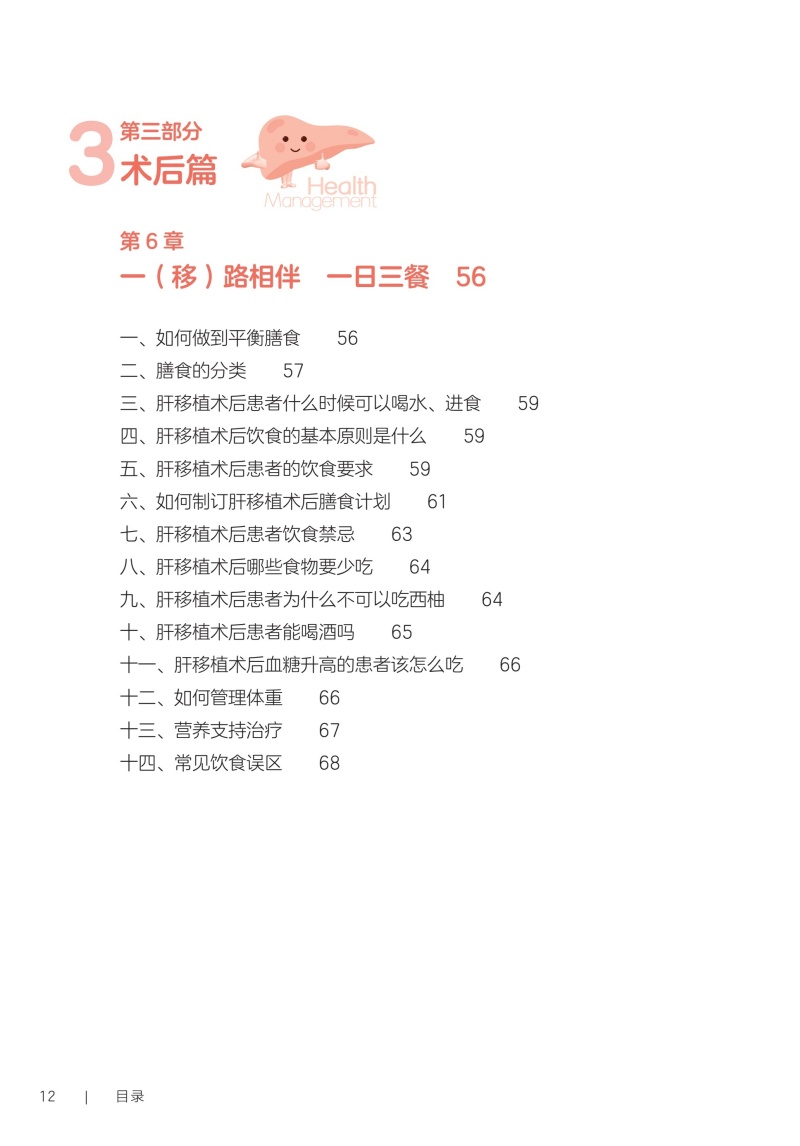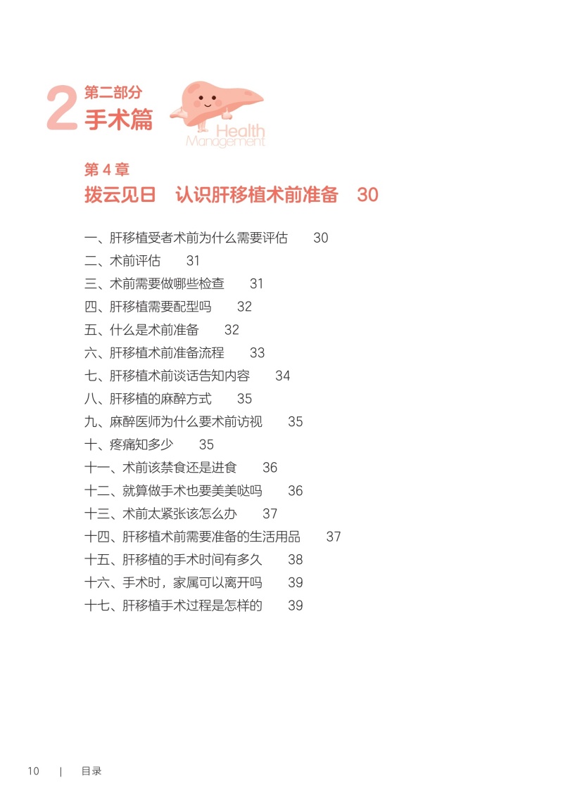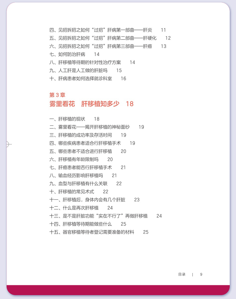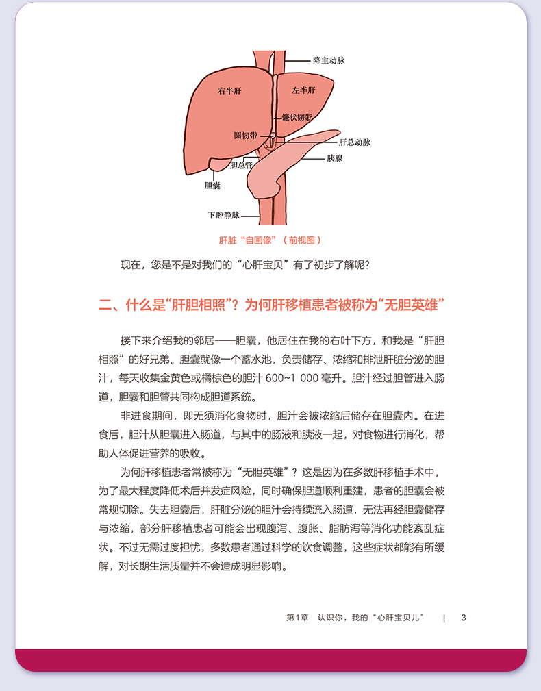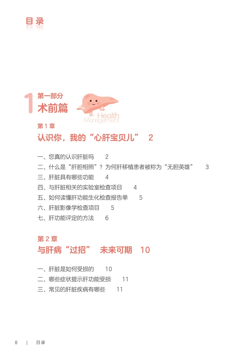第一部分术前篇 第1章认识你,我的“心肝宝贝儿”/2 一、您真的认识肝脏吗/2 二、什么是“肝胆相照”?为何肝移植患者被称为“无胆英雄”/3 三、肝脏具有哪些功能/4 四、与肝脏相关的实验室检查项目/4 五、如何读懂肝功能生化检查报告单/5 六、肝脏影像学检查项目/5 七、肝功能评定的方法/6 第2章与肝病“过招”未来可期/10 一、肝脏是如何受损的/10 二、哪些症状提示肝功能受损/11 三、常见的肝脏疾病有哪些/11 四、见招拆招之如何“过招”肝病第一部曲——肝炎/11 五、见招拆招之如何“过招”肝病第二部曲——肝硬化/12 六、见招拆招之如何“过招”肝病第三部曲——肝癌/13 七、如何防治肝病/14 八、肝移植等待期的针对性治疗方案/14 九、人工肝是人工做的肝脏吗/15 十、肝病患者如何选择就诊科室/16 第3章雾里看花肝移植知多少/18 一、肝移植的现状/18 二、雾里看花——揭开肝移植的神秘面纱/19 三、肝移植的成功率及存活时间/19 四、哪些疾病患者适合行肝移植手术/19 五、哪些患者不适合进行肝移植/20 六、肝移植有年龄限制吗/20 七、肝癌患者能否行肝移植手术/21 八、输血经历影响肝移植吗/21 九、血型与肝移植有什么关联/22 十、肝移植的常见术式/22 十一、肝移植后,身体内会有几个肝脏/23 十二、什么是再次肝移植/24 十三、是不是肝脏功能“实在不行了”再做肝移植/24 十四、肝移植等待期能做些什么/25 十五、器官移植等待者登记需要准备的材料/25 第二部分手术篇 第4章拨云见日认识肝移植术前准备/30 一、肝移植受者术前为什么需要评估/30 二、术前评估/31 三、术前需要做哪些检查/31 四、肝移植需要配型吗/32 五、什么是术前准备/32 六、肝移植术前准备流程/33 七、肝移植术前谈话告知内容/34 八、肝移植的麻醉方式/35 九、麻醉医师为什么要术前访视/35 十、疼痛知多少/35 十一、术前该禁食还是进食/36 十二、就算做手术也要美美哒吗/36 十三、术前太紧张该怎么办/37 十四、肝移植术前需要准备的生活用品/37 十五、肝移植的手术时间有多久/38 十六、手术时,家属可以离开吗/39 十七、肝移植手术过程是怎样的/39 第5章胜利曙光配合肝移植术后监护/42 一、什么是重症监护/特级护理/42 二、肝移植术后为什么需要监护/43 三、手术后患者如何转运到重症监护室/43 四、术后重症监护通常需要多长时间/44 五、如何和疼痛说再见/44 六、术后会留置哪些管道,需要注意什么/45 七、口腔清洁的方法/47 八、如何保持身体清洁/48 九、卧床患者如何解决大、小便问题/49 十、患者翻身更换体位时需要注意什么/49 十一、重症监护期间需要监测哪些指标/50 十二、肝移植术后的近期并发症/50 第三部分术后篇 第6章一(移)路相伴一日三餐/56 一、如何做到平衡膳食/56 二、膳食的分类/57 三、肝移植术后患者什么时候可以喝水、进食/59 四、肝移植术后饮食的基本原则是什么/59 五、肝移植术后患者的饮食要求/59 六、如何制订肝移植术后膳食计划/61 七、肝移植术后患者饮食禁忌/63 八、肝移植术后哪些食物要少吃/64 九、肝移植术后患者为什么不可以吃西柚/64 十、肝移植术后患者能喝酒吗/65 十一、肝移植术后血糖升高的患者该怎么吃/66 十二、如何管理体重/66 十三、营养支持治疗/67 十四、常见饮食误区/68 第7章一直同行运动康复/72 一、运动康复的好处/72 二、什么是标准化康复训练方案/73 三、为什么需要科学运动锻炼/73 四、康复科医师如何指导运动/74 五、术后患者首次下床时需要注意什么/75 六、静脉血栓预防知多少/75 七、呼吸训练方法/76 八、肝移植术后推荐的日常运动方式/78 九、肝移植术后的运动处方是指什么/79 十、日常运动时的注意事项/83 十一、需要避免的运动项目/84 第8章一(移)生有你科学服药/86 一、肝移植术后患者需要服用哪些药物/86 二、什么是免疫抑制剂?常用的类型有哪些/86 三、肝移植术后患者为什么需要终身服用免疫抑制剂/87 四、什么是免疫抑制剂个体化治疗/87 五、免疫抑制剂为何需要联合应用/89 六、服用免疫抑制剂的注意事项/89 七、为什么要监测免疫抑制剂的血药浓度/90 八、肝移植术后常用免疫抑制剂血药浓度监测时间要求/91 九、如何调整免疫抑制剂服用时间/92 十、服用免疫抑制剂期间的饮食宜忌/92 十一、漏服、呕吐免疫抑制剂怎么办/93 十二、免疫抑制剂对生育及胎儿有影响吗/94 十三、关于疫苗接种,肝移植患者需要注意什么/94 十四、服用免疫抑制剂期间可以自行服用其他药物吗/94 十五、为什么需要强调服药依从性/95 第9章挚(植)爱感恩心理调适/98 一、肝移植术后常见心理问题/98 二、如何获得心理支援/99 三、如何调整紧张情绪/100 四、什么是心理干预/101 五、家属该如何对患者进行心理支持/101 六、供者、受者术前心理社会评估/102 七、供者、受者术后心理状态需要关注哪些方面/103 八、供者、受者心理问题干预/104 九、家属需要面对的心理压力/106 第四部分回归社会篇 第10章肝移植术后生育那些事儿/112 一、肝移植术后能结婚吗/112 二、肝移植术后可以过性生活吗/113 三、安全避孕的方法/113 四、肝移植术后能生育吗/115 五、是否选择妊娠应考虑哪些方面/116 六、女性患者妊娠对移植肝有何影响/116 七、接受过肝移植手术的女性妊娠后母体和胎儿面临哪些风险/116 八、服用免