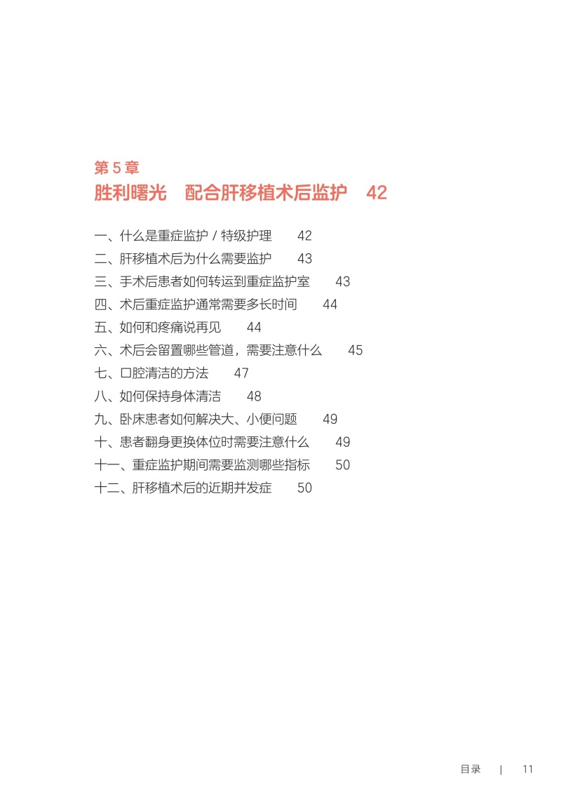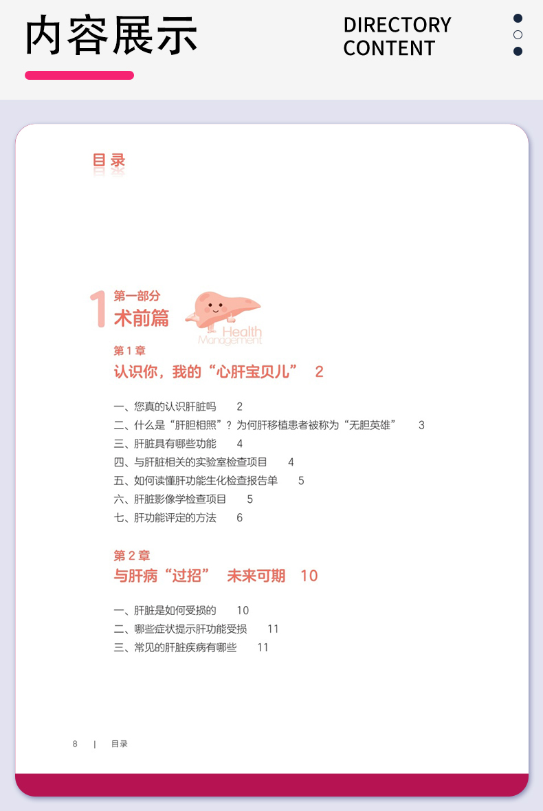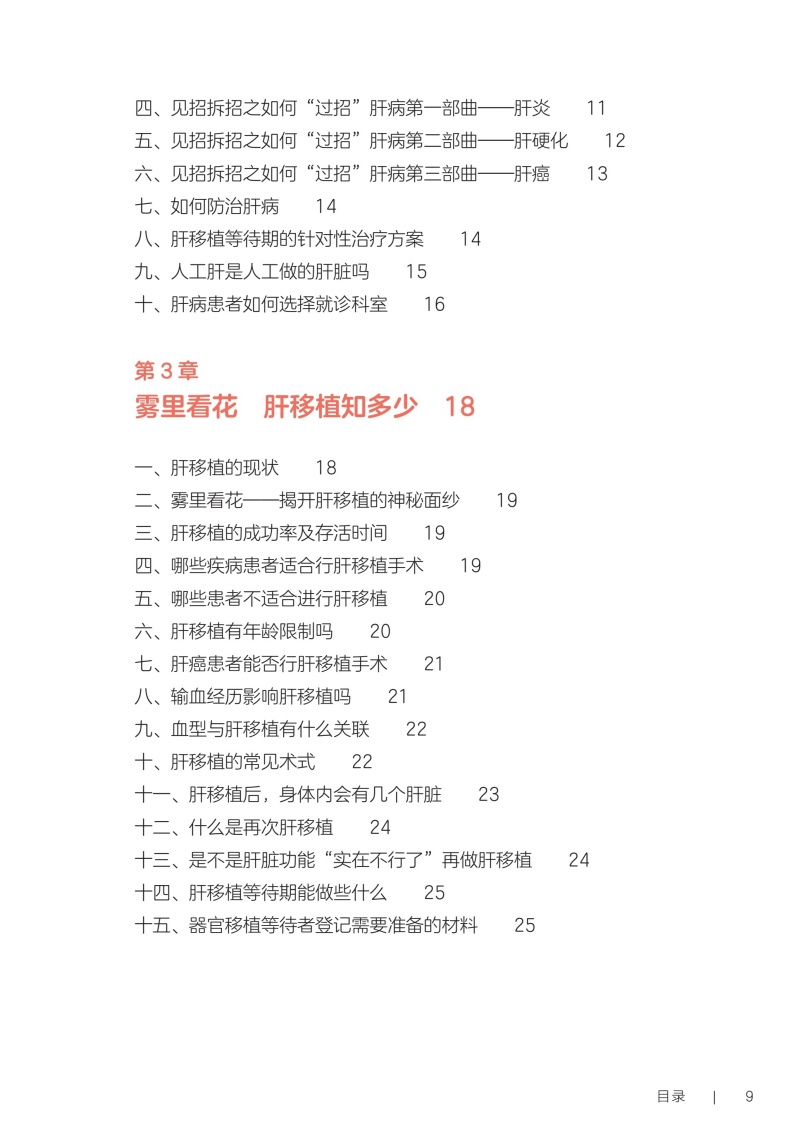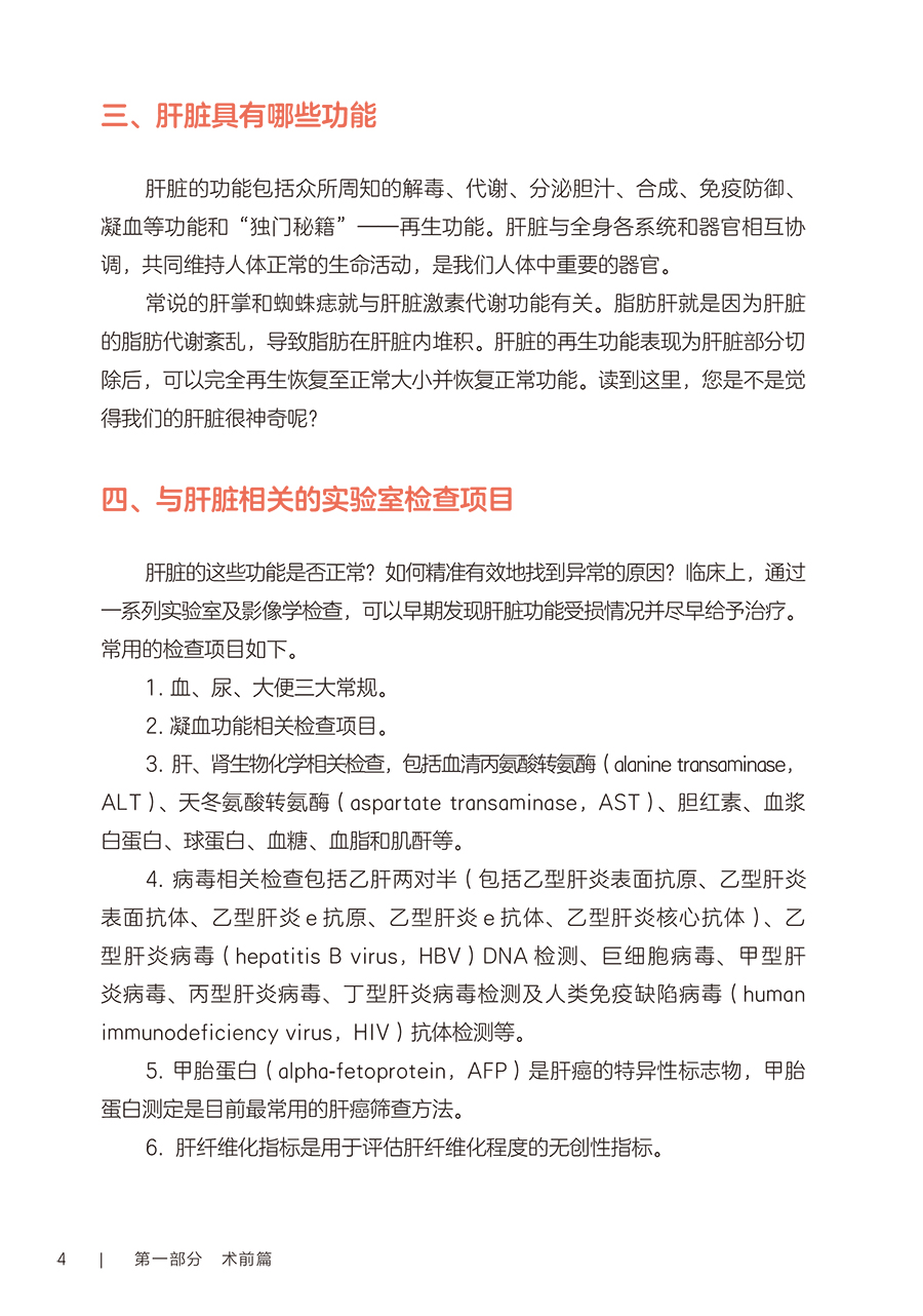 第一部分术前篇 第1章认识你,我的“心肝宝贝儿”/2 一、您真的认识肝脏吗/2 二、什么是“肝胆相照”?为何肝移植患者被称为“无胆英雄”/3 三、肝脏具有哪些功能/4 四、与肝脏相关的实验室检查项目/4 五、如何读懂肝功能生化检查报告单/5 六、肝脏影像学检查项目/5 七、肝功能评定的方法/6 第2章与肝病“过招”未来可期/10 一、肝脏是如何受损的/10 二、哪些症状提示肝功能受损/11 三、常见的肝脏疾病有哪些/11 四、见招拆招之如何“过招”肝病第一部曲——肝炎/11 五、见招拆招之如何“过招”肝病第二部曲——肝硬化/12 六、见招拆招之如何“过招”肝病第三部曲——肝癌/13 七、如何防治肝病/14 八、肝移植等待期的针对性治疗方案/14 九、人工肝是人工做的肝脏吗/15 十、肝病患者如何选择就诊科室/16 第3章雾里看花肝移植知多少/18 一、肝移植的现状/18 二、雾里看花——揭开肝移植的神秘面纱/19 三、肝移植的成功率及存活时间/19 四、哪些疾病患者适合行肝移植手术/19 五、哪些患者不适合进行肝移植/20 六、肝移植有年龄限制吗/20 七、肝癌患者能否行肝移植手术/21 八、输血经历影响肝移植吗/21 九、血型与肝移植有什么关联/22 十、肝移植的常见术式/22 十一、肝移植后,身体内会有几个肝脏/23 十二、什么是再次肝移植/24 十三、是不是肝脏功能“实在不行了”再做肝移植/24 十四、肝移植等待期能做些什么/25 十五、器官移植等待者登记需要准备的材料/25 第二部分手术篇 第4章拨云见日认识肝移植术前准备/30 一、肝移植受者术前为什么需要评估/30 二、术前评估/31 三、术前需要做哪些检查/31 四、肝移植需要配型吗/32 五、什么是术前准备/32 六、肝移植术前准备流程/33 七、肝移植术前谈话告知内容/34 八、肝移植的麻醉方式/35 九、麻醉医师为什么要术前访视/35 十、疼痛知多少/35 十一、术前该禁食还是进食/36 十二、就算做手术也要美美哒吗/36 十三、术前太紧张该怎么办/37 十四、肝移植术前需要准备的生活用品/37 十五、肝移植的手术时间有多久/38 十六、手术时,家属可以离开吗/39 十七、肝移植手术过程是怎样的/39 第5章胜利曙光配合肝移植术后监护/42 一、什么是重症监护/特级护理/42 二、肝移植术后为什么需要监护/43 三、手术后患者如何转运到重症监护室/43 四、术后重症监护通常需要多长时间/44 五、如何和疼痛说再见/44 六、术后会留置哪些管道,需要注意什么/45 七、口腔清洁的方法/47 八、如何保持身体清洁/48 九、卧床患者如何解决大、小便问题/49 十、患者翻身更换体位时需要注意什么/49 十一、重症监护期间需要监测哪些指标/50 十二、肝移植术后的近期并发症/50 第三部分术后篇 第6章一(移)路相伴一日三餐/56 一、如何做到平衡膳食/56 二、膳食的分类/57 三、肝移植术后患者什么时候可以喝水、进食/59 四、肝移植术后饮食的基本原则是什么/59 五、肝移植术后患者的饮食要求/59 六、如何制订肝移植术后膳食计划/61 七、肝移植术后患者饮食禁忌/63 八、肝移植术后哪些食物要少吃/64 九、肝移植术后患者为什么不可以吃西柚/64 十、肝移植术后患者能喝酒吗/65 十一、肝移植术后血糖升高的患者该怎么吃/66 十二、如何管理体重/66 十三、营养支持治疗/67 十四、常见饮食误区/68 第7章一直同行运动康复/72 一、运动康复的好处/72 二、什么是标准化康复训练方案/73 三、为什么需要科学运动锻炼/73 四、康复科医师如何指导运动/74 五、术后患者首次下床时需要注意什么/75 六、静脉血栓预防知多少/75 七、呼吸训练方法/76 八、肝移植术后推荐的日常运动方式/78 九、肝移植术后的运动处方是指什么/79 十、日常运动时的注意事项/83 十一、需要避免的运动项目/84 第8章一(移)生有你科学服药/86 一、肝移植术后患者需要服用哪些药物/86 二、什么是免疫抑制剂?常用的类型有哪些/86 三、肝移植术后患者为什么需要终身服用免疫抑制剂/87 四、什么是免疫抑制剂个体化治疗/87 五、免疫抑制剂为何需要联合应用/89 六、服用免疫抑制剂的注意事项/89 七、为什么要监测免疫抑制剂的血药浓度/90 八、肝移植术后常用免疫抑制剂血药浓度监测时间要求/91 九、如何调整免疫抑制剂服用时间/92 十、服用免疫抑制剂期间的饮食宜忌/92 十一、漏服、呕吐免疫抑制剂怎么办/93 十二、免疫抑制剂对生育及胎儿有影响吗/94 十三、关于疫苗接种,肝移植患者需要注意什么/94 十四、服用免疫抑制剂期间可以自行服用其他药物吗/94 十五、为什么需要强调服药依从性/95 第9章挚(植)爱感恩心理调适/98 一、肝移植术后常见心理问题/98 二、如何获得心理支援/99 三、如何调整紧张情绪/100 四、什么是心理干预/101 五、家属该如何对患者进行心理支持/101 六、供者、受者术前心理社会评估/102 七、供者、受者术后心理状态需要关注哪些方面/103 八、供者、受者心理问题干预/104 九、家属需要面对的心理压力/106 第四部分回归社会篇 第10章肝移植术后生育那些事儿/112 一、肝移植术后能结婚吗/112 二、肝移植术后可以过性生活吗/113 三、安全避孕的方法/113 四、肝移植术后能生育吗/115 五、是否选择妊娠应考虑哪些方面/116 六、女性患者妊娠对移植肝有何影响/116 七、接受过肝移植手术的女性妊娠后母体和胎儿面临哪些风险/116 八、服用免