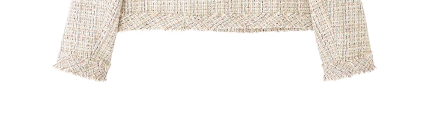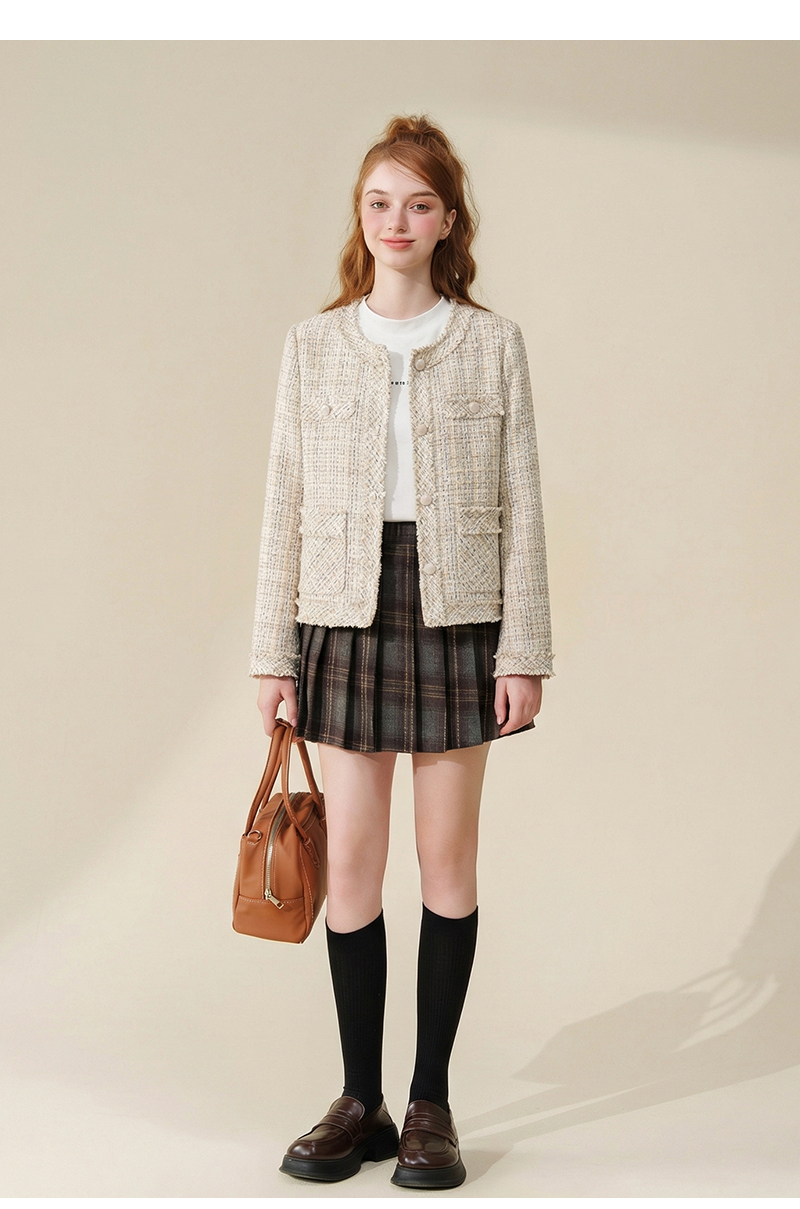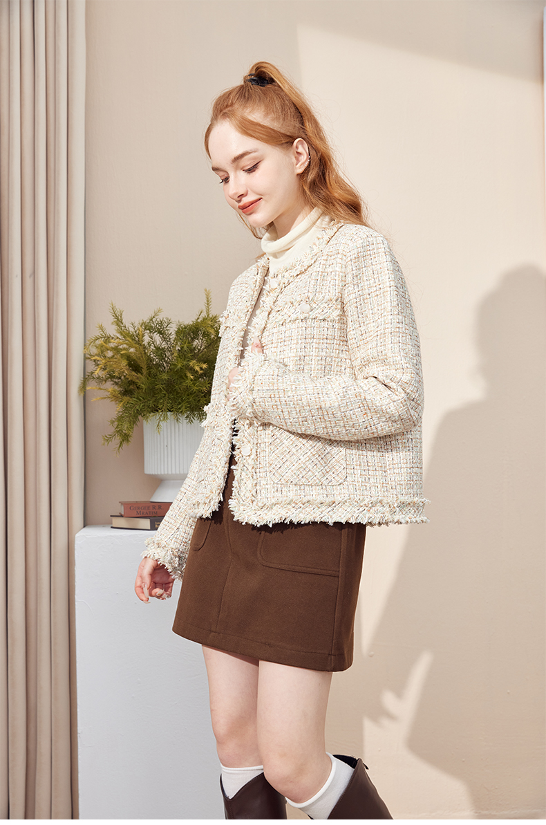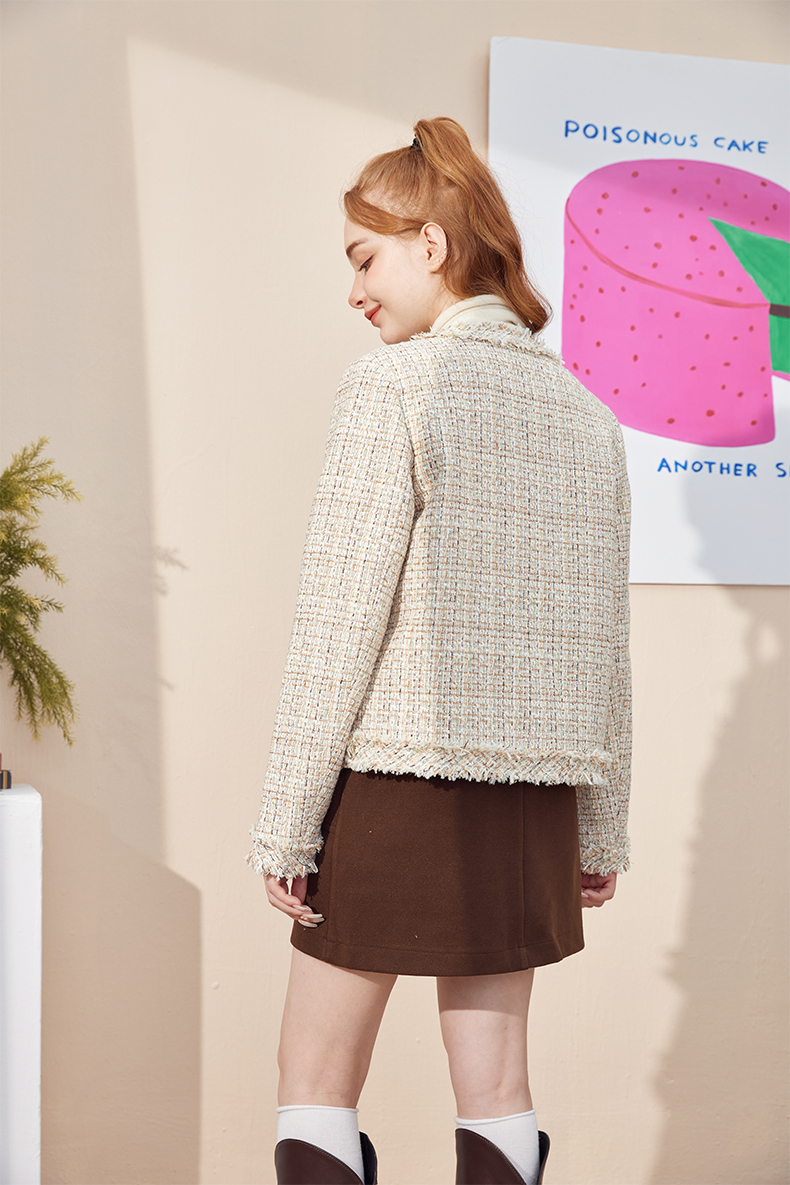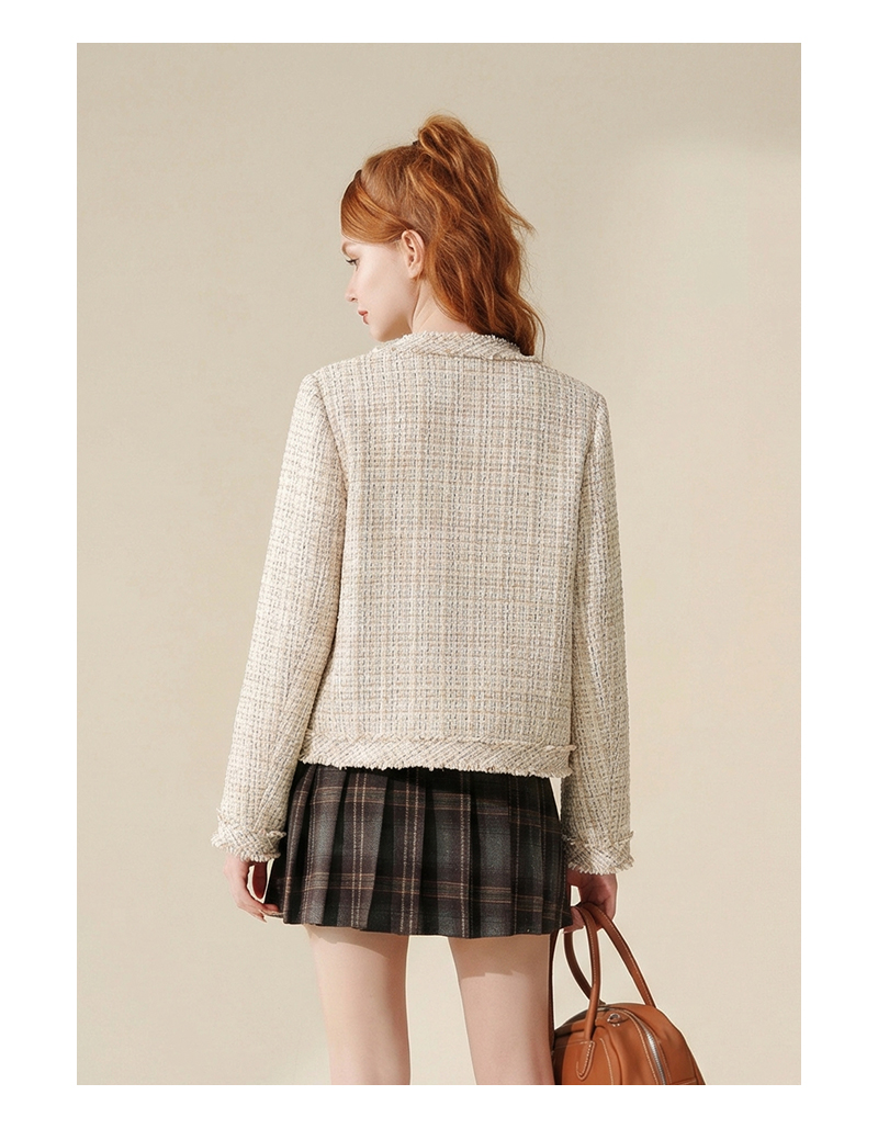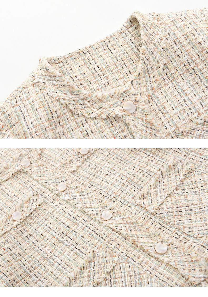 法式气质款显瘦圆领毛边拼接粗花呢小香风外套J3241637