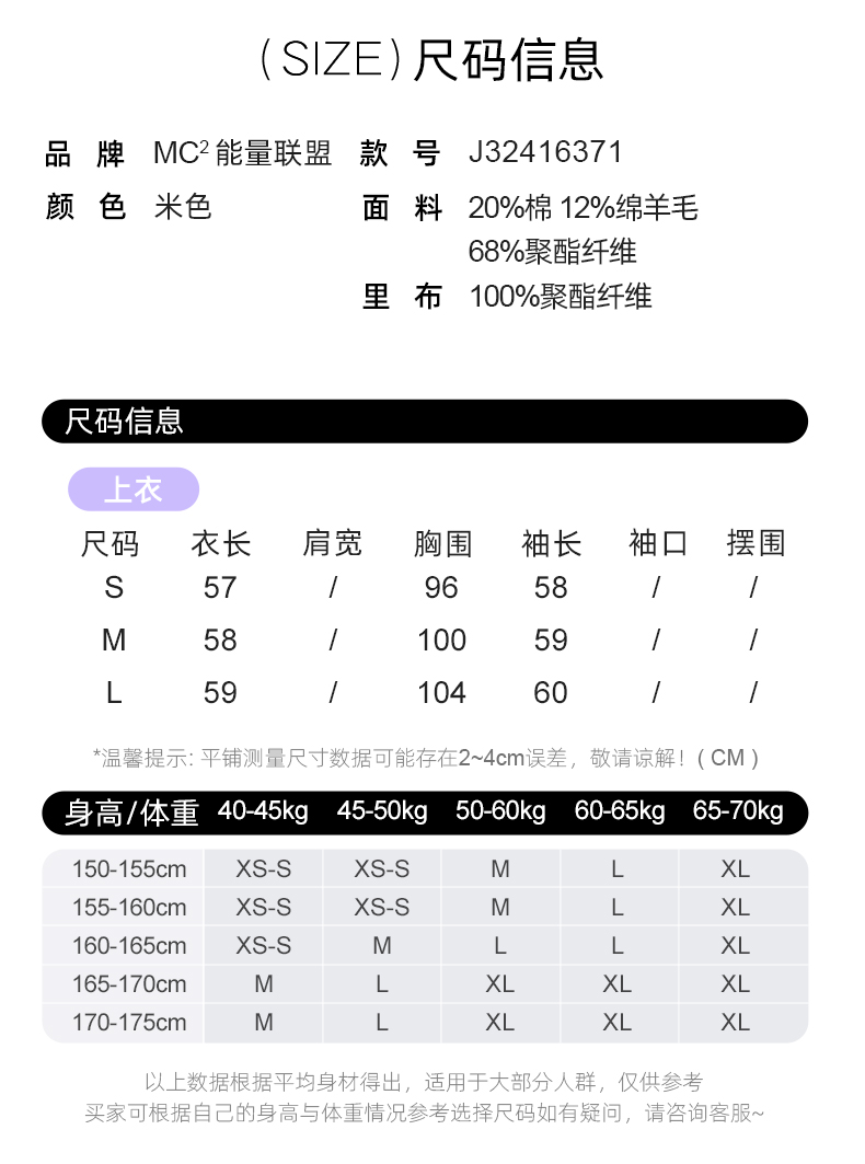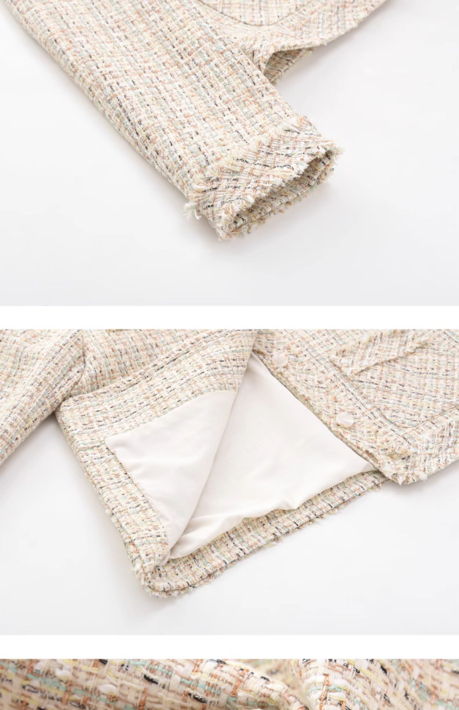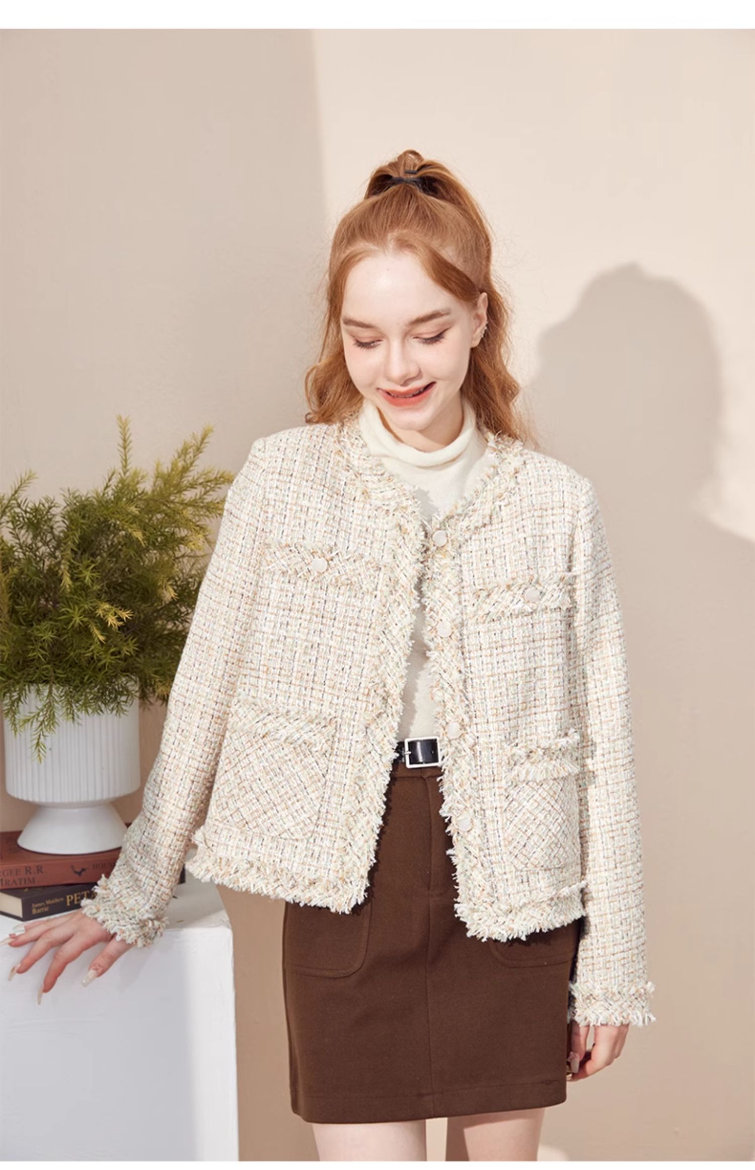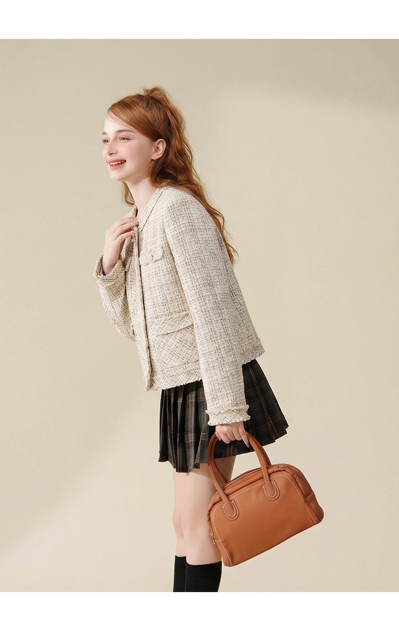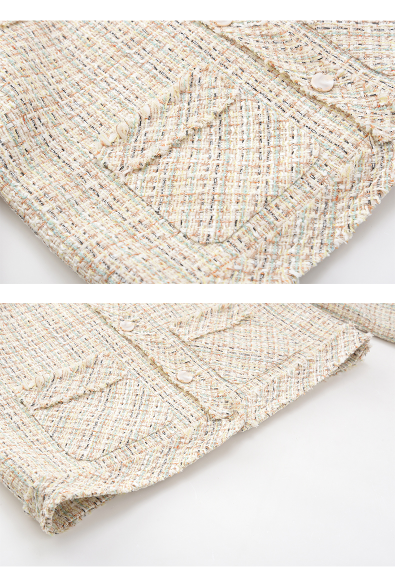 法式气质款显瘦圆领毛边拼接粗花呢小香风外套J3241637