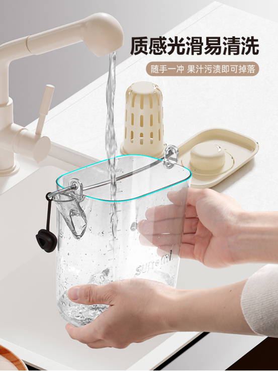 PET+ABS材质,可以直接与食物接触,45°壶口设计,倒水顺畅,顺时针锁盖,逆时针开盖