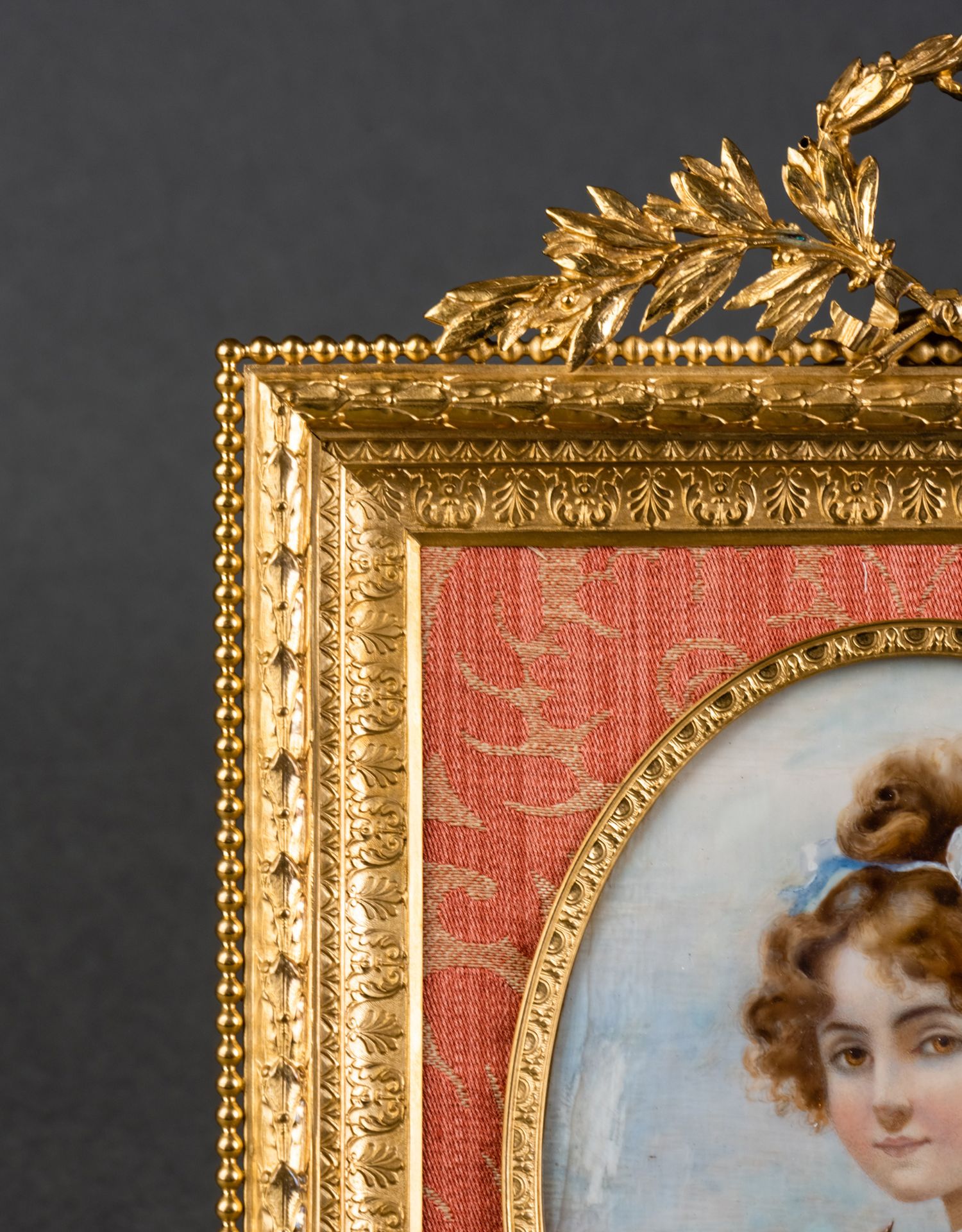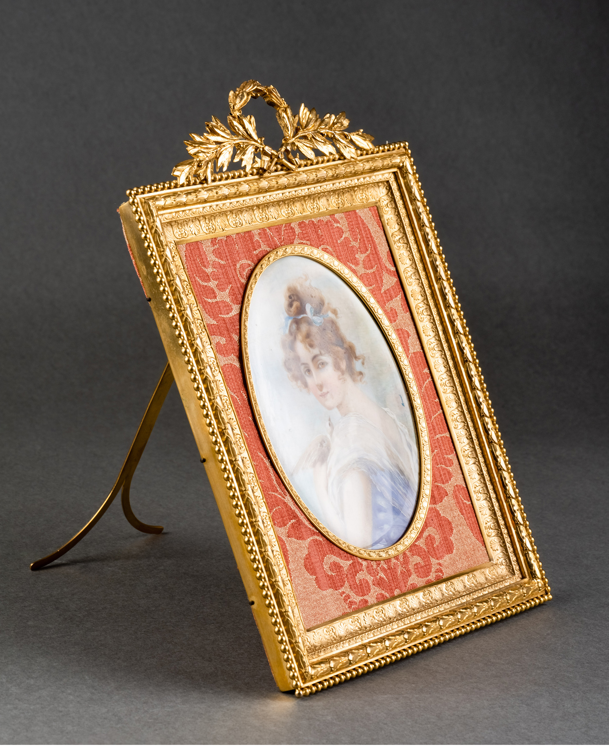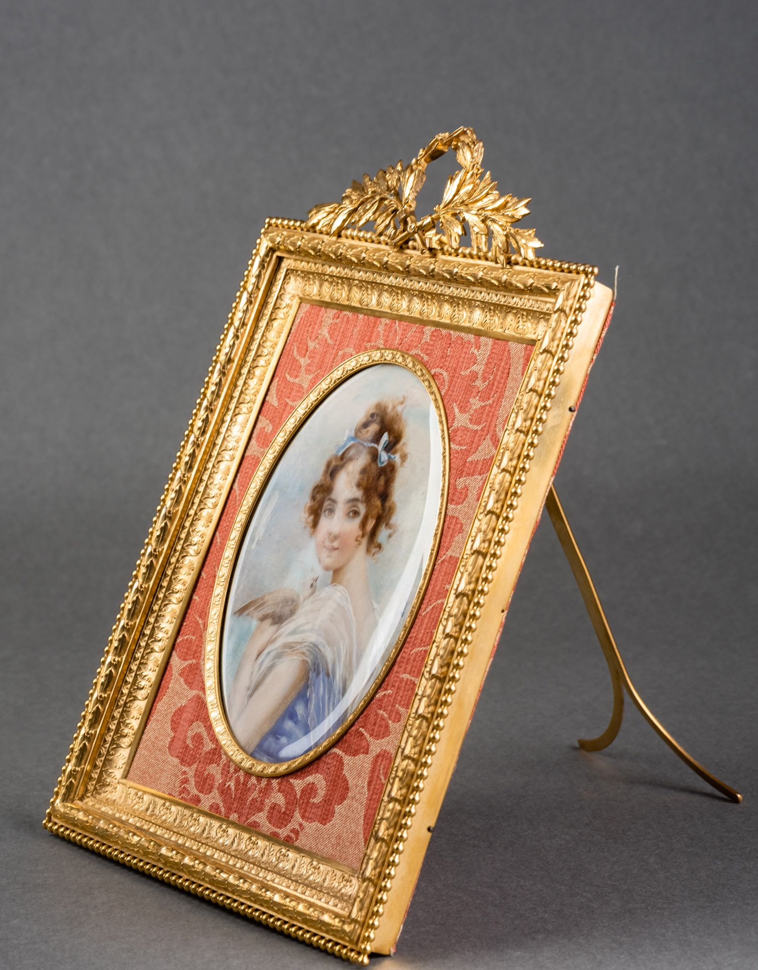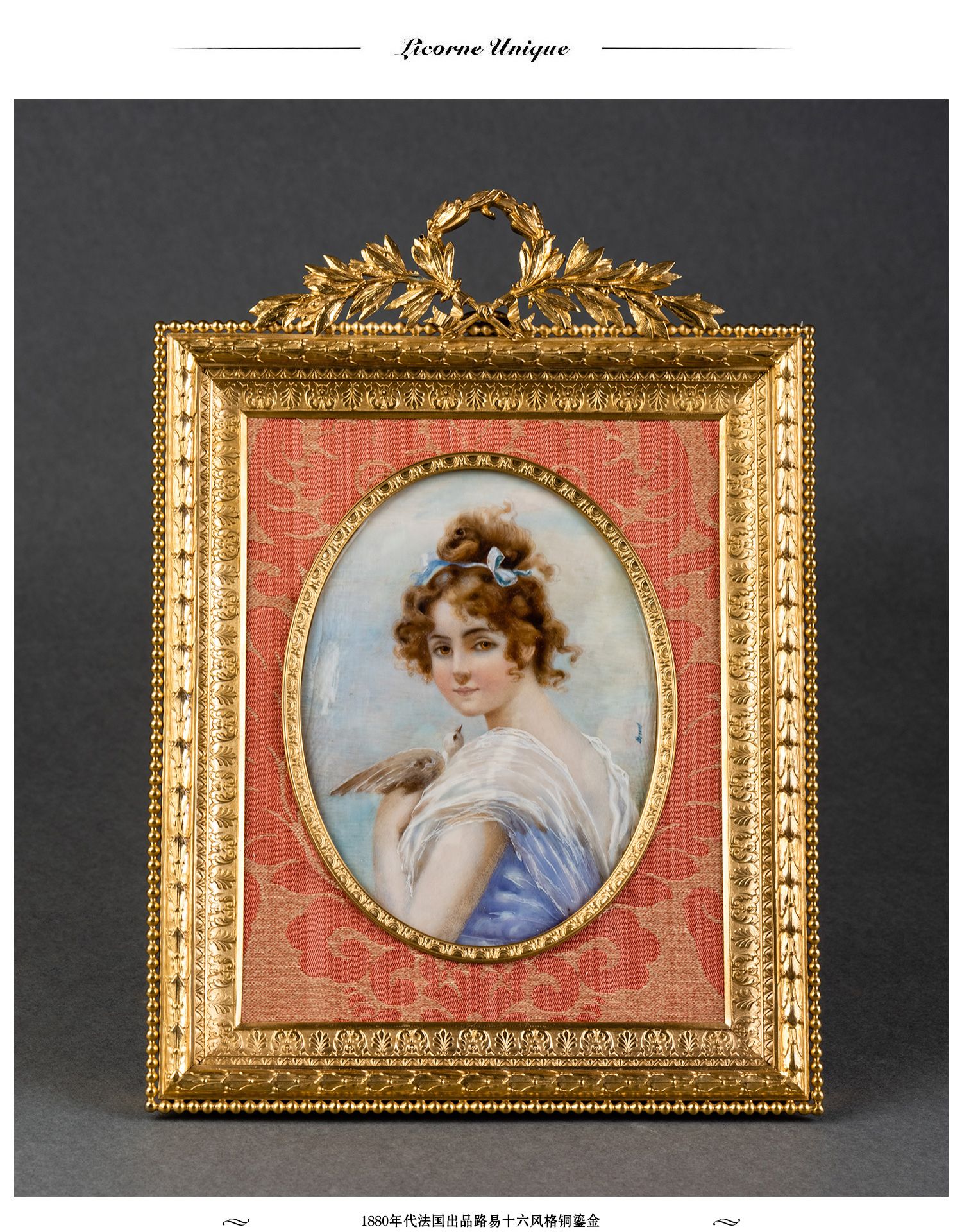 独角鹿西洋古董摆件法国路易十六风铜鎏金相框嵌手绘少女细密画像