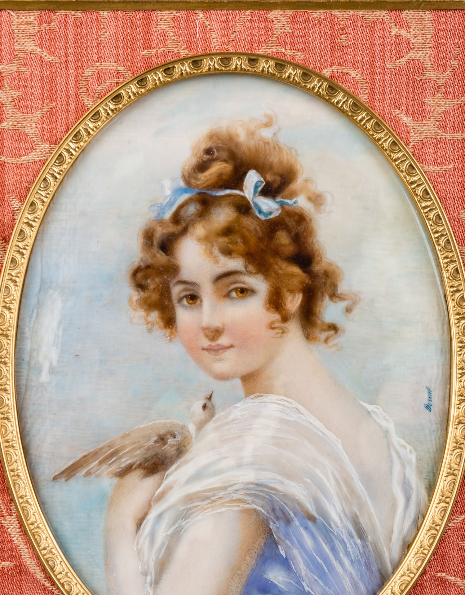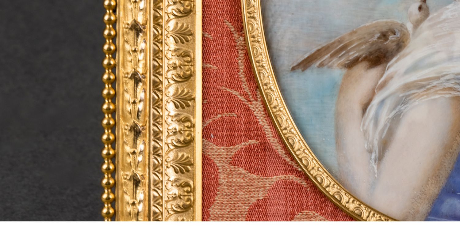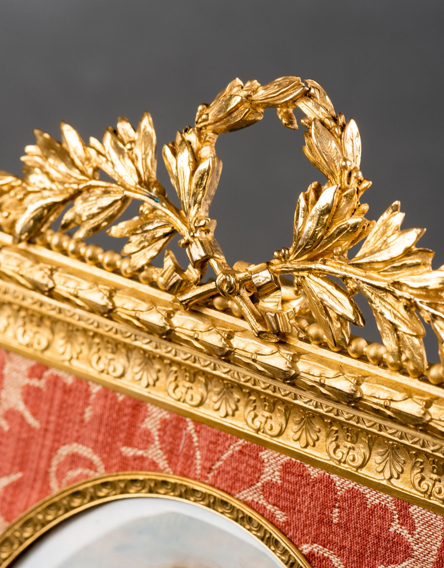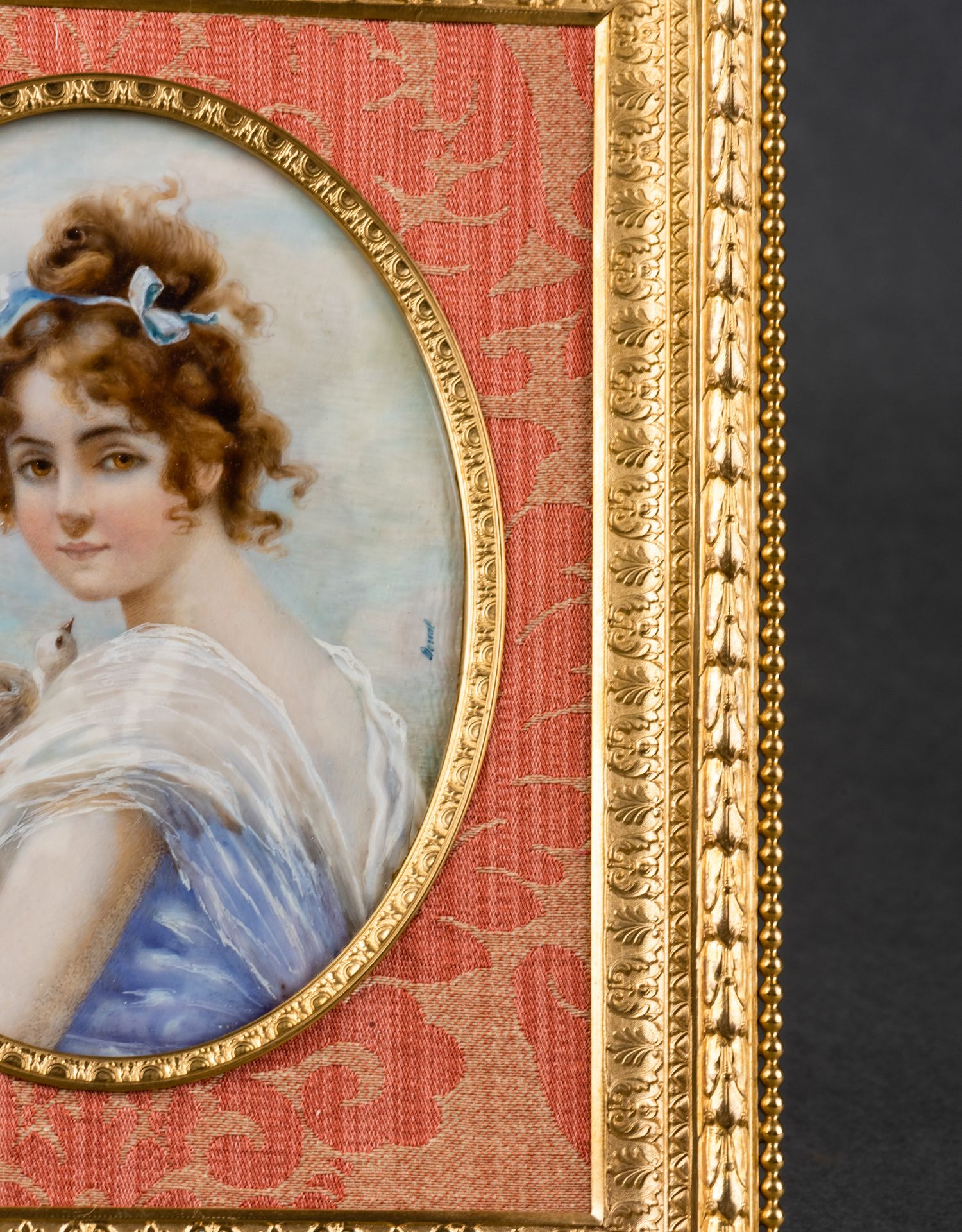 独角鹿西洋古董摆件法国路易十六风铜鎏金相框嵌手绘少女细密画像