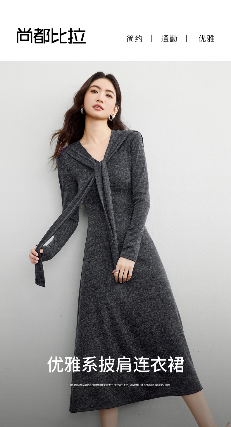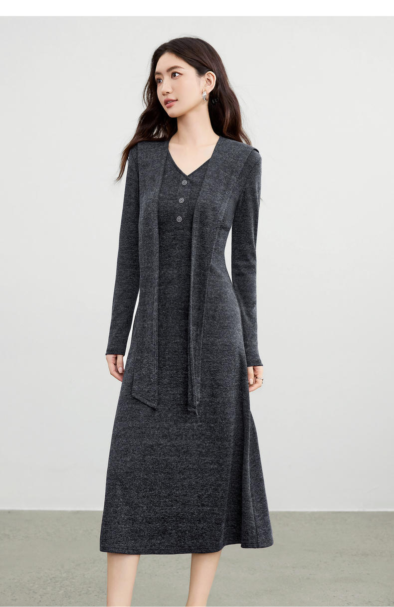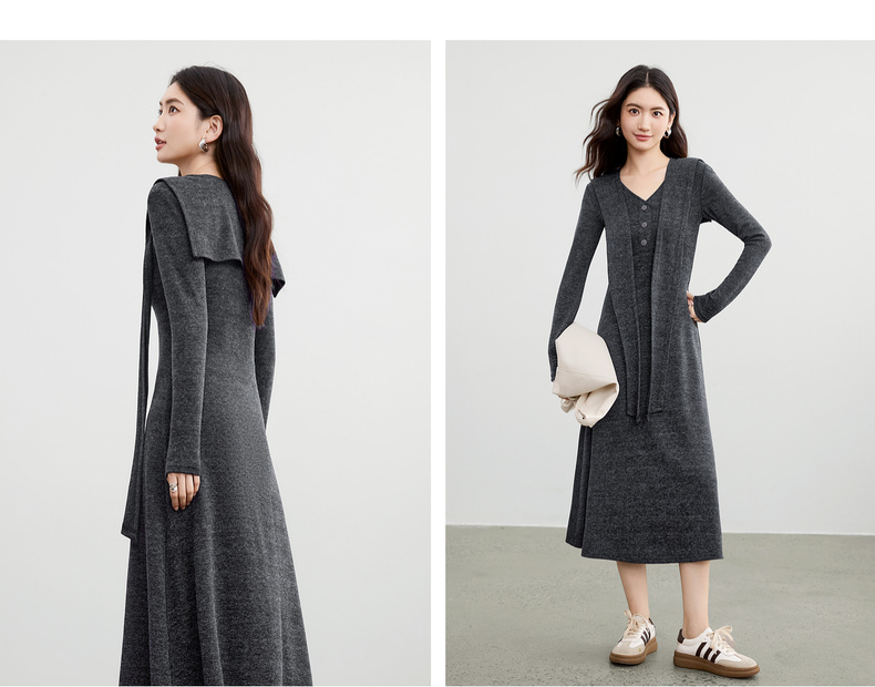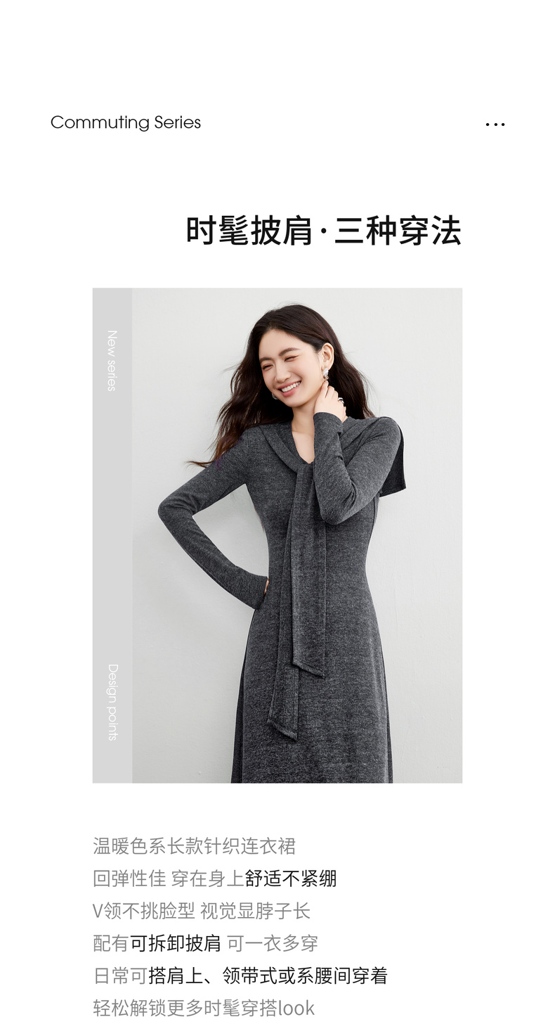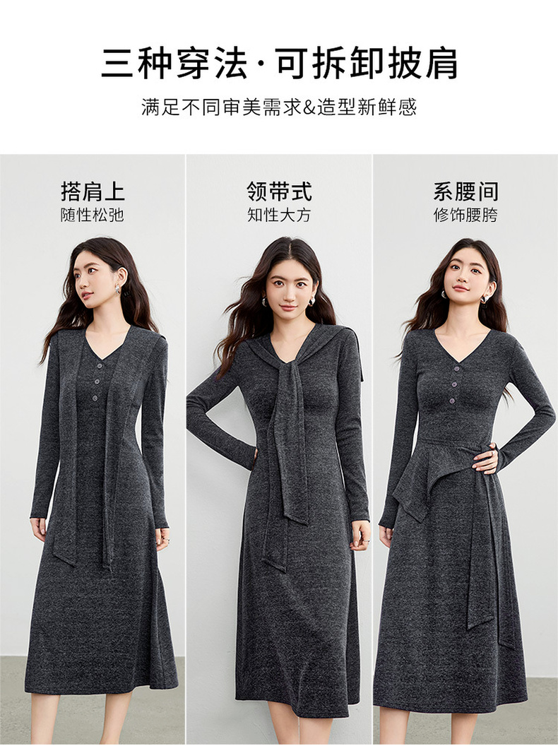 【内购】【三种穿法】通勤V领撞色扣装饰可拆卸披肩弹力针织长款A字连衣裙-153LI3104